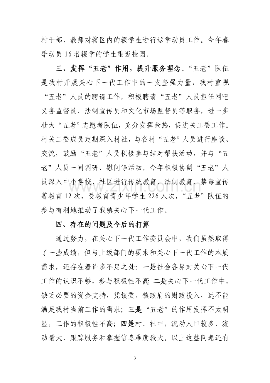 三、发挥“五老”作用,提升服务理念。“五老”队伍是我村开展关心下一代工作中的一支坚强力量,我村重视“五老”人员的聘请工作,积极聘请“五老”人员担任网吧义务监督员、法制宣传员和文化市场监督员等职务,进一步壮大“五老”志愿者队伍,充分发挥余热,促进关工委工作。村关工委成员定期深入村社,与各村“五老”人员进行座谈、交流,鼓励“五老”人员积极参与结对帮扶活动,并与“五老”人员一同调研、慰问等活动。今年积极协调“五老”人员深入中小学校、社区进行传统教育、法制教育、禁毒宣传等教育12次,受教育青少年学生226人次,“五老”队伍的参与有利地推动了我镇关心下一代工作。