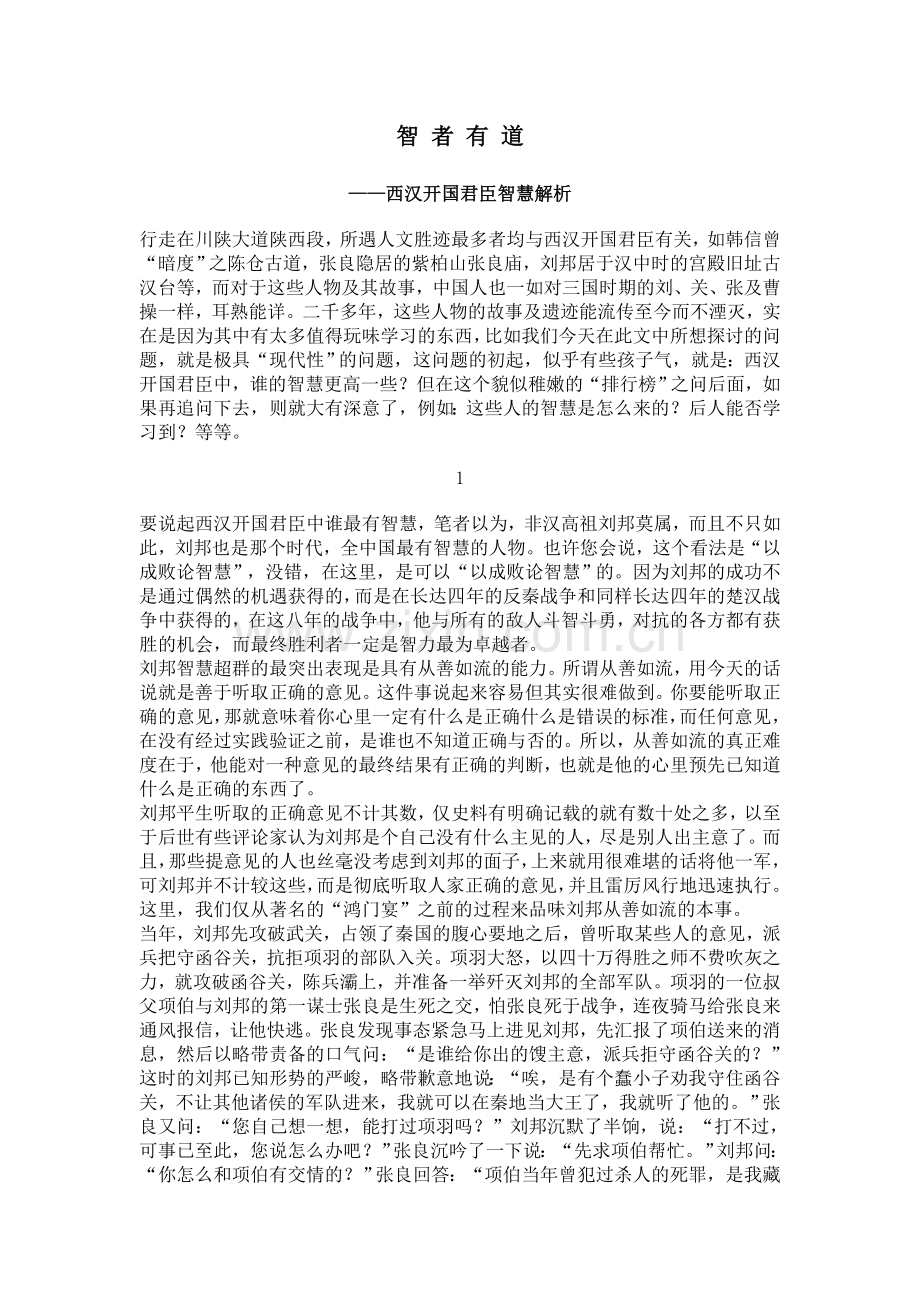 我写这篇文章的第一个出发点就是努力从当时的历史事实理解那些充满智慧的西汉开国君臣,努力廓清后来那些浅薄之人强加给他们的君臣猜忌的瞎话。他们都是智慧超群的人,彼此之间有深刻的互相理解的能力,他们的友谊是基于共同智力水平和相互理解的基础上建立起来的,所以,才能默契配合,创出一番大业来的。如果后人只从狭隘的互相猜忌的角度去理解这些人,那么也只能办出更为狭促弊巴的事情,离伟大的境界远矣。