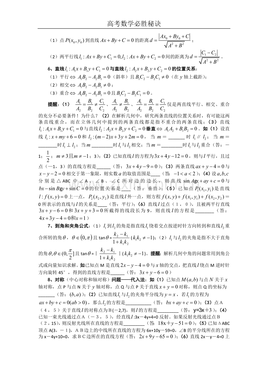 7、到角和夹角公式:(1)到的角是指直线绕着交点按逆时针方向转到和直线重合所转的角,且tan=();(2)与的夹角是指不大于直角的角且tan=︱︱()。提醒:解析几何中角的问题常用到角公式或向量知识求解。如已知点M是直线与轴的交点,把直线绕点M逆时针方向旋转45°,得到的直线方程是______(答:)