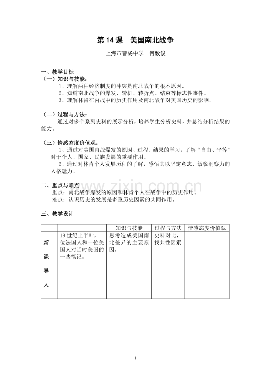 1、 通过对美国内战爆发的原因、过程、结果的学习,了解“自由、平等”对于个人、国家、民族发展的重要作用。