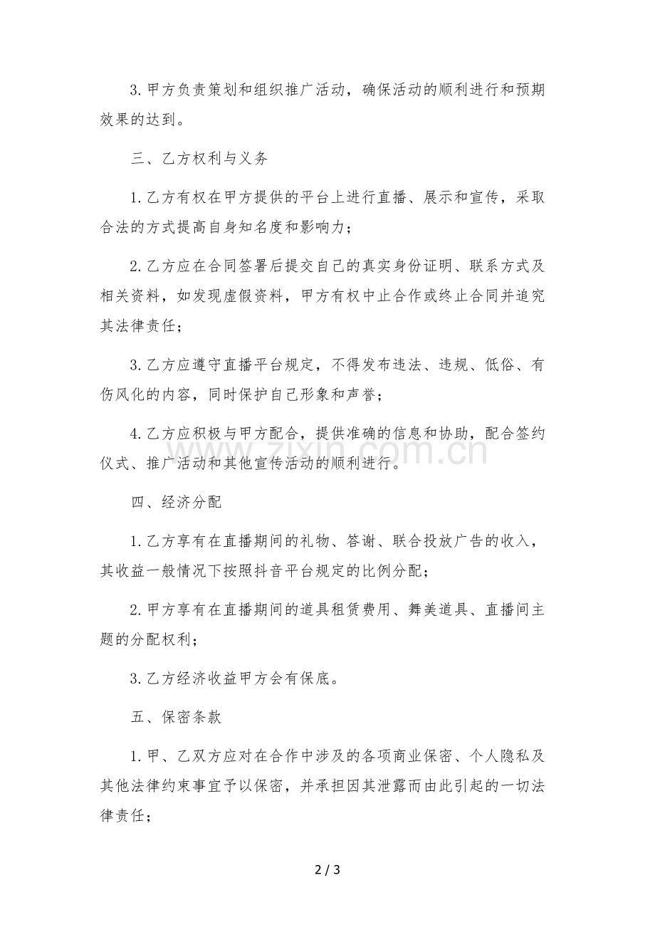 3.乙方应遵守直播平台规定,不得发布违法、违规、低俗、有伤风化的内容,同时保护自己形象和声誉;