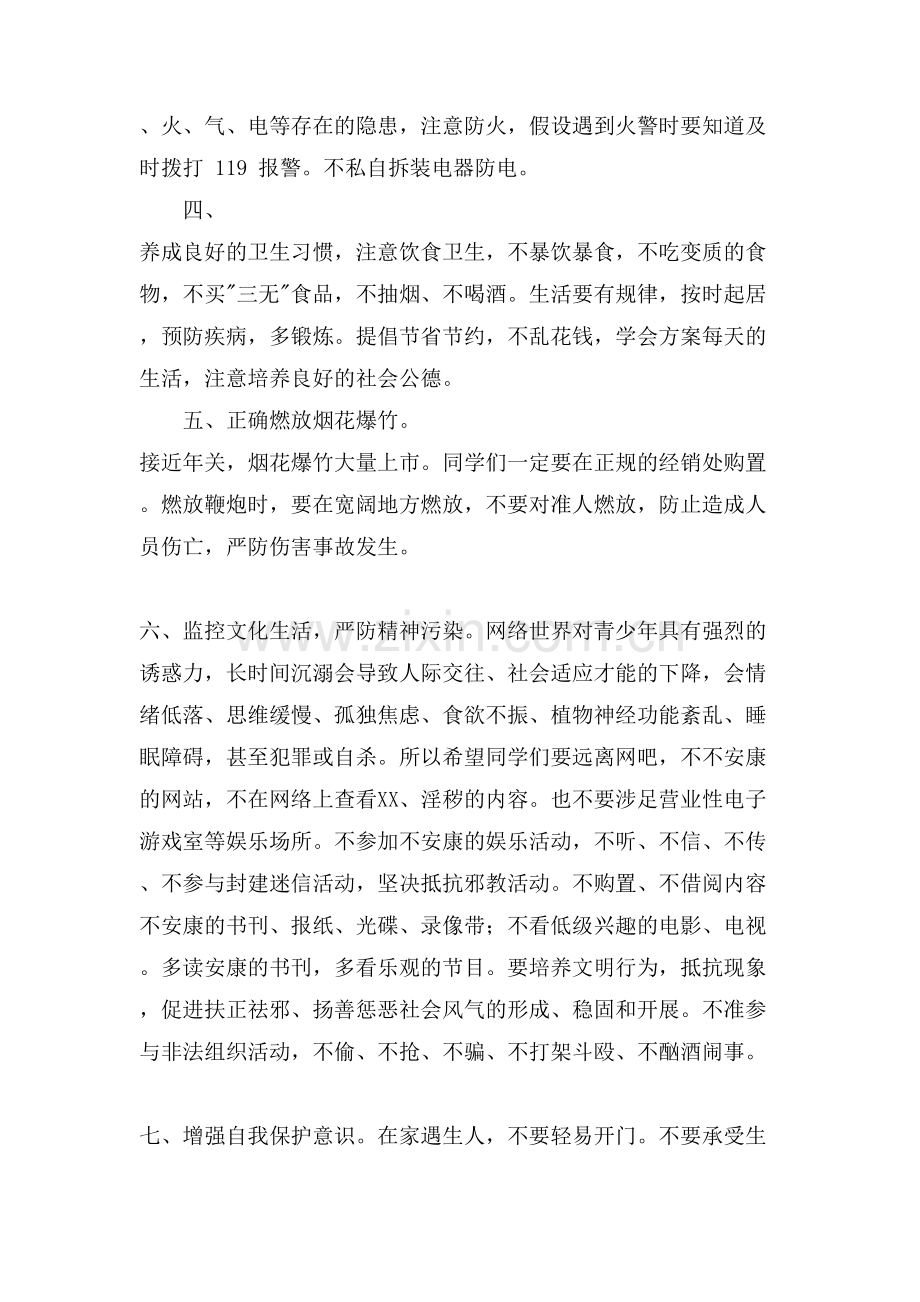 二、注意出行平安。春节是走亲访友的顶峰期,也是各类交通平安事故多发期,希望同学们在寒假期间遵守交通规那么,骑车要在人行道靠右边行使,严禁在路上骑车追逐打闹。注意乘车平安,不乘坐三无车辆。不要到河边、水库、池塘等危险的地方溜冰等。出门必须和家长打招呼,并按时回家。夜晚不得单独出门,更不能在外过夜,彻夜不归。不到施工场地或危险楼房、地段、桥梁玩耍、逗留。不进展不平安的游戏,不到人群密集的场所活动。