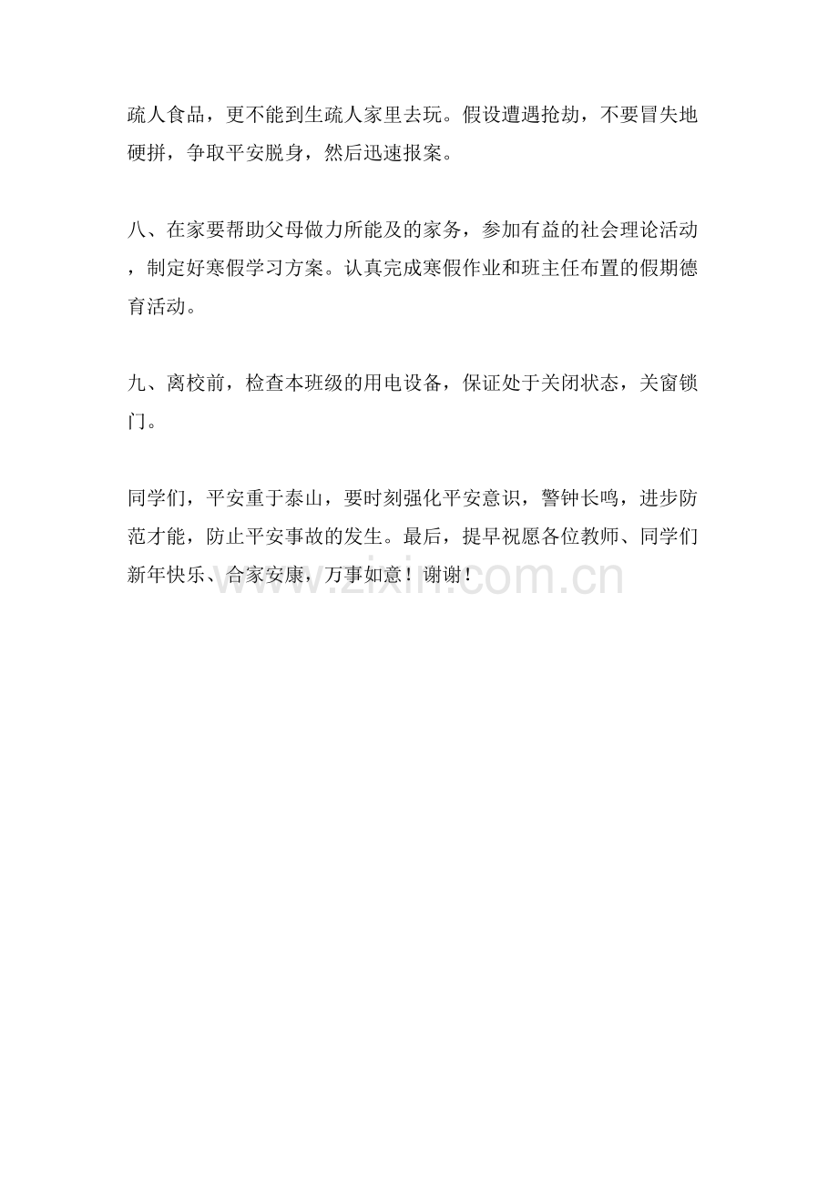 同学们,平安重于泰山,要时刻强化平安意识,警钟长鸣,进步防范才能,防止平安事故的发生。最后,提早祝愿各位教师、同学们新年快乐、合家安康,万事如意!谢谢!