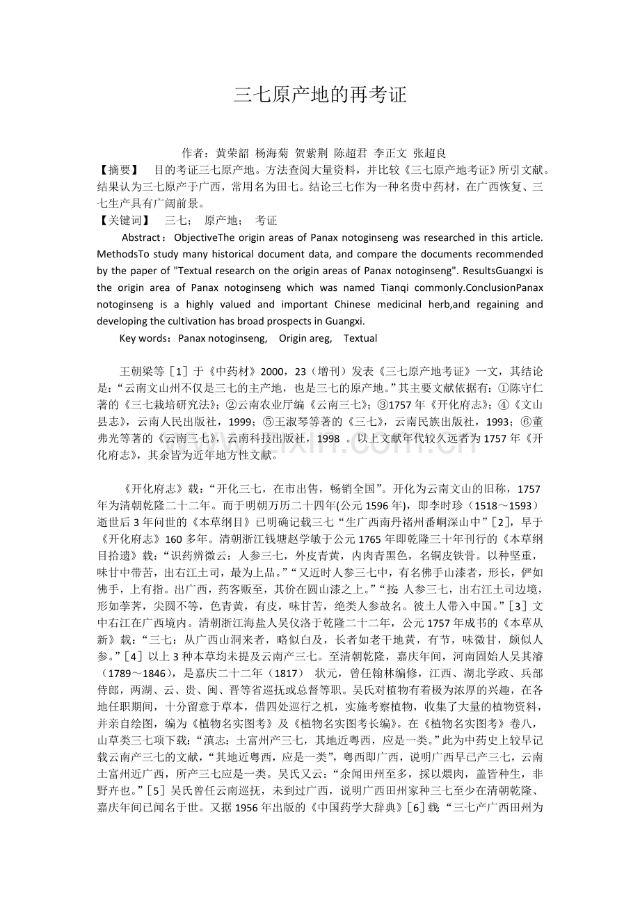 【关键词】 三七; 原产地; 考证
