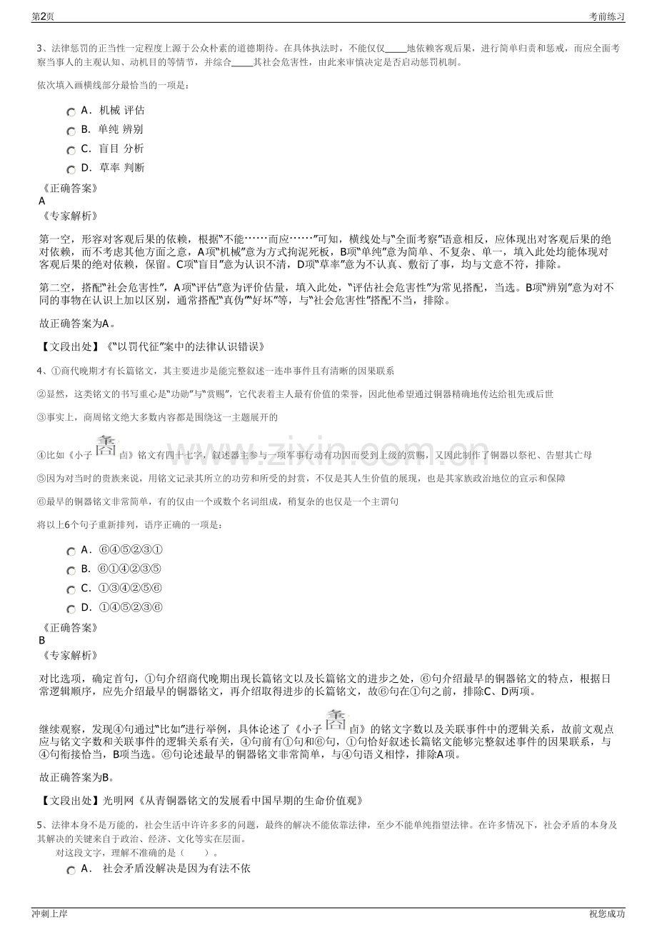 2024年湖南岳阳茂产贸易有限公司招聘笔试冲刺题(带答案解析)【下载须知】:1,本套练习包含以下题型:言语理解与表达题、常识判断题、数量关系题、判断推理题和资料分析题等题型;共135道。2、本套试题根据常见招考题总结归纳,主要用于练习答题思路和拓展知识面。3、本套试题非考试真题,且与湖南岳阳茂产贸易有限公司无关。一、第一部分言语理解与表达(本部分包括表达与理解两方面的内容。请根据题目要求,在四个选项中选出一个最恰当的答案。)1、画者练就一双画眼,大千世界各种形象随时随地、有光有色流过眼前,偶有美感,即刻被这双眼捉住,尽情地痴醉其间,这是何等的快乐。这些快乐感一层层积存心中,闲暇时便一片片翻出来看,这又是何等美妙的享受。时而,浩阔深幽的心底,会悠然浮起一幅画来,它不是那些眼前见过的画面,这才是一幅真正的画!我不过没有时间将它形之于纸,却常常这样完成了绘画所必须的全部思维过程。这段文字意在说明()。A 画家构思的过程 B 艺术创作过程的快乐 C 好画诞生的过程 D 艺术品是内心世界的形象正确答案D专家解析文段讲述了画家有着一双画眼,能捕捉到许多美的画面,并沉醉在享受美感的快乐之中。这些快乐感慢慢地在心中积淀,并逐渐形成了一幅幅新的、以前从未见过的画面,而这些在画家心底里形成的新的画才是真正的画,即文段意在说明艺术品是艺术家内心世界的形象,是虚构的,用心看到的形象。因此D项正确。2、兵法中说“必胜之术,合变之形,妙在于乘”,强调作战中乘敌之隙的重要性,战场上激烈角逐中,战机从来不是无缘无故就有的,敌之隙不可能轻而易举地得到,它是双方指挥员进行谋略博弈的结果,离不开指挥员发挥主观能动性去创造,离不开指挥员运用各种手段去促成。信息化战争中,要充分运用谋略,善用战术技术手段,灵活运用隐真示假、声东击西等方法,诱惑敌人产生错觉,从而产生部署失误、行动失当等“隙”,使有准备之敌变成毫无准备之敌、使集中之敌成为分散之敌、使占地利之敌变成运动之敌、使士气旺盛之敌变成士气低落之敌、使难打之敌变成好打之敌,并伺机击敌,达成作战胜利。最适合做这段文字标题的是:A科学预见,敢于乘敌之隙 B沉着冷静,精于辨敌之隙 C运用谋略,善于察敌之隙 D主动作为,工于造敌之隙正确答案D专家解析文段开篇首先引用兵法中的名言,意在强调作战中乘敌之隙的重要性,也就是要善于把握和运用战机,接着指出战场上战机的获得,离不开指挥员的主观能动性,是指挥员主动创造出来的,然后具体论述在信息化战争中,如何通过发挥主观能动性来制造战机,从而获得最终的胜利,所以文段重在强调指挥员主观能动性的发挥对于获得战机的重要性,对应D项。A项,“科学预见”重在强调根据事物的发展规律,对将来进行预料,文段并未提及,无中生有,排除;B项,“沉着冷静”重在强调从容不迫,稳重镇定的态度,文段并未提及,无中生有,排除;C项,“运用谋略”对应后文解释说明的内容,且表述片面,排除。故正确答案为D。【文段出处】战场指挥要善于乘敌之隙,把握战机方能出奇制胜第1页考前练习冲刺上岸祝您成功3、法律惩罚的正当性一定程度上源于公众朴素的道德期待。在具体执法时,不能仅仅 地依赖客观后果,进行简单归责和惩戒,而应全面考察当事人的主观认知、动机目的等情节,并综合 其社会危害性,由此来审慎决定是否启动惩罚机制。依次填入画横线部分最恰当的一项是:A机械 评估 B单纯 辨别 C盲目 分析 D草率 判断正确答案A专家解析第一空,形容对客观后果的依赖,根据“不能而应”可知,横线处与“全面考察”语意相反,应体现出对客观后果的绝对依赖,而不考虑其他方面之意,A项“机械”意为方式拘泥死板,B项“单纯”意为简单、不复杂、单一,填入此处均能体现对客观后果的绝对依赖,保留。C项“盲目”意为认识不清,D项“草率”意为不认真、敷衍了事,均与文意不符,排除。第二空,搭配“社会危害性”,A项“评估”意为评价估量,填入此处,“评估社会危害性”为常见搭配,当选。B项“辨别”意为对不同的事物在认识上加以区别,通常搭配“真伪”“好坏”等,与“社会危害性”搭配不当,排除。故正确答案为A。【文段出处】“以罚代征”案中的法律认识错误4、商代晚期才有长篇铭文,其主要进步是能完整叙述一连串事件且有清晰的因果联系显然,这类铭文的书写重心是“功勋”与“赏赐”,它代表着主人最有价值的荣誉,因此他希望通过铜器精确地传达给祖先或后世事实上,商周铭文绝大多数内容都是围绕这一主题展开的比如小子卣铭文有四十七字,叙述器主参与一项军事行动有功因而受到上级的赏赐,又因此制作了铜器以祭祀、告慰其亡母因为对当时的贵族来说,用铭文记录其所立的功劳和所受的封赏,不仅是其人生价值的展现,也是其家族政治地位的宣示和保障最早的铜器铭文非常简单,有的仅由一个或数个名词组成,稍复杂的也仅是一个主谓句将以上6个句子重新排列,语序正确的一项是:A B C D正确答案B专家解析对比选项,确定首句,句介绍商代晚期出现长篇铭文以及长篇铭文的进步之处,句介绍最早的铜器铭文的特点,根据日常逻辑顺序,应先介绍最早的铜器铭文,再介绍取得进步的长篇铭文,故句在句之前,排除C、D两项。继续观察,发现句通