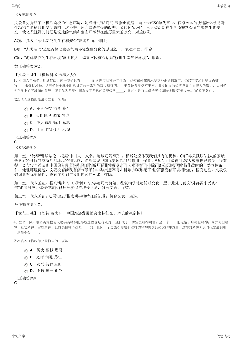 2024年陕西涌鑫矿业有限责任公司招聘笔试冲刺题(带答案解析)【下载须知】:1,本套练习包含以下题型:言语理解与表达题、常识判断题、数量关系题、判断推理题和资料分析题等题型;共135道。2、本套试题根据常见招考题总结归纳,主要用于练习答题思路和拓展知识面。3、本套试题非考试真题,且与陕西涌鑫矿业有限责任公司无关。一、第一部分言语理解与表达(本部分包括表达与理解两方面的内容。请根据题目要求,在四个选项中选出一个最恰当的答案。)1、商标是产品跨入市场的敲门砖,在行业竞争激烈的市场上,市场主体为了在竞争者中 ,往往倾向于选择能够彰显个性、标新立异的标识作为商标。然而,如果一味追求个性、博公众眼球,效果可能 。一旦触碰公共秩序和良善风俗底线,就会遭遇商标注册申请被驳回的尴尬境遇。依次填入画横线部分最恰当的一项是:A一马当先 大打折扣 B一鸣惊人 事与愿违 C拔得头筹 过犹不及 D独树一帜 适得其反正确答案D专家解析第一空,由后文“选择能够彰显个性、标新立异的标识作为商标”可知,横线处需体现市场主体想要突显自己有个性,与一般竞争者不同之意。D项“独树一帜”比喻创造出独特的风格、主张,自成一家,能够体现独特之意,符合文意,保留。A项“一马当先”比喻带头,领先,B项“一鸣惊人”比喻平日默默无闻的人,突然获得优异成绩,从而引起人们的惊异,C项“拔得头筹”比喻取得了第一个出场比赛资格,均无法体现与其他竞争者不同,与文意不符,排除。第二空,代入验证,搭配“效果”,且根据后文“就会遭遇商标注册申请被驳回的尴尬境遇”可知,横线处应体现做过头了,就会产生与之前相反的效果,D项“适得其反”比喻恰恰得到与愿望相反的结果,搭配恰当且与文意相符,当选。故正确答案为D。【文段出处】商标注册勿踩“不良影响”禁区2、受大西洋暖流影响,北极气候环境比较适于生物生存,无论是在陆地还是海洋,都有多种多样的高等植物和动物;南极虽然是全球最冷、风最猛烈的地方,几乎没有高等植物,但海洋生物非常丰富。然而自上世纪50年代至今,两极冰盖的快速融化对野生动物自然栖息地产生很大影响。如果气候变化速率超过野生动物适应新气候条件或迁徙的速率,物种将面临灭绝。冰盖的快速消融不仅给野生动植物带来威胁,还会造成气候的改变。此外,微塑料在两极冰雪中的发现,意味着人类活动已经对两极地区生态环境产生了深刻影响。相比大型塑料,粒径小于5毫米的微塑料不易清理,危害海洋生物安全,需要几百年时间才能降解。这段文字针对的主要问题是:A气候和人类活动的变化危及了极地动物的生存和安全 B人类活动严重破坏了两极地区的原有生态环境和气候 C多重因素致使海洋动物的生存环境不断恶化难以恢复 D自然和人为因素导致极地气候生态环境经历巨大挑战正确答案D第1页考前练习冲刺上岸祝您成功专家解析文段首先介绍了北极和南极的生态环境,随后通过“然而”引导指出问题,自上世纪50年代至今,两极冰盖的快速融化使得野生动物自然栖息地受到影响,这种变化还会造成气候的改变,又通过“此外”引出人类活动产生的微塑料会危害海洋生物安全,故文段强调的问题是极地的气候和生态环境都在经历巨大的改变,对应D项。A项,“危及了极地动物的生存和安全”表述片面,排除;B项,“人类活动”是使得极地生态气候环境发生变化的原因之一,表述片面,排除;C项,“海洋动物的生存环境”范围扩大,偏离文段核心话题“极地生态气候环境”,排除。故正确答案为D。【文段出处】极地科考 造福人类3、中国人口众多,地域辽阔,使得我们具有 的内需市场和分工体系,即使在外部需求受到冲击的情况下,仍然可能通过增加内部的 来保持增长,这已经被全球金融危机后的一系列的事实所证明。由于各地发展仍不平衡,很多地方的经济发展具有很大的潜力,大国经济发展上的区域间的差异,既是作为发展中国家尚不发达的重要经济 ,同时也是可以保持更长期持续增长“梯度效应”的重要条件。依次填入画横线处最恰当的一项是:A不可多得 消费 特征 B天时地利 调节 特点 C得天独厚 循环 标志 D无可比拟 供给 标识正确答案C专家解析第一空,“使得”引导结论,根据“中国人口众多,地域辽阔”可知,横线处应体现我们具有的优势,C项“得天独厚”指人的禀赋等素质特别优异或所处的环境特别优越,能够体现中国优势所起到的作用,保留。A项“不可多得”形容人或事物很稀少、很难得,文段没有涉及到中国的内需市场和分工体系是否非常稀少,与文意不符,排除;B项“天时地利”指作战时的自然气候条件、地理环境优越,文段没有涉及自然气候条件,与文意不符,排除;D项“无可比拟”指没有可以相比的,程度过重,文段仅强调具有优势条件,没有涉及到与其他国家的对比,排除。第二空,代入验证,搭配“增加”,C项“循环”指事物周而复始、往复相承地运转或变化,置于此处与前文“外部需求受到冲击”形成对应,体现依靠内循环经济保持增长之意,符合文意,保留。第三空,代入验证,C项“标志”指表明事物特征的记号,符合文意,当选。故正确答案为C。【文段出处】刘伟 蔡志洲:中国经济发展的突出特征在于增长的稳定性4、生命有限,很多英雄模范人物崇高精神的形成过程也是有限的,