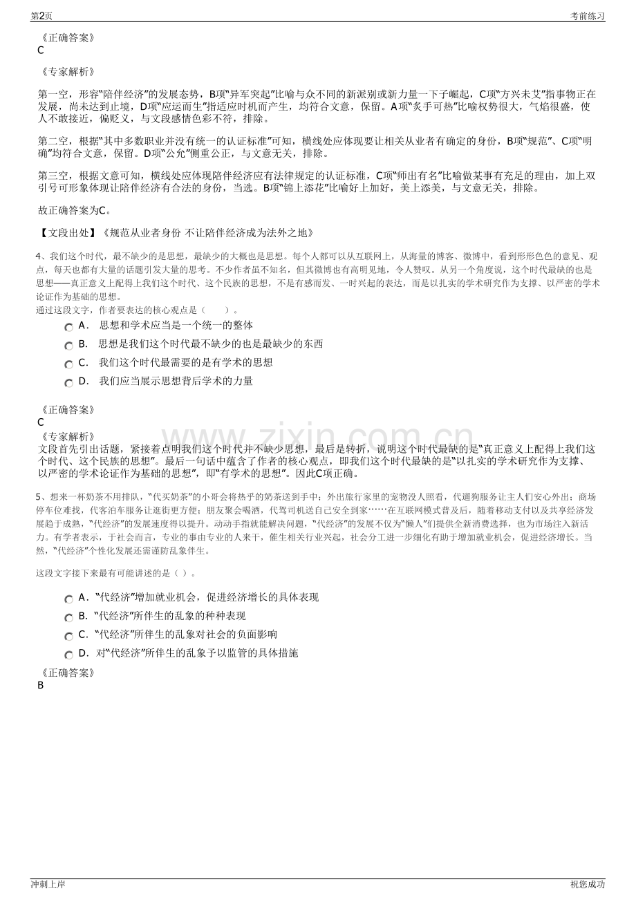 2024年重庆中远海运物流有限公司招聘笔试冲刺题(带答案解析)【下载须知】:1,本套练习包含以下题型:言语理解与表达题、常识判断题、数量关系题、判断推理题和资料分析题等题型;共135道。2、本套试题根据常见招考题总结归纳,主要用于练习答题思路和拓展知识面。3、本套试题非考试真题,且与重庆中远海运物流有限公司无关。一、第一部分言语理解与表达(本部分包括表达与理解两方面的内容。请根据题目要求,在四个选项中选出一个最恰当的答案。)1、一个善于思考、用心思考、有强烈创新欲望的人,哪里都是他产生创新火花和灵感的风水宝地。从某种意义上说,无论创作、创新还是创造,都永远属于那些用心思考、积极思考的人。作为教学一线的课堂也是一个不可忽视的创新场所,有许多知识和学术问题等待人们去研究,这里应该成为科技创新的不竭源泉。这段文字意在说明()。A 课堂也可以成为创新的重要场所 B 教师应在课堂上注重创新人才的培养 C 善于思考的人才能产生创新的火花 D 课堂教学既要传授知识也要培养创新思维正确答案A专家解析文段首先引出“创新”和“灵感”的话题,为后文描写做铺垫;接着指出创新和创造永远属于“那些用心思考、积极思考的人”;最后总结论述“课堂也是一个不可忽视的创新场所”。意在说明由于课堂上人们用心思考、积极思考,也可以成为“创新的重要场所”。因此A项正确。2、判断下列句子使用的修辞手法,正确的一项是()。(1)我到了自家的房外,我的母亲早已迎着出来了,接着便飞出了八岁的侄儿宏儿。(2)在这里,蓝天明月,秃顶的山,单调的黄土,浅濑的水,似乎都是最恰当不过的背景,无可更换。(3)微风过处,送来缕缕清香,仿佛远处高楼上渺茫的歌声似的。(4)宝剑锋从磨砺出,梅花香自苦寒来。A 比拟比喻比喻对偶 B 夸张排比通感对仗 C 比拟排比通感对偶 D 夸张比喻比喻对仗正确答案C专家解析(1)句,由“飞出了”可知,此句采用了拟物的手法。(2)句,“秃顶的山,单调的黄土,浅濑的水”采用了排比的手法。(3)句,把无声的嗅觉变为美妙的听觉,令人神往,为通感的手法。(4)句,为对偶。因此C项正确。3、陪伴经济 ,其中多数职业并没有统一的认证标准,由此使得消费者更像是在“开盲盒”、碰运气。要保护这片“蓝海”,就不能使其沦为法外之地。在强化联合监管、提高违法成本的同时,是时候给陪伴经济中的相关从业者提供一个 的身份了让陪伴经济“”,有助于将其纳入法制化的轨道上运行,这是保障供求双方权益的基础,也是维护行业健康发展的关键。依次填入画横线部分最恰当的一项是:A炙手可热 标准 登堂入室 B异军突起 规范 锦上添花 C方兴未艾 明确 师出有名 D应运而生 公允 千帆竞发第1页考前练习冲刺上岸祝您成功正确答案C专家解析第一空,形容“陪伴经济”的发展态势,B项“异军突起”比喻与众不同的新派别或新力量一下子崛起,C项“方兴未艾”指事物正在发展,尚未达到止境,D项“应运而生”指适应时机而产生,均符合文意,保留。A项“炙手可热”比喻权势很大,气焰很盛,使人不敢接近,偏贬义,与文段感情色彩不符,排除。第二空,根据“其中多数职业并没有统一的认证标准”可知,横线处应体现要让相关从业者有确定的身份,B项“规范”、C项“明确”均符合文意,保留。D项“公允”侧重公正,与文意无关,排除。第三空,根据文意可知,横线处应体现陪伴经济应有法律规定的认证标准,C项“师出有名”比喻做某事有充足的理由,加上双引号可形象体现让陪伴经济有合法的身份,当选。B项“锦上添花”比喻好上加好,美上添美,与文意无关,排除。故正确答案为C。【文段出处】规范从业者身份 不让陪伴经济成为法外之地4、我们这个时代,最不缺少的是思想,最缺少的大概也是思想。每个人都可以从互联网上,从海量的博客、微博中,看到形形色色的意见、观点,每天也都有大量的话题引发大量的思考。不少作者虽不知名,但其微博也有高明见地,令人赞叹。从另一个角度说,这个时代最缺的也是思想真正意义上配得上我们这个时代、这个民族的思想,不是有感而发、一时兴起的表达,而是以扎实的学术研究作为支撑、以严密的学术论证作为基础的思想。通过这段文字,作者要表达的核心观点是()。A 思想和学术应当是一个统一的整体 B 思想是我们这个时代最不缺少的也是最缺少的东西 C 我们这个时代最需要的是有学术的思想 D 我们应当展示思想背后学术的力量正确答案C专家解析文段首先引出话题,紧接着点明我们这个时代并不缺少思想,最后是转折,说明这个时代最缺的是“真正意义上配得上我们这个时代、这个民族的思想”。最后一句话中蕴含了作者的核心观点,即我们这个时代最缺的是“以扎实的学术研究作为支撑、以严密的学术论证作为基础的思想”,即“有学术的思想”。因此C项正确。5、想来一杯奶茶不用排队,“代买奶茶”的小哥会将热乎的奶茶送到手中;外出旅行家里的宠物没人照看,代遛狗服务让主人们安心外出;商场停车位难找,代客泊车服务让逛街更方便;朋友聚会喝酒,代驾司机送自己安全到家在互联网模式普及后,随着移动支付以及共享经济发展趋于成熟,“代经济”的发展速度得以提升。动动手指就能解决问题,“代经济”的发展不仅为“懒人”们提供全新消费选择,
