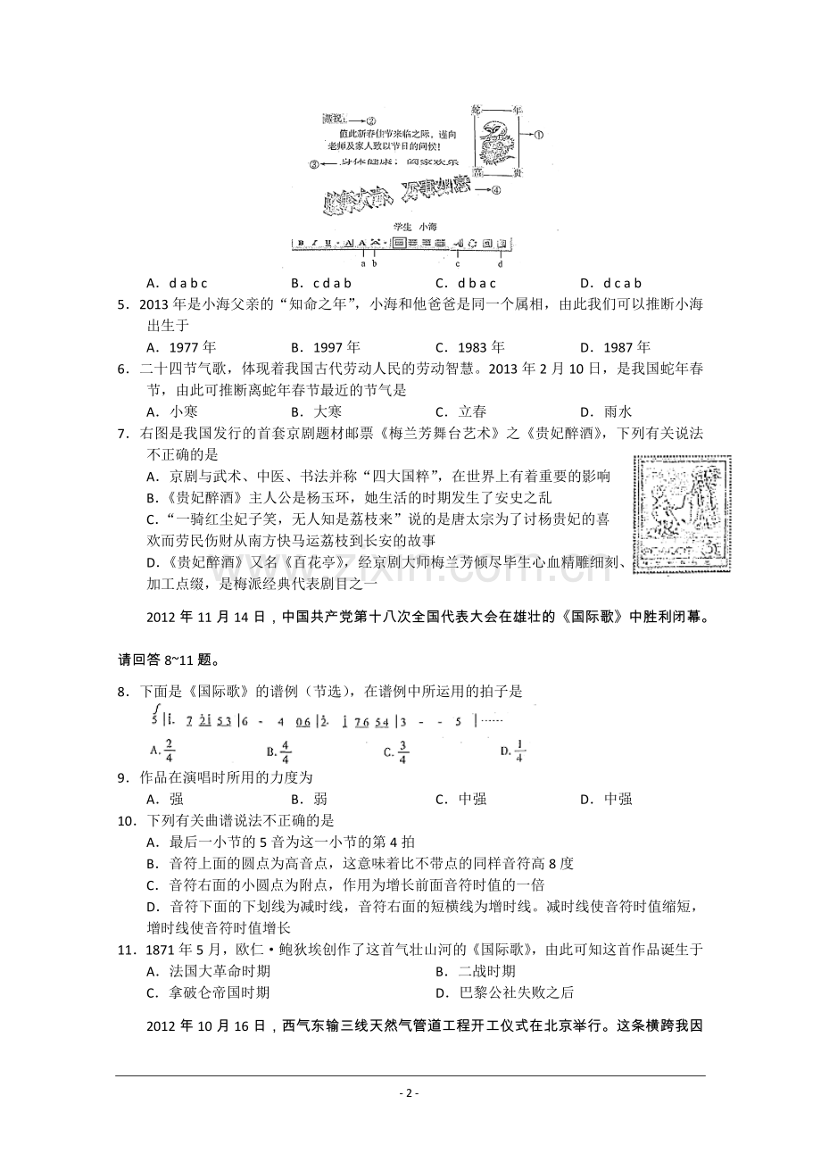 7.右图是我国发行的首套京剧题材邮票《梅兰芳舞台艺术》之《贵妃醉酒》,下列有关说法不正确的是