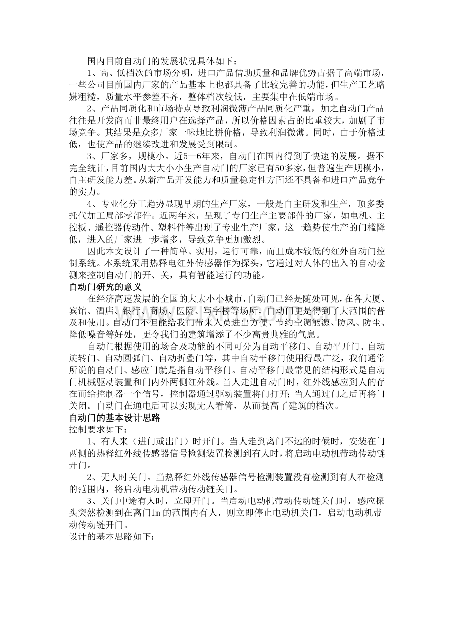 随着社会的飞速发展,自动门逐渐进入我们的日常生活,自动门控制系统也逐渐向大型化、复杂化和智能化的方向发展,成为宾馆、超市、银行等现代建筑所必备,是建筑智能化水平的重要指标之一。它具有美观大方、节约空调能源、防风、防尘,降低噪音等优点。国外的自动门控制系统性能比较优良,但是价格偏高;国内的同类产品价格便宜但是性能较差,故障率较高。