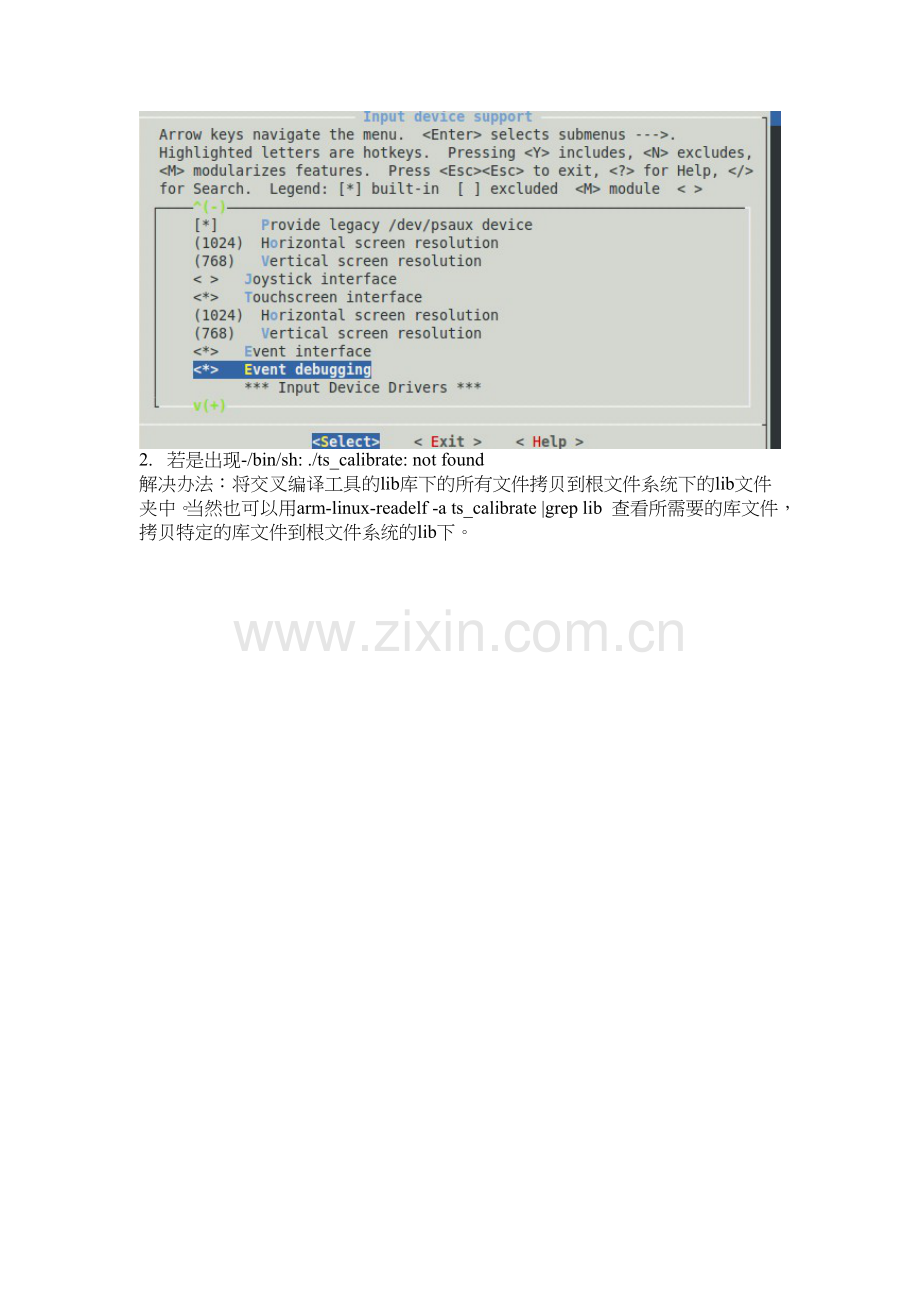 解决办法:将交叉编译工具的lib库下的所有文件拷贝到根文件系统下的lib文件夹中。当然也可以用arm-linux-readelf -a ts_calibrate |grep lib 查看所需要的库文件,拷贝特定的库文件到根文件系统的lib下。
