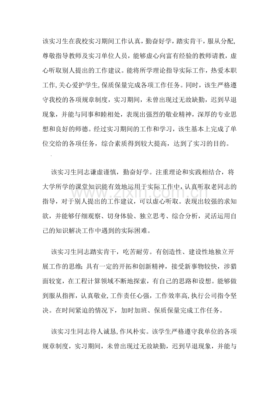 该实习生在我校实习期间工作认真,勤奋好学,踏实肯干,服从分配, 尊敬指导教师及实习单位人员,能够虚心向富有经验的教师请教,虚心听取别人提出的工作建议。能将所学理论指导实际工作,热爱本职工作,关心爱护学生,保质保量完成各项工作任务。同时,该生严格遵守我校的各项规章制度,实习期间,未曾出现过无故缺勤,迟到早退现象,并能与同事和睦相处,表现出强烈的敬业精神,深厚的专业思想和良好的师德。经过实习期间的工作和学习,该生基本上完成了单位交给的各项任务,综合素质得到较大提高,达到了实习的目的。