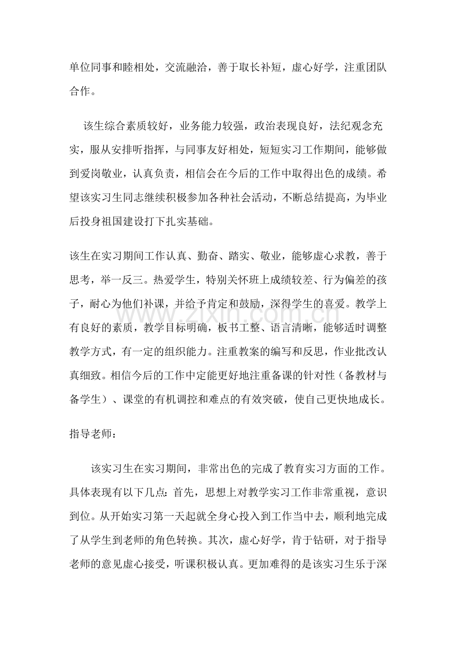 教学实习:表现高度热忱,讲解钜细靡遗,能兼顾不同程度学生的需要,亦能根据学生反应及教师指导调整板书、速度、教学方式、内容……,努力求得学生最大利益。批改作业认真,评语多样、丰富而恳切。上课秩序掌控得宜,收放自如,优秀稳健。发现问题能主动提出讨论,讨论中自然流露极佳学养与见识。 该实习生实习期间认真负责,能独立处理教材,备课完整。课堂教学组织严密,应变能力强,能根据学生反应及教师指导调整板书、内容,教态自然,优秀稳健。批改作业仔细、正确,并能注意学生共同的错误,晚自修期间能下班辅导,具备了一个教师应有的素质。 经验。通过担任助理班主任,使我们认识到班主任工作的重要和辛苦,也了解和积累了一些班主任工作的方法和经验。通过与学生的接触,对现今中学生的思想和观念有了进一步的了解和体会,对今后从事教师工作有很大的帮助。、实习生活的感悟通过近两个月的实习,使我们的理论知识得到检验和应用,进一步完善和提高了教学技能,提高了自身素质,从指导老师身上学到了不少好的教学经验和方法。同时也感受了高中课堂教学的实际状况,引发了我们对新的课程观和教学理念在高中课堂如何贯彻的思考。新课程改革的以学生为本的教育方式给我们很大出动,并深深觉得现代教育需要不仅仅是这样的想法,更需要这样的实践。除了了解本专业课程以外,同学们还与办公室其他老师沟通以了解各学科目前所面临的具体情况,为全面了解当今中学教育状况积累了实际经验。通过担任助理班主任,使我们认识到班主任工作的重要和辛苦,也了解和积累了一些班主任工作的方法和经验。