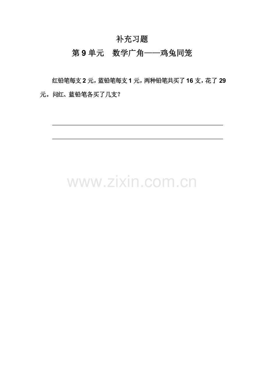 补充习题 第9单元 数学广角——鸡兔同笼 红铅笔每支2元,蓝铅笔每支1元,两种铅笔共买了16支,花了29元。问红、蓝铅笔各买了几支? 答案提示: 答:红铅笔买了13支,蓝铅笔买了3支。 解题思路: 假设16支都是红铅笔,则一共花了2×16=32(元),多花了32-29=3(元)。一支蓝铅笔比一支红铅笔便宜多少元?2-1=1(元),把多出来的3元用蓝铅笔替换红铅笔 3÷1=3(支),则红铅笔16-3=13(支)。