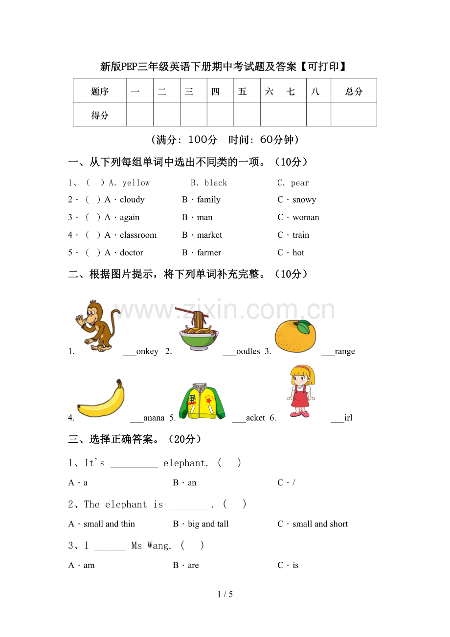 新版PEP三年级英语下册期中考试题及答案【可打印】