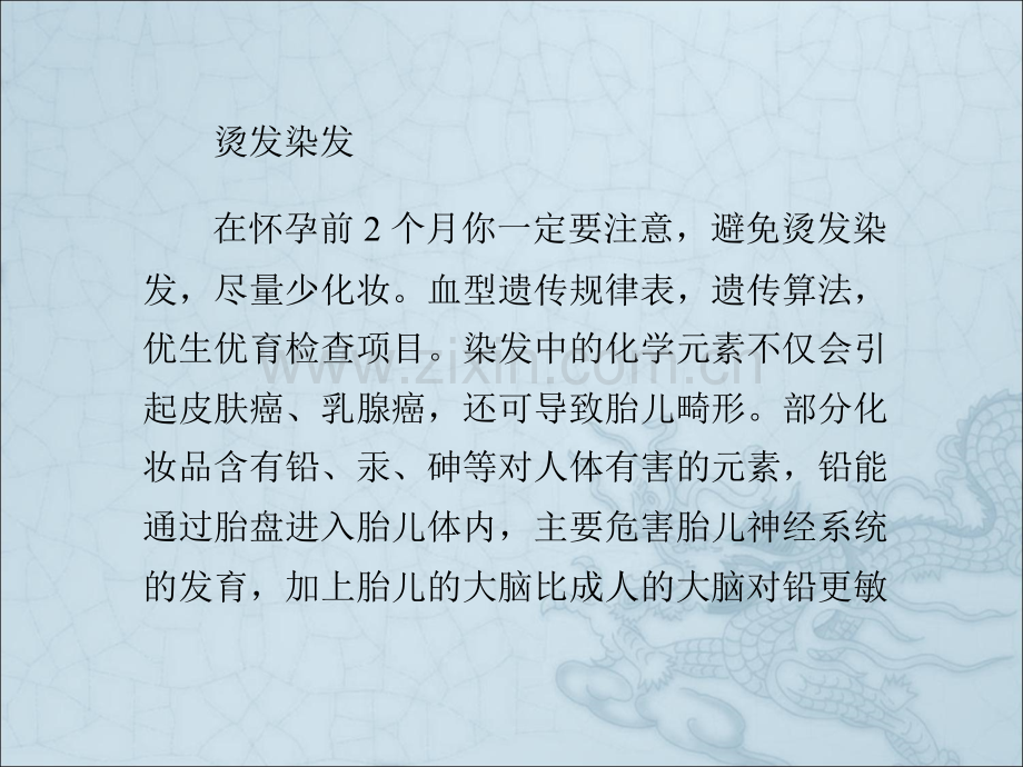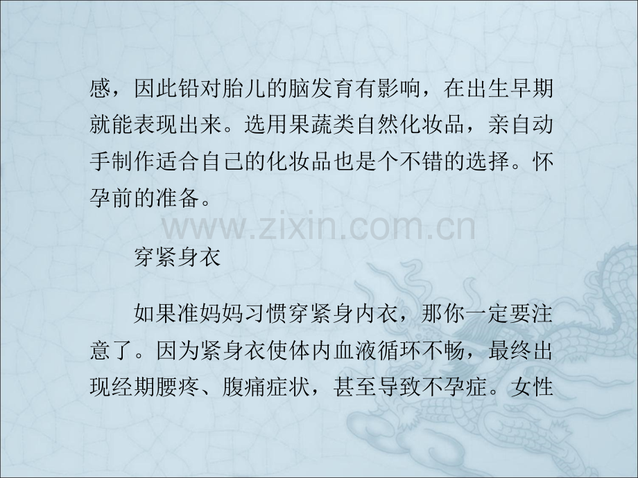 烫发染发在怀孕前 2 个月你一定要注意,避免烫发染发,尽量少化妆。血型遗传规律表,遗传算法,优生优育检查项目。染发中的化学元素不仅会引起皮肤癌、乳腺癌,还可导致胎儿畸形。部分化妆品含有铅、汞、砷等对人体有害的元素,铅能通过胎盘进入胎儿体内,主要危害胎儿神经系统的发育,加上胎儿的大脑比成人的大脑对铅更敏感,因此铅对胎儿的脑发育有影响,在出生早期就能表现出来。选用果蔬类自然化妆品,亲自动手制作适合自己的化妆品也是个不错的选择。怀孕前的准备。穿紧身衣如果准妈妈习惯穿紧身内衣,那你一定要注意了。因为紧身衣使体内血液循环不畅,最终出现经期腰疼、腹痛症状,甚至导致不孕症。女性量好几下才能量到那个遥远的地方。幼稚的我自以为是的想说“其实也不是很远的口、尿道口、肛门靠得很近,内裤穿得太紧,易与外阴、肛门、尿道口产生频繁的摩擦,使肛门、分泌物中的病菌进入或尿道,引起泌尿系统或生殖系统的感染。女性在衣着方面要宽松,以使和腹部保持自然松弛状态为宜,这样有利于生理功能的协调。留胡须准爸爸浓密的胡须能吸附及收容许多灰尘和空气中的污染物,而且容易进入呼吸道和消化道,对精子的内环境不利,而且有可能在与妻子亲热的同时把病菌传染给她。骑自行车作为一种方便快捷的代步工具,自行车一直备受人们喜爱。但你可能还不知道,过多地骑车会影响你的生育能力。调查显示,在 55 名爱好自行车运动的男性中,近 90%的人体内生成的精量好几下才能量到那个遥远的地方。幼稚的我自以为是的想说“其实也不是很远子数量较少,阴囊呈现出反常的迹象。而在 35名很少骑车的男性中,只有 26%的人表现出此类症状。这是因为骑车时身体前倾,腰弯曲度增加,让你的睾丸、前列腺紧贴坐垫而受到挤压。长此以往,会出现缺血、水肿、发炎等症状,影响精子的生成以及前列腺液、精 ye 的正常分泌。再则,骑车过程中身体不停地颠簸和震动,可导致阴囊受损,阻碍精子的酝酿,影响你的孕育计划。为了顺利达成当爸爸的愿望,你还是委屈一下,暂时放弃自行车吧!如果实在需要骑车,每天应把时间控制在 1 个小时以内。热水浴男性的体温直接影响着精子的健康。阴囊是睾丸的“温度调节器”,当环境温度比体温低12时,它才能顺利产生精子。当气温太高时,阴囊会扩大散热面积;而温度降低时,它又会皱起来,以减少散热面积,从而保持阴囊的温量好几下才能量到那个遥远的地方。幼稚的我自以为是的想说“其实也不是很远度比腹腔内低。睾丸产生精子需要比正常体温37低 11.5的环境,不然精子就会夭亡。人体正常的体温是 37,而男性下身悬吊的阴囊体温恒定在 35,随着气温而伸缩,维持男性正常性功能。如果在准爸爸在洗澡的时候,水温过高,可使精子数量减少,甚至导致不育。近年研究的“温热避孕法”根据的就是这个道理。当然,每周 12 次,每次时间不太长的热水浴并没有什么关系。即使你的精子密度原本正常,如果连续 3 天在 4344的温水中浸泡 20 分钟以上,其密度就会下降到 1000 万/毫升以下,并持续 3周如此。穿高跟鞋准妈妈要换下不符合标准的高跟鞋。应选择鞋跟高度为 23 厘米的鞋子,这样有助于胸部和腰部挺起,体现自然曲线。另外要保持高跟鞋和便鞋换着穿,可以使脚得到适当放松,保持走量好几下才能量到那个遥远的地方。幼稚的我自以为是的想说“其实也不是很远路的健美姿态。怀孕后须准备稍大一点的鞋子,因为怀孕后脚会发生水肿。辐射在有怀孕计划后,准爸爸也要审视一下自己的环境。如果岗位接触铅、汞、苯、溴、氨、放射线、电磁波等有害物质,就都应申请暂时调离。这些物质会损伤生殖功能,导致精子异常,受孕后也易导致胎儿畸形、流产、早产等。噪声噪声不仅影响听力,对男性的生育能力也有很大的影响。如果准爸爸长期处于噪声为 7080分贝的环境中,就会产生减弱性功能的趋势,如果噪声高达 90 分贝以上,就会导致性功能发生紊乱,甚至致使精子液化或无法射精。吸烟量好几下才能量到那个遥远的地方。幼稚的我自以为是的想说“其实也不是很远多人都没有料到吸烟和不孕之间有任何关系,其实吸烟对怀孕也有一定影响。医生说,香烟中含有大量烟碱和尼古丁,进入人体后会造成全身血管病变,子宫血管也会因此受到牵连。长期吸烟不但会伤害身体的整个激素系统,影响卵巢功能,导致内分泌失调而引发不孕,还能使女性绝经期提前 23 年,倘若在怀孕早期吸烟还容易导致流产。酒精酒精是生活中常见的致畸剂之一,极易引起人体染色体畸变。女性对酒精的耐受性比男性要低,酒精易集中于滋养胎儿的血液中,造成胎儿酒精症,影响其身体和大脑的发育。酒后受孕是胎儿先天性畸形、先天智力低下等缺陷的主要原因。妊娠的前 3 个月,尤其是 8 周以内,是胎儿器官形成的重要时期,也是致畸敏感期。1cg0f4c7ab 易博