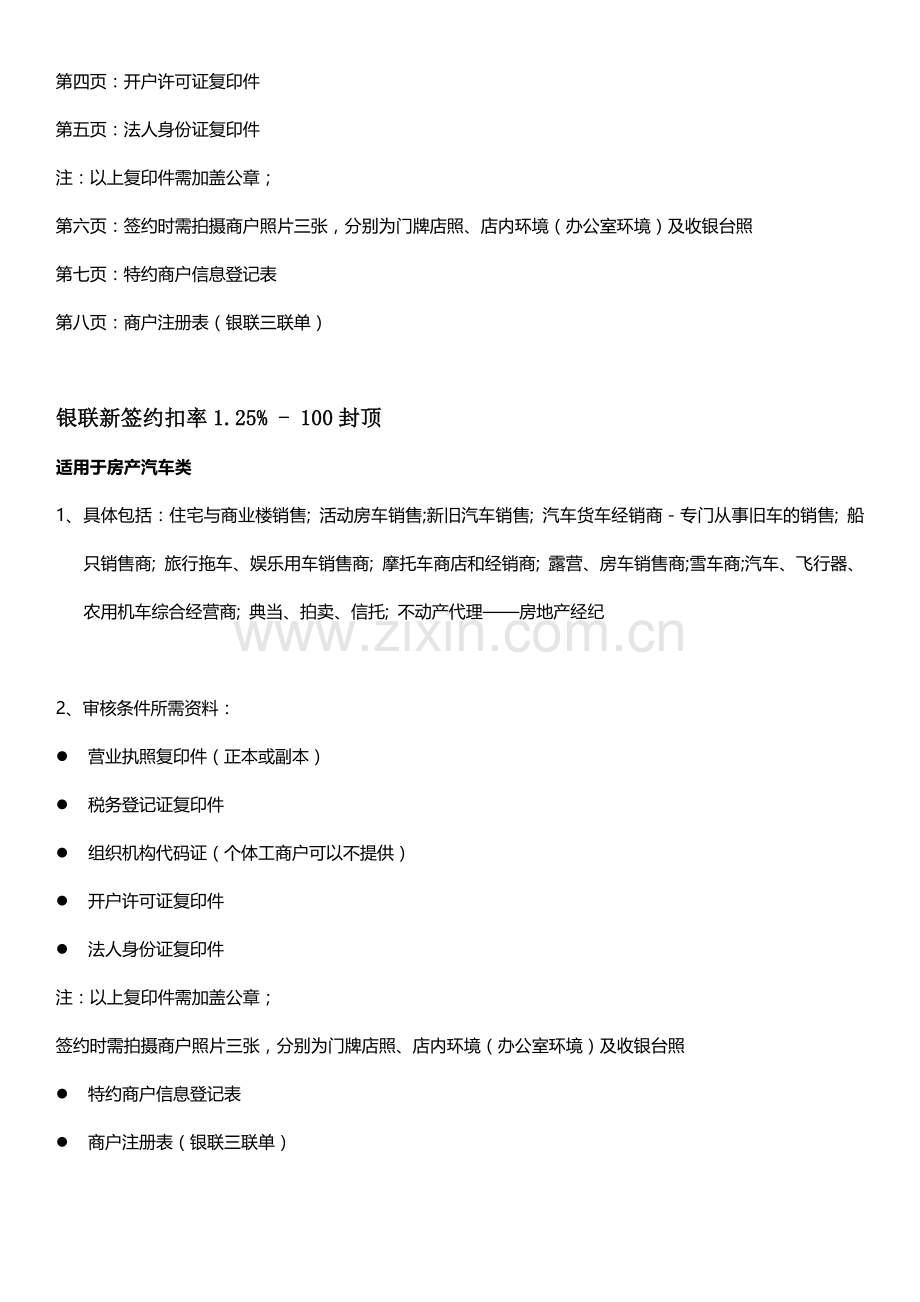 1、 具体包括:大型仓储式超级市场大型仓储式超级市场; 家用电器商店; 自助加油站; 加油站、服务站;大型仓储式家庭用品卖场; 会员制批量零售店; 本地和市郊通勤旅客运输(包括轮渡);出租车服务; 公路客运; 航空公司; 路桥通行费; 铁路局指定票务代售点; 铁路局(直属);公用事业 ;直销-保险直销; 保险缴款(实际经营保险的公司); 电信服务,包括本地和长途电话(含固话、移动缴费类业务); 有线和其它付费电视服务; 政治组织(政府机构);法庭费用,包括赡养费和子女抚养费; 罚款; 保释金; 纳税; 使领馆收费; 报亭、报摊;停车场及车库; 国家邮政服务