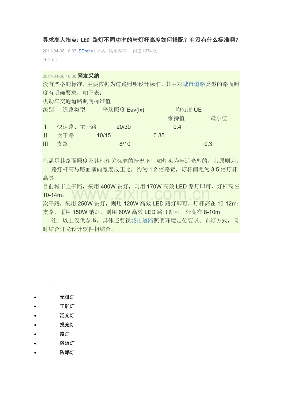 寻求高人指点:LED 路灯不同功率的与灯杆高度如何搭配?有没有什么标准啊?