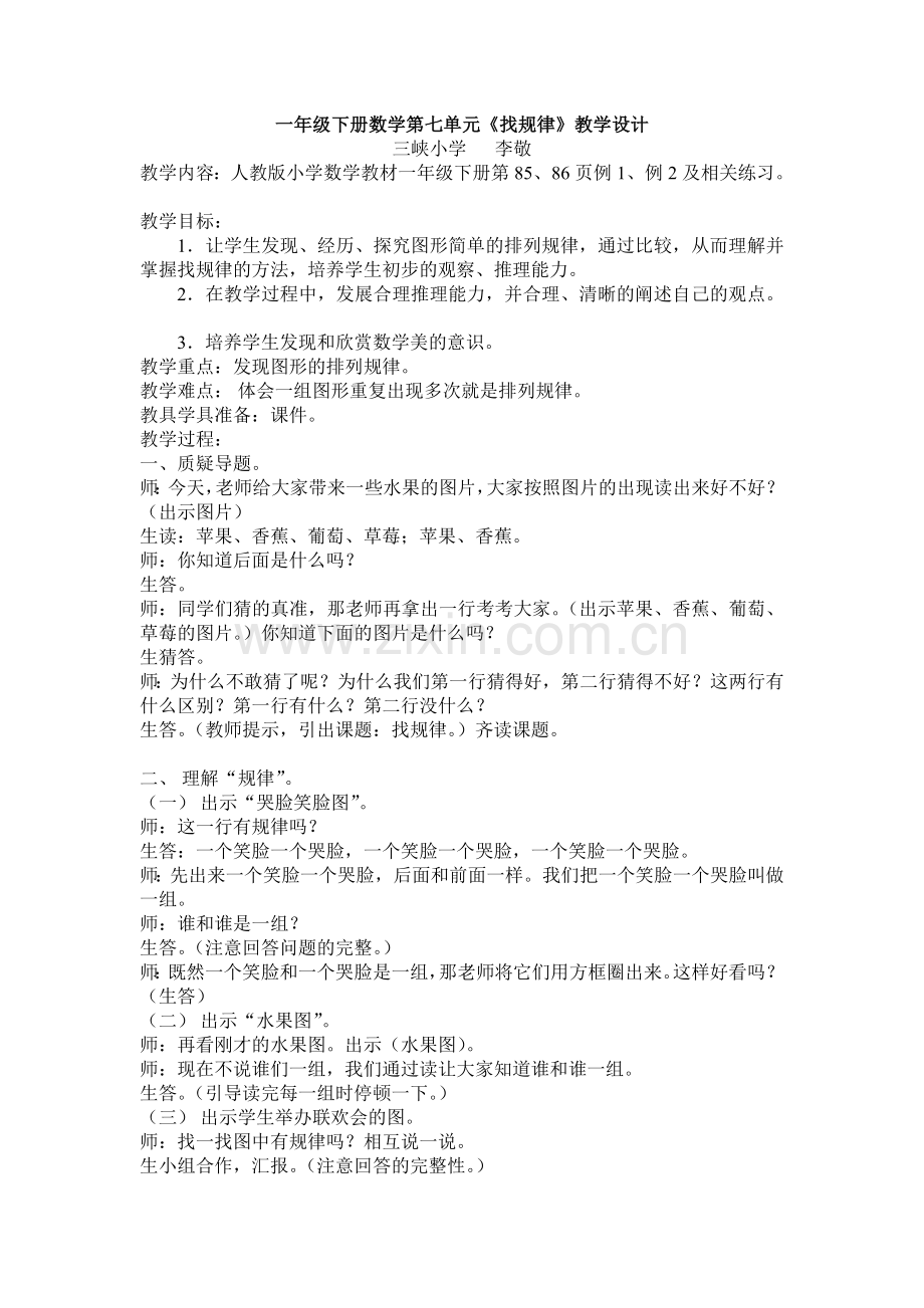 一年级下册数学第七单元《找规律》教学设计