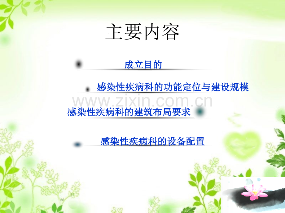 感染性疾病科简介感染性疾病科简介主要内容成立目的成立目的 感染性疾病科的功能定位与建设规模感染性疾病科的功能定位与建设规模 感染性疾病科的建筑布局要求感染性疾病科的建筑布局要求感染性疾病科的设备配置感染性疾病科的设备配置 传染病严重威胁人民群众的生命健康,原已被控制的传染病死灰传染病严重威胁人民群众的生命健康,原已被控制的传染病死灰复燃,新的传染病陆续出现,突发性传染病暴发流行时有发生。复燃,新的传染病陆续出现,突发性传染病暴发流行时有发生。传染病传染病由于各种原因导致的耐药菌株不断增加,使得感染性疾病发病由于各种原因导致的耐药菌株不断增加,使得感染性疾病发病率上升,治疗难度加大,感染性疾病对人民群众身体健康和生率上升,治疗难度加大,感染性疾病对人民群众身体健康和生命安全具有潜在的严重威胁命安全具有潜在的严重威胁 感染性疾病感染性疾病成立目的成立目的 二级以上综合医院接诊病人数量大,也是病人首二级以上综合医院接诊病人数量大,也是病人首诊就医的地点,因此,切实做好二级以上综诊就医的地点,因此,切实做好二级以上综 合医院的合医院的感染性疾病科建设,提高其对传染病的筛查、预警和感染性疾病科建设,提高其对传染病的筛查、预警和防控能力及感染性疾病的诊疗防控能力及感染性疾病的诊疗 水平,实现对传染病的水平,实现对传染病的早发现、早报告,早治疗,及时控制传染病的传播,早发现、早报告,早治疗,及时控制传染病的传播,有效救治感染性有效救治感染性 疾病,保护人民群众身体健康具有十疾病,保护人民群众身体健康具有十分重要的意义。分重要的意义。该规定提出,医师在接诊过程中,对体温38,伴有呼吸道症状(鼻塞、流涕、咳嗽、咽喉肿痛、气促、呼吸困难等)的急性呼吸道发热病人,要首先为其提供一次性外科口罩,避免交叉感染。经诊断不能排除呼吸道传染病的,要将病人转至感染性疾病科进一步明确诊断。未成立感染性疾病科的,要将病人转至相对隔离的分诊点。感染性疾病科或分诊点的医师对上述来诊的急性呼吸道发热病人,特别是对白细胞正常或降低,伴有肺炎表现的病人,必须询问以下流行病学史和职业暴露史第二条 医疗机构应当建立传染病预检、分诊制度。二级以上综合医院应当设立感染性疾病科,具体负责本医疗机构传染病的分诊工作,并对本医疗机构的传染病预检、分诊工作进行组织管理。没有设立感染性疾病科的医疗机构应当设立传染病分诊点。感染性疾病科和分诊点应当标识明确,相对独立,通风良好,流程合理,具有消毒隔离条件和必要的防护用品。二级以上综合医院应当设立感染性疾病科,具体负责本医疗机构传染病的分诊工作,并对本医疗机构的传染病预检、分诊工作进行组织管理;没有设立感染性疾病科的医疗机构应当设立传染病分诊点。一、医师在接诊过程中对体温38,伴有呼吸道症状(鼻塞、流涕、咳嗽、咽喉肿痛、气促、呼吸困难等)的急性呼吸道发热病人,要首先为其提供一次性外科口罩,避免交叉感染。经诊断不能排除呼吸道传染病的,要将病人转至感染性疾病科进一步明确诊断。未成立感染性疾病科的,要将病人转至相对隔离的分诊点。二、感染性疾病科或分诊点的医师对上述来诊的急性呼吸道发热病人,特别是对白细胞正常或降低,伴有肺炎表现的病人,必须询问以下流行病学史和职业暴露史卫生部要求,进一步加强医疗机构感染性疾病科(或肠道门诊)工作。各医疗机构要认真进行腹泻病人的登记和筛检,发现腹泻病例异常增多的情况要及时报告;切实做好诺如病毒感染性腹泻病例的隔离和规范治疗以及病人排泄物、呕吐物、医疗废物的消毒处理;严格掌握出院标准,防止疫情扩散。一、加强医疗机构感染性疾病科工作,做好传染病预检分诊工作。各医疗机构要坚持肠道门诊制度,在5-10月期间,认真进行腹泻病例的登记和筛检,做好传染病疫情网络直报工作,并严格掌握肠道传染病病例出院标准,防止疫情扩散。二、继续做好肠道传染病的疫情监测工作。要加强对饮食服务从业人员、学校、大中城市中流动人口聚居区、建筑工地等重点地区和人口的疫情监测和管理;通知要求加强医疗机构感染性疾病科工作,做好传染病预检分诊和诊治;要根据病例临床特征,结合流行病学史,对手足口病病例进行临床诊断。通知强调各地要按照学校和托幼机构传染病疫情报告工作规范(试行)开展病例的网络报告;要加强对托幼机构、学校等重点地区和人群的疫情监测和管理;四、进一步加强感染性疾病科建设。各级各类医疗机构要不断强化感染性疾病科的规范化管理和建设,建立并完善腹泻病患者的门诊登记制度,肠道门诊每年5-10月开设,重点地区可提前开设或常年开设,确保能早期发现和报告疫情。特别是要做好霍乱等肠道传染病的发现和报告工作,在流行季节要做到“逢泻必登、逢疑必检”。三、加强疫情的调查与处置各级各类医疗机构要进一步加强感染性疾病科(或肠道门诊)建设,完善预检分诊制度,做好腹泻病人的登记、筛检和报告,切实作到“逢泻必登、逢疑必检”。第九条抗菌药物管理工作组由医务、药学、感染性疾病、临床微生物、护理、医院感染管理等部门负责人和具有相关专业高级技术职务任