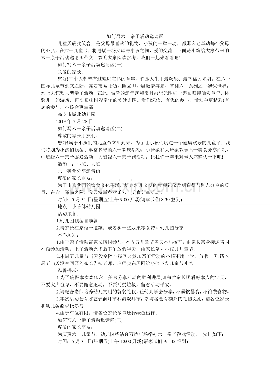 儿童天确实笑容,是父母最喜欢的礼物,小孩的一举一动,都那么地牵动每个父母的心弦,在六一儿童节,将进展一场父母与小孩之间,爱的交流。下面是小编给大家带来的六一亲子活动邀请函范文,欢迎大家阅读参考,我们一起来看看吧!