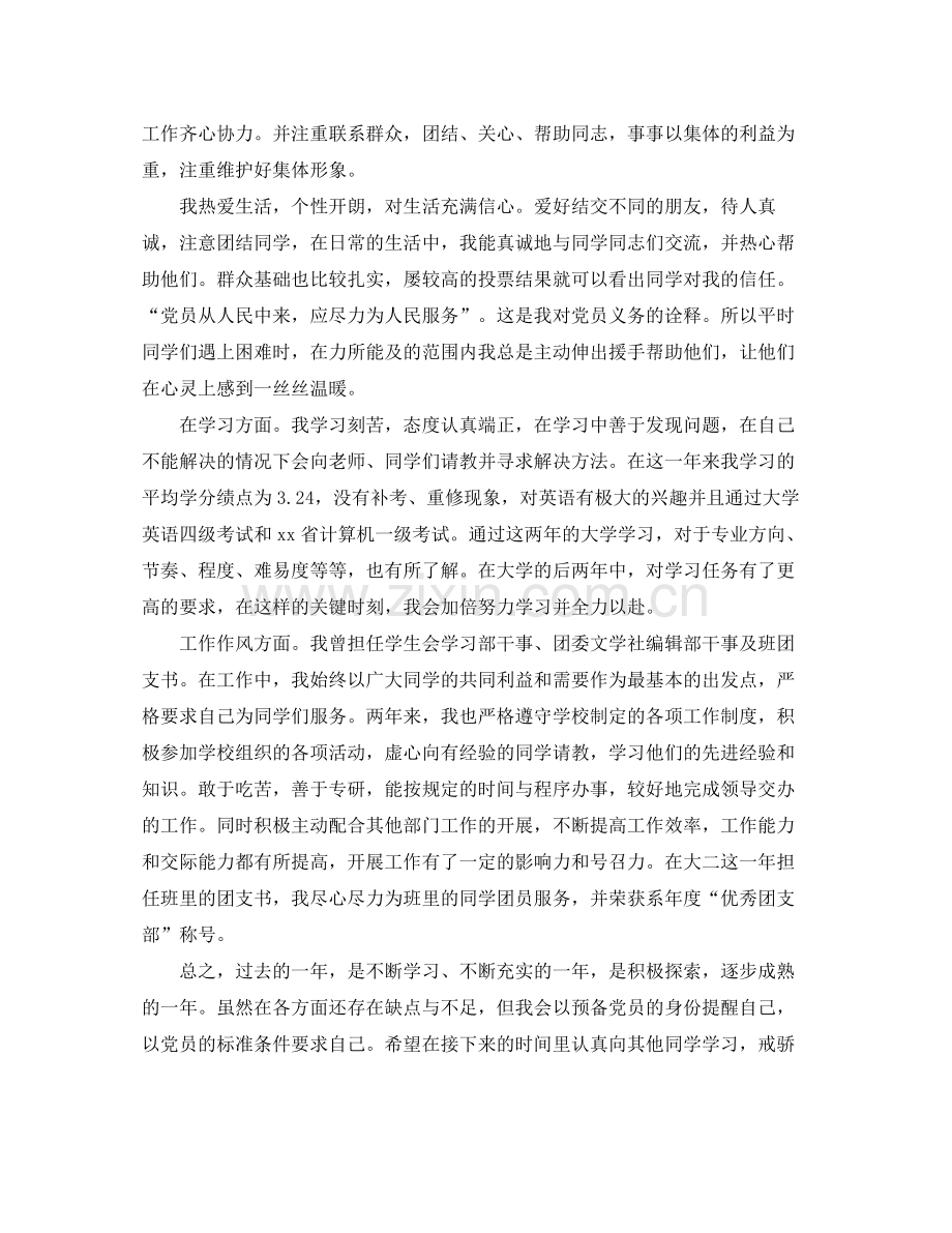 总之,过去的一年,是不断学习、不断充实的一年,是积极探索,逐步成熟的一年。虽然在各方面还存在缺点与不足,但我会以预备党员的身份提醒自己,以党员的标准条件要求自己。希望在接下来的时间里认真向其他同学学习,戒骄戒躁,勤勉敬业,在平凡的工作和学习中取得更大的成绩。我会更用心,更努力朝党员的方向前进,争取早日符合党员要求,进而在组织上入党。