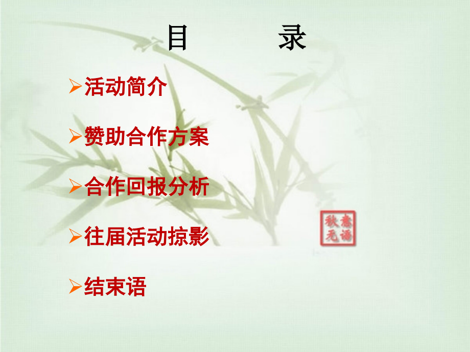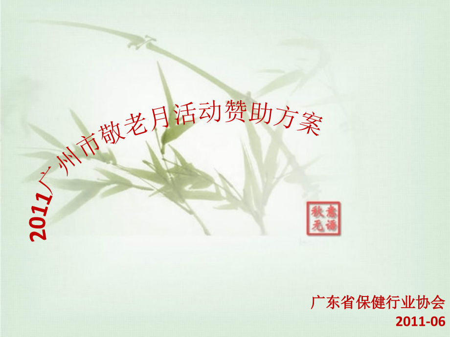 单击此处编辑母版标题样式,单击此处编辑母版文本样式,第二级,第三级,第四级,第五级,2020/1/2,#,广东省保健行业协会,2011-06,2011,广州市敬老月活动,赞助方案,目 录,活动简介,赞助合作方案,合作回报分析,往届活动掠影,结束语,活动简介,1989,年,4,月,13,日,广州市第九届人民代表大会常务委员会第八次会议,听取和审议了市人民政府提请审议的,关于确定广州市敬老日的议案的说明,,决定从今年起,每年中秋节(农历八月十五日)为广州市敬老日。,90,年后市老龄委每年在,“,敬老日,”,前后举办,“,敬老月,”,系列活动,历届“敬老月“期间,广州市老龄委都会组织一系列的老人活动,在广州掀起敬老爱老的一系列活动。倡导和谐社会,幸福广州。,从,2004,年起,广州市老龄委组织“美在金秋”敬老活动,至今已经举办了七届,取得了非常好的效果和社会影响力。,主办单位:,广州市老龄工作委员会、广州市民政局、广州市体育局,承办单位:,广州市老龄工作委员会办公室、广州市老年人体育协会、广州市公益老年人体育发展中心,协办单位:,广州市老年人服务中心、各区(县级市)老龄工作委员会办公室,;广东省保健行业协会,活动简介,活动简介,2011,年第八届”美在金秋”系列活动时间定为:,定于,2011,年,8,月,17,、,18,日,,,在广州市蓓蕾剧院举行,。,2011,年广州市敬老月系列活动启动仪式暨万名长者登山活动,,定于,2011,年,9,月,6,日(星期二)上午,8,:,30,,在,白云山云台花园东侧广场,举行。,2011,年广州市第二届“*”老年人门球赛,时间:,10,月,17,日至,21,日(星期一至五),活动简介,“美在金秋“,第八届,“,美在金秋,”,老年人风采大赛,安排,参赛项目,体育舞蹈、诗歌朗诵、服饰风采、歌舞、独唱、小组唱、大合唱、器乐演奏。,大赛安排两天举行,情满夕阳电视专题栏目组、家政报、老人报等新闻媒体现场采访。,从中挑选出,12,个较有影响、艺术品位较高、有时代特色的节目,。,参选节目将,参加,9,月,23,日在中山纪念堂的颁奖大会与邀请驻穗部队干休所出,3,个节目一并汇报演出,并为,23,个获奖节目颁奖。,活动简介,“美在金秋“,参选节目将,参加,9,月,23,日在中山纪念堂的颁奖大会与邀请驻穗部队干休所出,3,个节目一并汇报演出,并为,23,个获奖节目颁奖。,活动简介,“美在金秋“,活动拟,邀请李治臻局长为登山活动组委会主任。孙峰副局长、唐国平副巡视员、李沛成主任为副主任。陈健、高燕、欧阳丹(市体育局)为成员。,启动仪式之后,参加登山活动的全体人员由市老龄委带队成四路纵队往白云山方向出发至山顶公园终点。另在山顶公园舞台安排老年文艺团队表演节目。整个过程约,3,小时。,活动简介,“,万名长者登山“,参加这次活动的,有以下单位:,(一)邀请市政府、市老龄委、市民政局领导,9,人出席。,邀请陈国副市长,林道平副秘书长,市民政局李治臻局长,孙峰副局长,唐国平副巡视员出席,拟邀请市委组织部副部长、市老龄委常务副主任李瑾,市人力资源和社会保障局副局长、市老龄委副主任陈敏,市体育局副局长、市老龄委委员林燕芬出席活动。,活动简介,“,万名长者登山“,(二),拟,邀请市人大原副主任、现任市老年人体育协会会长戴治国出席活动。,(三)参加启动仪式和登山活动健康老年人约,10000,人,另工作人员、新闻媒体等,500,人。,总人数,超过,1,万人,活动简介,“,万名长者登山“,启动仪式会场布置,在云台花园东侧广场平台设登山启动仪式主席台,主席台设背景板,两则悬挂空飘,会场四周插彩旗,会场两则悬挂横幅,会场地面贴有队伍站位区间标志。,活动简介,“,万名长者登山“,山顶演出安排,在,白云山山顶广场安排背景板、舞台及音响,邀请领导讲话宣布开幕,并有新闻媒体记者现场采访报道;登山队员按照之前的队伍,进行入座;并可以为自己的参赛作品进行呐喊助威。,赛后颁奖,演出完毕,将进行现场颁奖及合影留念。,活动简介,“,万名长者登山“,广州市第二届“*”老年人门球赛,时间:,10,月,17,日至,21,日(星期一至五),地点:解放军军事体育进修学院,承办单位:市老龄办、市老年人体育协会、市公益老年体育发展中心,协办单位:市老年人服务中心、广东省保健行业协会,活动简介,“门球赛,“,活动规模:,参加大赛活动人员约,700,人,由各区(县级市)老年人代表队,驻穗部队干休所代表队,省、市老年体协代表队共约,60,支队伍队参赛。,活动简介,“门球赛,“,活动内容:,1,、,60,支队伍在两个赛场分组比赛。,2,、最后一天举行颁奖和闭幕式,拟邀请林道平副秘书长、李治臻局长,孙峰副局长、驻穗部队有关领导出席闭幕式并颁奖。,活动简介,“门球赛,“,赞助合作方案,三个活动可以同时赞助,也可以分开单个合作;,赞助分为总冠名和协办单位两个级别;,总冠名:(费用,10,万元、每个活动仅限一家),协办单位:,3,名;费用:,5,万元人民币;,合作回报分析,总冠名合作回报分析:,1,、总赞助商为本次活动协办单位,享受现场立体包装宣传,a.,活动,(,logo,),赞助商的商标或,logo,与主办方商标将同时体现在本次,活动,的所有宣传品上现。并以冠名的形式出现,;,b,、,活动背景,板,赞助商的商标或,logo,将出现在本次,活动,的背景板上。,合作回报分析,总冠名合作回报分析:,2,、通道大厅或接待处可摆放冠名企业,X,型展架或易拉宝两个,3,、统一派发冠名企业的宣传册或相关宣传广告,统一装在