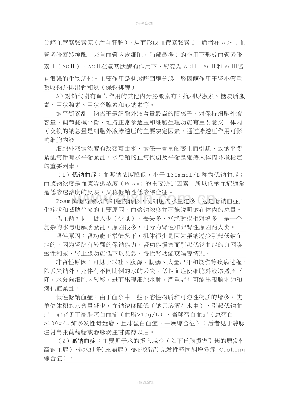 (1)低钠血症:血浆钠浓度降低,小于130mmol/L称为低钠血症;血浆钠浓度是血浆渗透浓度(Posm)的主要决定因素,所以低钠血症通常是低渗透浓度的反映,又称低钠性低渗综合征。
