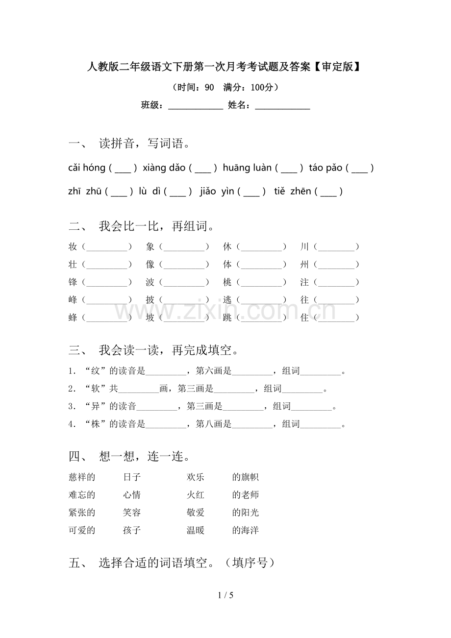 人教版二年级语文下册第一次月考考试题及答案【审定版】