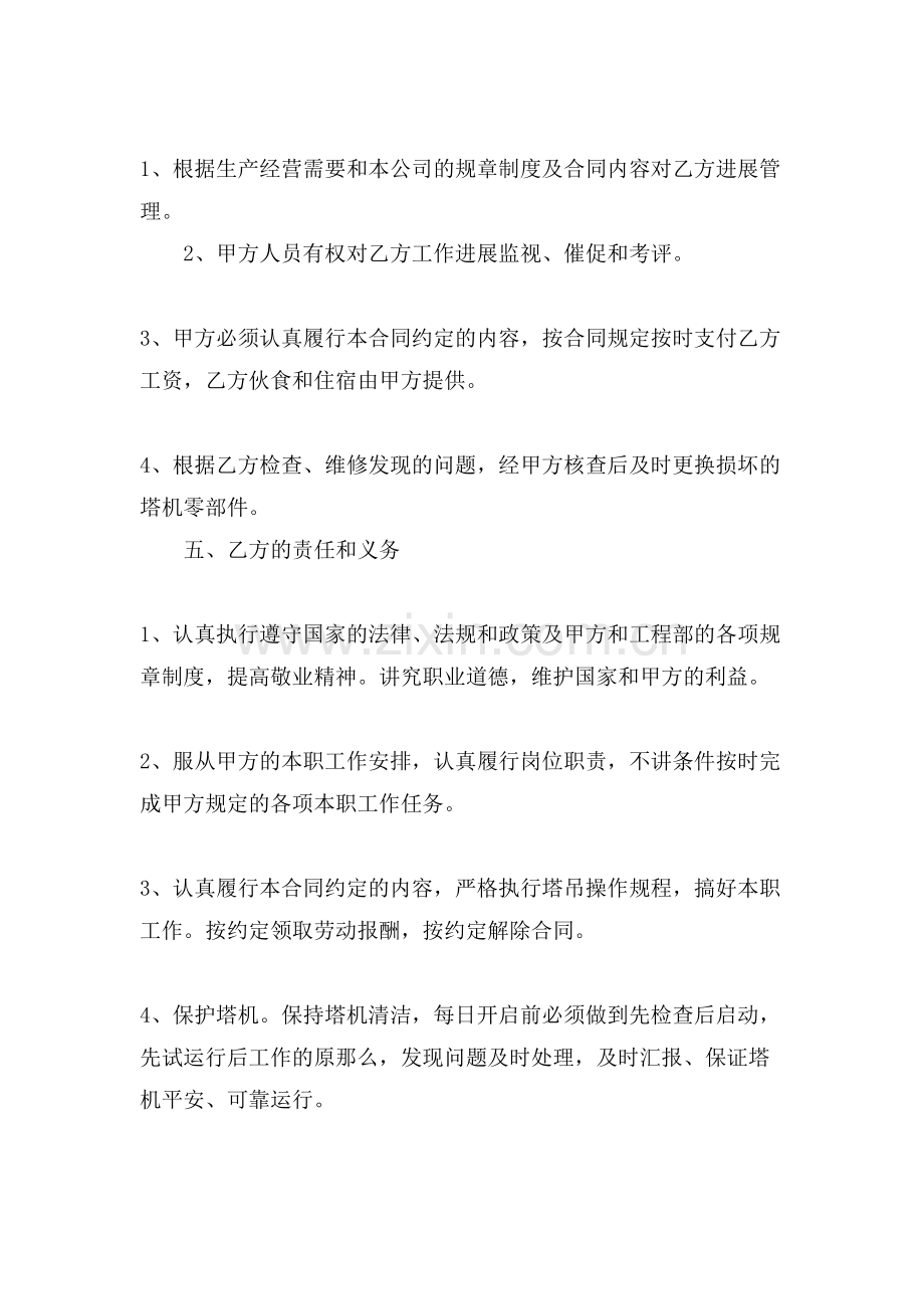 3、认真履行本合同约定的内容,严格执行塔吊操作规程,搞好本职工作。按约定领取劳动报酬,按约定解除合同。