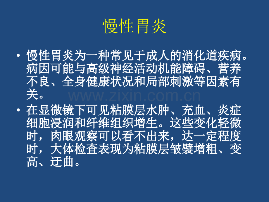 胃炎(一)急性胃炎 【临床与病理】食后数小时突然发病,上腹剧痛,拒食,恶心和呕吐等症状【影像学表现】l较重者胃内滞留液增多,胃黏膜增粗、模糊l穿孔者可见平片或透视下的气腹l腐蚀性胃炎累及肌层后可见因瘢痕收缩胃腔狭窄与梗阻慢性胃炎慢性胃炎为一种常见于成人的消化道疾病。慢性胃炎为一种常见于成人的消化道疾病。病因可能与高级神经活动机能障碍、营养病因可能与高级神经活动机能障碍、营养不良、全身健康状况和局部刺激等因素有不良、全身健康状况和局部刺激等因素有关。关。在显微镜下可见粘膜层水肿、充血、炎症在显微镜下可见粘膜层水肿、充血、炎症细胞浸润和纤维组织增生。这些变化轻微细胞浸润和纤维组织增生。这些变化轻微时,肉眼观察可以看不出来,达一定程度时,肉眼观察可以看不出来,达一定程度时,大体检查表现为粘膜层皱襞增粗、变时,大体检查表现为粘膜层皱襞增粗、变高、迂曲。高、迂曲。影像学表现粘膜皱襞的宽度加宽,广泛增粗及迂曲。粘膜皱襞的宽度加宽,广泛增粗及迂曲。小弯侧粘膜皱襞排列走向失去与小弯侧平小弯侧粘膜皱襞排列走向失去与小弯侧平行之走向,呈迂曲交叉状,胃窦部小弯侧行之走向,呈迂曲交叉状,胃窦部小弯侧的轮廓呈锯齿状切迹,胃蠕动增强。的轮廓呈锯齿状切迹,胃蠕动增强。钡气双重造影检查可见胃小区扩大,直径钡气双重造影检查可见胃小区扩大,直径超过超过3mm3mm,形态呈多边形、圆形或不规则形。,形态呈多边形、圆形或不规则形。确诊应以胃镜及组织学检查为准。确诊应以胃镜及组织学检查为准。胃炎的详细分类根据参考病理、影响表现、病因可有如根据参考病理、影响表现、病因可有如下分类及诊断名称:下分类及诊断名称:萎缩增生性胃炎(属慢性胃炎)萎缩增生性胃炎(属慢性胃炎)化生性胃炎(属慢性胃炎)化生性胃炎(属慢性胃炎)肉芽肿性胃炎(属慢性胃炎)肉芽肿性胃炎(属慢性胃炎)糜烂性胃炎(属慢性胃炎)糜烂性胃炎(属慢性胃炎)腐蚀性胃炎(属急性或慢性胃炎)腐蚀性胃炎(属急性或慢性胃炎)影像学表现黏膜相黏膜相:黏膜皱襞肥厚、粗大、紊乱,伴:黏膜皱襞肥厚、粗大、紊乱,伴有痉挛收缩。有痉挛收缩。双对比相双对比相:胃小区消失、胃壁变薄(萎缩:胃小区消失、胃壁变薄(萎缩性胃炎)性胃炎)双对比相:胃小区过度增大(炎性小区)双对比相:胃小区过度增大(炎性小区)双对比相:椭圆形透亮灶中心有一钡点双对比相:椭圆形透亮灶中心有一钡点(糜烂性胃炎)(糜烂性胃炎)肥肥厚厚性性胃胃炎炎慢慢性性胃胃炎炎黏黏膜膜相相萎萎缩缩增增生生性性胃胃炎炎萎萎缩缩增增生生性性胃胃炎炎糜糜烂烂性性胃胃炎炎胃窦炎Antritis 病因:慢性非特异性炎症病因:慢性非特异性炎症多见于多见于3030岁以上成人。岁以上成人。常见的症状为疼痛,疼痛部位在中上腹或常见的症状为疼痛,疼痛部位在中上腹或右上腹,疼痛的性质为隐痛、胀痛或难以右上腹,疼痛的性质为隐痛、胀痛或难以忍受的疼痛,常呈周期性发作。忍受的疼痛,常呈周期性发作。可伴有恶心、呕吐、食欲不振等症状。少可伴有恶心、呕吐、食欲不振等症状。少数可有出血。数可有出血。影像学表现l粘膜纹增粗、紊乱,可宽达粘膜纹增粗、紊乱,可宽达1cm1cm左右左右l增粗的黏膜皱襞交错、迂曲、盘绕,胃窦粘膜纹多呈横行增粗的黏膜皱襞交错、迂曲、盘绕,胃窦粘膜纹多呈横行l胃壁轮廓呈规则的锯齿状,锯齿的边缘较光滑胃壁轮廓呈规则的锯齿状,锯齿的边缘较光滑l炎性息肉可见大小不等的圆形影炎性息肉可见大小不等的圆形影l黏膜皱襞活动度增加,可诱发胃黏膜脱垂。黏膜皱襞活动度增加,可诱发胃黏膜脱垂。l胃窦激惹、痉挛、收缩:表现为幽门前区经常处于半收缩胃窦激惹、痉挛、收缩:表现为幽门前区经常处于半收缩状态,不能象正常那样在蠕动波将到达时如囊状,但能缩状态,不能象正常那样在蠕动波将到达时如囊状,但能缩小至胃腔呈线状。小至胃腔呈线状。l肌层肥厚时,胃窦可出现环形或向心性狭窄:形态比较固肌层肥厚时,胃窦可出现环形或向心性狭窄:形态比较固定,一般可收缩至极细,但不能舒张,与正常段呈逐渐过定,一般可收缩至极细,但不能舒张,与正常段呈逐渐过渡或分界比较清楚。狭窄段可显示粘膜纹,多数呈纵行渡或分界比较清楚。狭窄段可显示粘膜纹,多数呈纵行胃胃窦窦炎炎炎炎性性息息肉肉胃胃窦窦炎炎胃胃粘粘膜膜脱脱垂垂胃溃疡【临床与病理】l多为单发,壁龛,常深达肌层l圆形或椭圆形,直径5-20mm,深为5-10mm,口部周围呈炎变水肿l穿透性溃疡,急性穿孔l胼胝性溃疡l临床:上腹部疼痛,具有反复性、周期性和节律性的特点,恶心、呕吐、嗳气与返酸胃溃疡 【影像学表现】l直接征象:龛影,多见于小弯侧,乳头状、锥形,边缘光滑整齐,密度均匀l龛影口部有透明带,是良性溃疡的特征:n粘膜线n项圈征n狭颈征n瘢痕收缩,均匀性纠集l胃溃疡引起功能性改变n痉挛性改变:指状切迹n胃液分泌增多n蠕动变化n排空的改变n“葫芦胃”或“哑铃胃”胃溃疡(图)胃溃疡(图)小弯侧龛影形成胃溃疡(图)胃窦溃疡(图)胃体小弯溃疡及大弯侧痉挛性切迹示意图胃溃疡(示意图)十一、胃溃疡(3)【影像学表现】l胃溃疡的特殊类型 l穿透性溃疡:龛影大而深,形如囊袋,狭窄征象显著l穿孔性溃疡:出