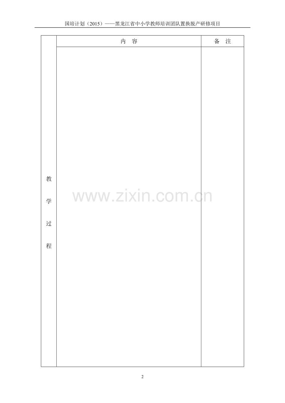 国培计划(2015)——黑龙江省中小学教师培训团队置换脱产研修项目 哈尔滨学院培训班课程作业——教学设计与反思 姓 名 成绩 教 材 年 级 课 题 教学目标 教学重难点 教法学法 教学手段 教 学过程 内 容 备 注 教 学 过 程 内 容 备 注 教 学过程 内 容 备 注 板书设计 教 学 反 思 5
