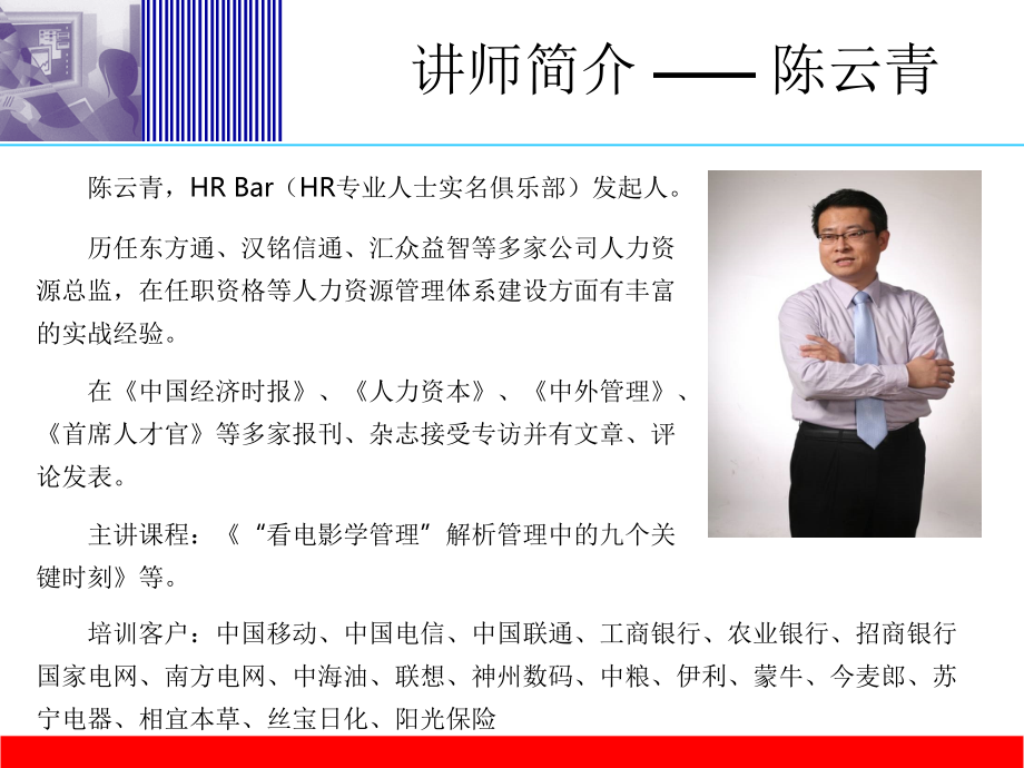 ,Click to edit,Click to edit Master text styles,Click to edit,Click to edit Master text styles,读,这是你的船,解析领导力(之一),2016,年,2,月,17,日,讲师简介,陈云青,陈云青,,HR Bar,(,HR,专业人士实名俱乐部)发起人。,历任东方通、汉铭信通、汇众益智等多家公司人力资源总监,在任职资格等人力资源管理体系建设方面有丰富的实战经验。,在,中国经济时报,、,人力资本,、,中外管理,、,首席人才官,等多家报刊、杂志接受专访并有文章、评论发表。,主讲课程:,“看电影学管理”解析管理中的九个关键时刻,等。,培训客户:,中国移动、中国电信、中国联通、工商银行、农业银行、招商银行国家电网、南方电网、中海油、联想、神州数码、中粮、伊利、蒙牛、今麦郎、苏宁电器、相宜本草、丝宝日化、阳光保险,缘起,管理十项,1,管理自我,管理者的角色认知与定位,管理者自我认知,九型人格,管理者的效能管理,2,管理他人,管理者的工作委派和有效授权,员工培养与辅导,激励的八大方略,3,管理团队,跨部门的沟通与协作,4D,领导力及卓越团队建设,4,管理业务,全面绩效管理,问题分析与解决,九型人格测评解析,/,领导力测评解析,/,盖洛普测评解析,管理十项,陈云青,邓玉金,苏进,贾晓菁,“管理十项”讲师团成员,有关拆书,R=Read,(主题阅读),I=Interpretation,(批判性思考),A=Appropriation,(实践),艾德勒,如何阅读一本书,内容简介,本书作者迈克尔,阿伯拉肖夫曾任美国海军“本福尔德号”导弹驱逐舰的舰长。上任伊始,他就面临严重的挑战,虽然这艘舰艇装备精良,但管理水平和作业效率低下,士气低靡,很多士兵希望可以提前退役。经过两年的努力,作者成功地把这艘驱逐舰改造成为美国海军公认的典范。全舰,310,名官兵形成了一支充满自信、干劲十足的团队,大家同舟共济,而且每个人都学会了为自己的行为负责。“这是你的船”成为全体船员的口号。,“这是你的船”由来,我发现我给予下属的自由空间越大,他们就会越严格地执行我的命令。刚开始的时候,人们总是会在做一件事情之前征求我的同意,后来我告诉他们:“这是你的船,所以你也要负起责任。你自己决定吧,让我们看看结果如何。”从那以后,“这是你的船”就成了“本福尔德号”的口号。所有的水兵都觉得照管好“本福尔德号”就是自己的职责所在。我相信,只要你的组织能够让员工确立一种“这是我的公司”的信念,你就一定能够打败所有其他竞争对手。,推 荐 语,本书作者迈克尔,阿伯拉肖夫特殊的经历和背景使他对组织、管理、领导具有独特的体会和看法。本书在美国出版不到半年好评如潮,人们盛赞“美国军方比大多数的美国企业更了解管理的精髓,美国的企业界还是需要向美国军方学习管理”。,2001,年,迈克尔,阿伯拉肖夫在波士顿创建了,Grassroots Leadership,咨询公司,并担任,CEO,。,推荐书籍,五项行为十个承诺,五项行为十个承诺,开拆!,从圣迭戈开往波斯湾途中,同行的两艘船分别是“盖里号”和“希尔号”,两艘军舰的舰长在军衔上都高我一级。三艘军舰的协同总指挥就在“希尔号”上。我们进行了多次军事演练,其中一项演练任务是发现并避开前方一艘装扮成敌人的美国潜水艇。而该潜水艇的任务则是发现并炸沉总指挥官乘坐的那艘船。到距离演习还有三天的时候,还是没有任何消息透露出来。,我是供应商,对于我来说,这可是一次机会。从商业角度,你可以说是“本福尔德号”的水兵们发现了一个提升自己“市场份额”的机会。,职场箴言,将主管领导当成客户,我是供应商。,主动寻找商机,向客户提供优质产品和服务!,延伸阅读,请找出迈克尔将主管领导当客户提供优质产品和服务的章节。,团队氛围的建设,决策信息的提供,规范流程的优化,下属绩效的改进,目标任务的管理,人才梯队的建设,管理者的六项职能,决策信息的提供,我命令声纳兵设计出一套富有创新性的方案。我告诉他们要学会站在该潜水艇指挥官的角度考虑问题,“想想看,如果你是他的话,你会怎么做?”进而要求他们设计相应的方案来应对可能的袭击。结果让所有人都大吃一惊,这些声纳兵给出了迄今为止我所见过的最富想象力的计划。,我们把方案提交了上去,可总指挥官和“盖里号”指挥官却一致否决了这项计划。在他们看来,还是使用自第二次世界大战以来一直沿用的传统战术比较安全。,沟通(韧性),在听到这个决定之后,我感到非常气愤,并马上通过无线电跟他们进行辩论。无线电是一条非常安全的回路,但所有的水兵都可以很方便地听到我们的谈话内容,于是我让大家一起参加到这场争论中来。就这样,几乎整个“本福尔德号”都听到了我是如何顶撞自己的上司的。,对方明确告诉我,“我们还是决定使用盖里号的作战方案。”我要求对方做出解释,希望能说服他们改变决定。不行!,刻意动作,在听到这个决定之后,我感到非常气愤,并马上通过无线电跟他们进行辩论。无线电是一条非常安全的回路,但所有的水兵都可以很方便地听到我们的谈话内容,于是我让大家一起参加到这场争论中来。就这样,几乎整个“本福尔德号”都听到了我是如何顶撞自己的上司的。,对方明确告诉我,“我们还是决定使用盖里号的作战方案。”我要求对方做出解释,希望能说服他们改变决定。不行!,冲突与绩效的关系,思考:,为达到理想的团队绩效,团队成员间冲突是激烈