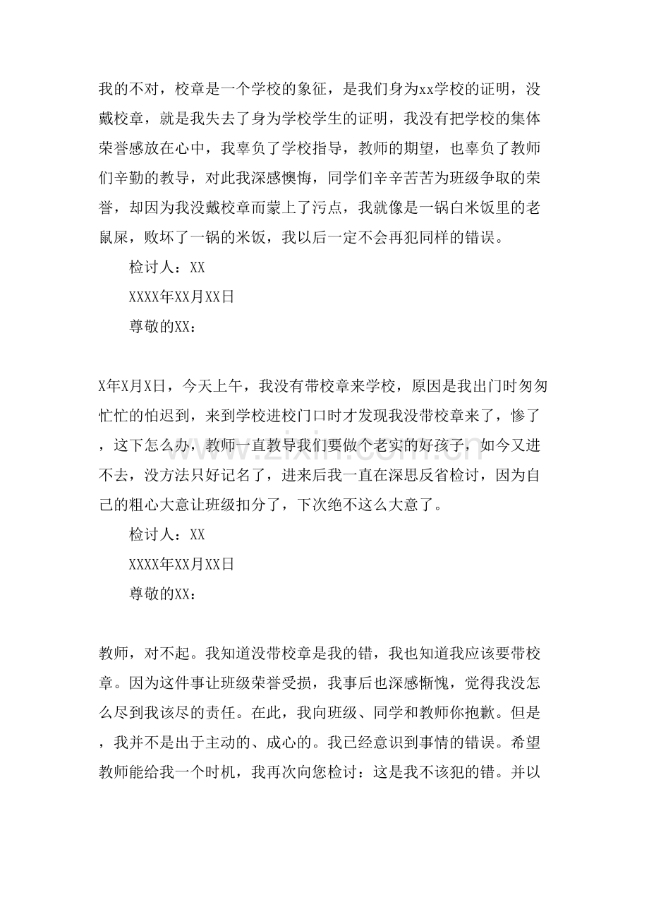 X年X月X日,今天上午,我没有带校章来学校,原因是我出门时匆匆忙忙的怕迟到,来到学校进校门口时才发现我没带校章来了,惨了,这下怎么办,教师一直教导我们要做个老实的好孩子,如今又进不去,没方法只好记名了,进来后我一直在深思反省检讨,因为自己的粗心大意让班级扣分了,下次绝不这么大意了。