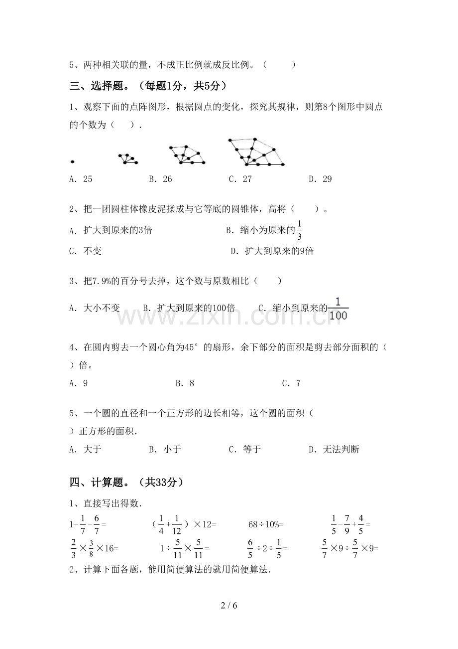 2022-2023年人教版六年级数学下册期末考试题(带答案)