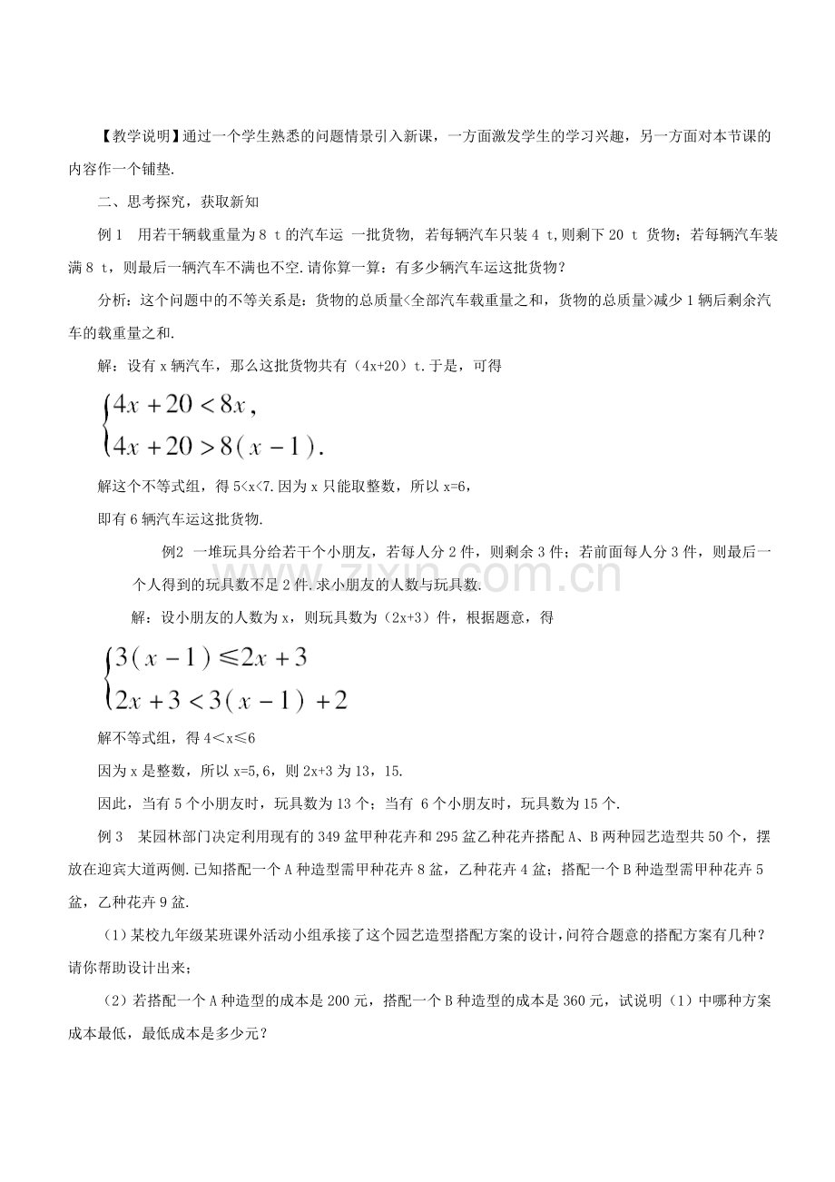 【教学说明】用不等式组解决实际问题类似于列方程组解决实际问题,同样要经历“审”“设”“找”“列”“解”“答”等几个步骤.其中找出实际问题中的不等关系是解决问题的关键.