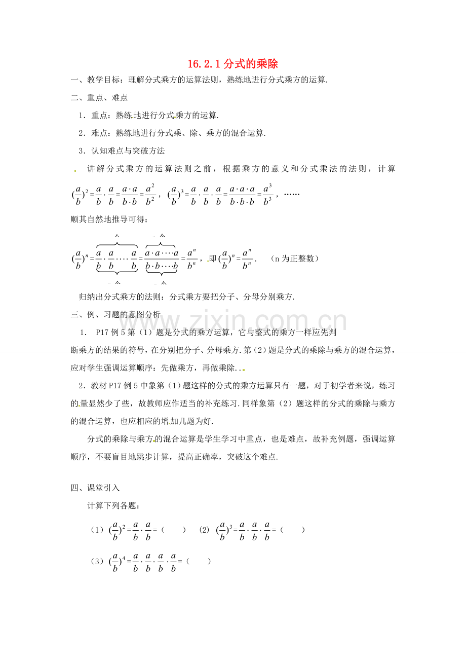一、教学目标:理解分式乘方的运算法则,熟练地进行分式乘方的运算.