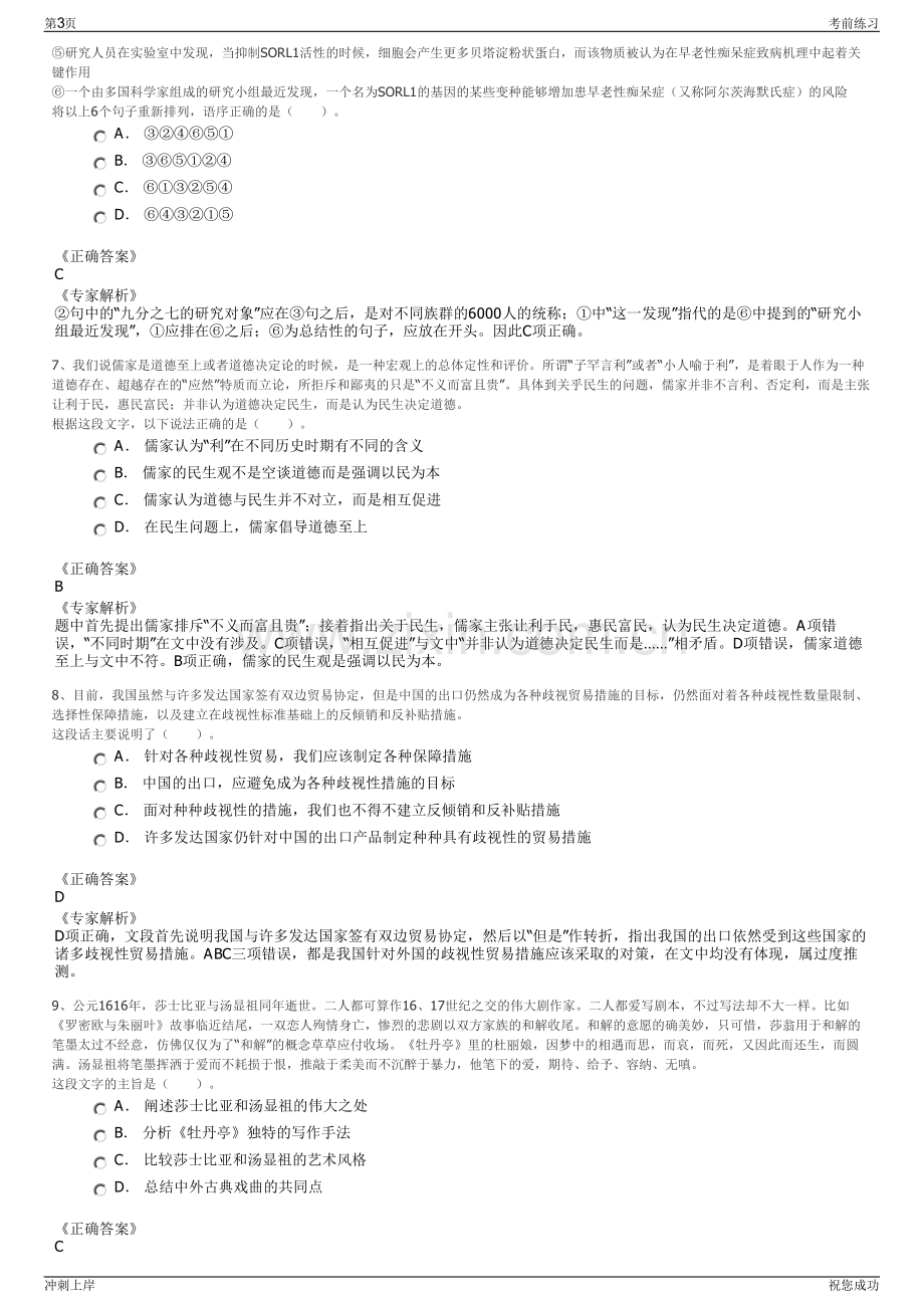 2024年中国东方航空股份公司招聘笔试冲刺题(带答案解析)【下载须知】:1,本套练习包含以下题型:言语理解与表达题、常识判断题、数量关系题、判断推理题和资料分析题等题型;共135道。2、本套试题根据常见招考题总结归纳,主要用于练习答题思路和拓展知识面。3、本套试题非考试真题,且与中国东方航空股份公司无关。一、第一部分言语理解与表达(本部分包括表达与理解两方面的内容。请根据题目要求,在四个选项中选出一个最恰当的答案。)1、人们试图去预测世界发展线路或寻求过分简化及单向的解决办法,对此我们都应保持怀疑的态度。因为世界形势极其复杂。发展趋势分析则在我们展望未来时提供了一种更为错综复杂的观点,使我们集中关注所要面临的决策分析。对这段文字理解正确的是()。A 发展趋势分析在一定程度上能避免简单化的倾向 B 简单化的思维对认清世界发展路线是毫无意义的 C 发展趋势分析是一种精确的趋势预测方法 D 鉴于世界形势的极端复杂性,预测发展趋势是徒劳的正确答案A专家解析B项错误,由“对此我们都应保持怀疑的态度”可知,“毫无意义”过于绝对;C项错误,文段仅提到“发展趋势分析”的复杂性,并未涉及其“精确性”;D项错误,文段表达的意思是“预测世界发展线路或寻求过分简化及单向的解决办法”值得怀疑,而非“分析发展趋势”是徒劳的。A项正确,由“发展趋势分析在我们展望未来时提供了一种更为错综复杂的观点”可知,发展趋势分析在一定程度上能避免简单化的倾向。2、在临床使用抗菌药物时,依患者个人情况选择药品种类、严格要求第一次用药的剂量与浓度,并在随后的药物使用频率、药物配伍方面都遵行严格的规定的话,尽管不能完全防止耐药菌株的出现,也应该能控制耐药状况的泛滥和恶化。作者对使用抗菌药物后是否会出现耐药状况的看法是()。A 不可避免 B 未置可否 C 可以控制 D 无法确定正确答案C专家解析由“尽管也应该能控制耐药状况的泛滥和恶化”可知,作者对出现耐药状况的看法是“可以控制”的。因此C项正确。3、古籍修复是一项实践性很强的工作,如果无法接触到古籍,即使学习了相关知识也很难提高实践能力。古籍修复虽然可以看作一门技艺,但需要文学、目录学,乃至材料、化学等理工科目的背景知识才能更好地工作,对文化水平要求较高。图书馆、博物馆等招聘单位对于古籍修复工作应聘者的学历要求通常较高,需要本科及以上学历,但是目前我国古籍修复专业的学历教育却以高职专科教育为主。这就使得文博机构的人才需求无法得到满足,而具有一些实际操作能力的人又无用武之地。这段文字意在说明:A古籍修复人才应具备多方面的专业知识 B招聘古籍修复人才时应轻学历、重能力 C文博机构应为古籍修复人员提供实践机会 D古籍修复人才的培养与现实需求严重脱节正确答案D第1页考前练习冲刺上岸祝您成功专家解析文段开篇通过下定义的形式引出话题“古籍修复”,接下来告诉我们“古籍修复”的人才需要两方面的能力,一方面是需要“实践能力”,另一方面需要较高的“文化水平”,随后通过转折关联词“但是”指出现存的问题,“我国古籍修复专业的学历教育却以高职专科教育为主”即具有实践能力的人才不具备高学历,这样的现状正是人才教育培养与现实需求严重脱节导致的。文段最后通过指代词“这”指出“人才教育培养与现实需求脱节”这一问题带来的危害,即“文博机构的人才需求无法得到满足,而具有一些实际操作能力的人又无用武之地”,对应D项。A项,“古籍修复”人才应具备实践能力与较高的文化水平这两方面,而专业知识只针对文化水平这一方面,表述片面,排除;B项,文段重在强调我国古籍修复人才培养方面的问题,而非指出招聘古籍修复人才的时候应该怎么做,故选项所述对策无法解决文段中的问题,与文意不符,排除;C项,“文博机构”对应文段尾句,重在论述问题带来的危害,非重点,且“提供实践机会”这一对策也无法对应文段,无中生有,排除。故正确答案为D。【文段出处】光明日报善用社会力量促进古籍修复4、电子产品变得简单,才会有更多的人去使用,如果总是高屋建瓴地去谈市场战略,却忽略了产品上用户体验的细节,那这些战略最终会变成空中楼阁。但是,如果从消费者的角度出发,在产品的改进上符合了用户本能的需要,那么这种改善如果持续下去,如果能放大,它就能变成一种巨大的颠覆力量。这段文字主要说的是:A电子产品需制定脚踏实地的营销策略 B电子产品的设计应根据市场需求及时调整 C用户使用的便捷性决定了电子产品的市场前景 D用户对电子产品个性化需求推动了产品的更新换代正确答案B专家解析文段首先提到了只谈战略忽略用户体验会出现问题,接着用转折词“但是”引出文段重点,指出从消费者角度出发持续改进产品会取得很好的效果,从消费者角度出发即为“根据市场需求”,对应到B项,当选;A项“脚踏实地的营销策略”、C项“用户使用的便捷性”文中均没有提到,无中生有,排除;D项“推动了产品的更新换代”表述有误,文中并未提及,且文段重在指出产品应该如何生产,而非用户需求的作用,排除。故正确答案为B。【文段出处】周鸿祎:把复杂变简单,能产生颠覆的力量5、18世纪产业革命以后,能源的大