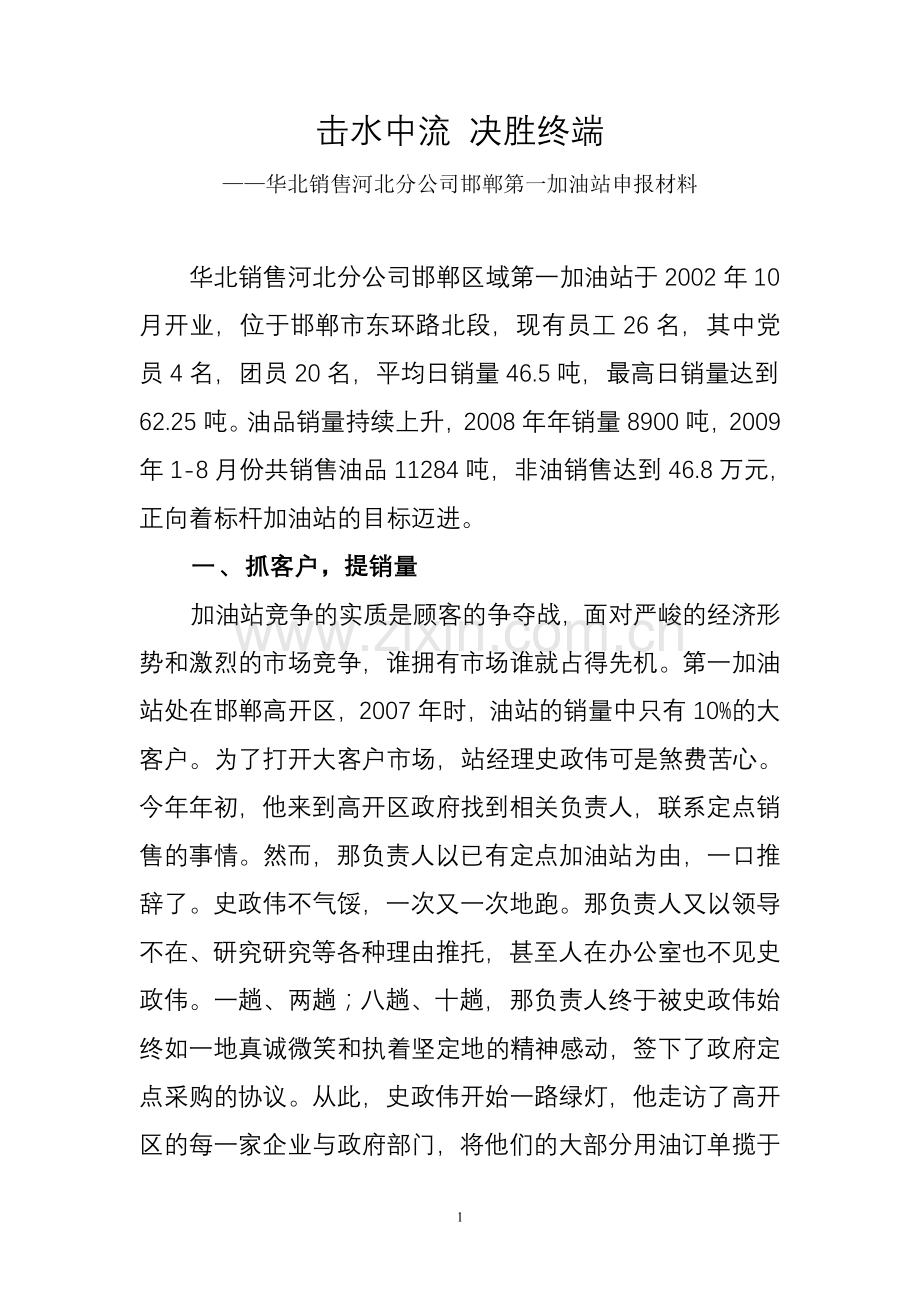 要与客户建立良好的合作关系,首先要做好沟通。邯郸一站全体员工从顾客的角度出发,聊一些司机师傅关心和感兴趣的话题,拉近关系,趁机向顾客介绍中国石油相关情况,增加顾客对中国石油的了解。同时,在站内增设急救箱、工具箱、针线包、擦鞋机、擦车洁具,为顾客提供免费加水、免费发送报刊、提供饮用热水等服务项目,为顾客提供增值服务。除了把这些基本服务落到实处外,全站员工还开展了为司机朋友清洗油箱盖的服务。小小一项举措,赢得了顾客的赞誉。夏日酷暑,他们熬制绿豆汤,端上一碗解暑;冬天严寒,奉上一杯热茶为顾客驱寒。灵活多变的促销措施和贴心、细心的服务,满足了顾客的要求,赢得了顾客的信赖。