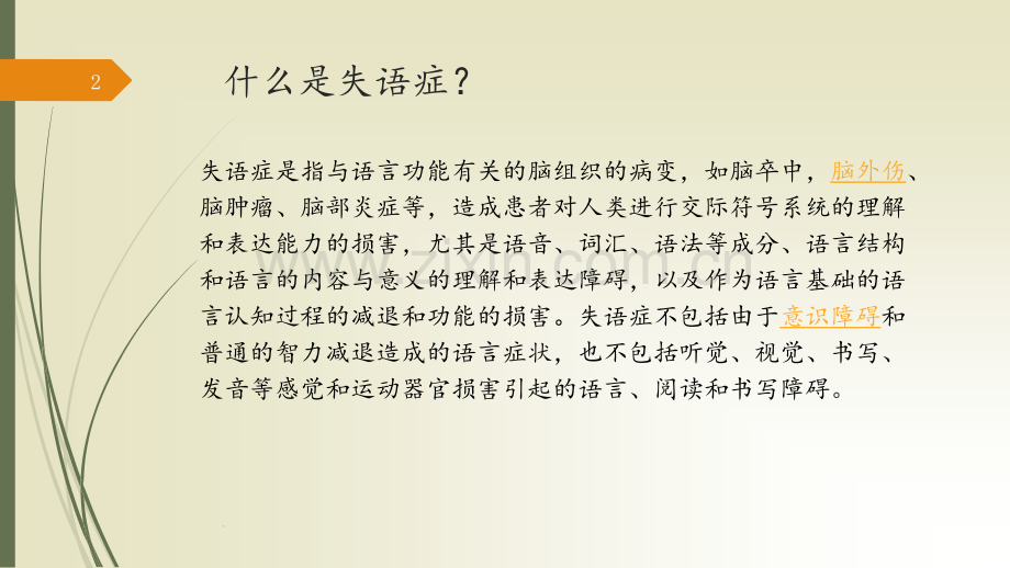 tDCS在失语症中的应用咸宁市中医医院 丁文妍1.什么是失语症?失语症是指与语言功能有关的脑组织的病变,如脑卒中,脑外伤、脑肿瘤、脑部炎症等,造成患者对人类进行交际符号系统的理解和表达能力的损害,尤其是语音、词汇、语法等成分、语言结构和语言的内容与意义的理解和表达障碍,以及作为语言基础的语言认知过程的减退和功能的损害。失语症不包括由于意识障碍和普通的智力减退造成的语言症状,也不包括听觉、视觉、书写、发音等感觉和运动器官损害引起的语言、阅读和书写障碍。2.经颅磁刺激(transcranial magnetic stimulation,TMS)和经颅直流电刺激(transcranial direct current stimulation,tDCS)是近10余年来快速发展的2项非侵入性脑刺激技术(noninvasive brain stimulation,NBS),因其可以促进或抑制大脑皮质的兴奋性,已被广泛应用于各种脑功能障碍的治疗。3.tDCS的原理经颅直流电刺激(transcranial direct currentstimulation,tDCS)是一种利用低强度恒定电流(12mA)来改变表面神经元膜电位的去极化或超极化方向,影响自发神经活动的皮质兴奋性改变的技术。4.tDCS的工作机制早期的动物和临床研究发现,直流电的阴极靠近神经细胞胞体或树突时,静息电位阈值升高,神经元放电减少,阳极使静息电位阈值降低,神经元放电增加。与TMS不同,tDCS并不诱导产生动作电位,它有神经调节效应(neuromodulation)5.tDCS的工作机制利用微弱电流(1-2 mA)调节大脑皮质神经细胞活动由阴极和阳极两个表面电极片构成阴极对大脑皮层起抑制作用,阳极对大脑皮层起兴奋作用刺激效果由电流强度、刺激部位、极片的面积和极性来决定6.tDCS对于血流的改变阳极刺激诱导区域性脑血流增加17.1%,当刺激停止时,血流量恢复到基线水平阴极刺激时诱导较小的血流增加(5.6%),停止刺激后血流量与基线比较显著降低(-6.5%),持续到刺激后期。7.tDCS定位原则tDCS 体表刺激部位(阳极)为左侧外侧裂周围区(见图)。体表定位采用 Rhoton(颅脑解剖与手术入路)的方法。外侧裂:鼻根与枕外隆凸连线的后四分之一的交点与目外眦的连线,止于乳突直上与其交点;8.颅骨定位-PPR(外侧裂周围区)9.使用恰当的电极位置,tDCS可以改变视觉、躯体感觉以及前额叶皮质神经元的兴奋性和功能特性;刺激外侧裂周区后部,可以增强语言处理能力;应用于运动和视觉皮质部,tDCS可以促进学习进程。10.颅骨定位-Broca区11.tDCS对图命名的作用-左Broca区Broca区在语言加工中起到重要作用。Baker研究对象为脑卒中后慢性失语症(10242个月)、含额叶损伤和非额叶损伤患者治疗1周(5d)阳极tDCS或1周假刺激合+语言治疗,休息7d,然后进行另一个治疗期刺激强度1mA,20min,作用电极位于左额叶皮层颅骨,参考电极位于右肩。12.tDCS对图命名的作用-左Broca区为了确保作用电极放置在结构完整的左额叶,将功能核磁共振检查正确命名时左额叶最高激活区为阳极刺激部位。在tDCS加语言治疗前后进行命名治疗项和非治疗项评价。结果显示,阳极tDCS言语治疗显著改善失语症患者的命名准确性。13.tDCS对听理解的作用研究者(You,2011)对卒中后亚急性期完全性失语症患者进行治疗一组电极为阴极位于CP6(右颞上区)一组电极为阳极位于CP5(左颞上区)假刺激时阳极放置于左颞上回,阴极置于对侧眶上区。随机分为三组,每组7例患者,接受不同刺激。每次刺激时患者接受常规语言治疗,共10次,每次30min 14.tDCS对听理解的作用西方失语症成套测验结果显示三组患者的失语商、自发言语和听词理解显著改善,这不能排除自发恢复的影响并发现右颞上区阴极C-tDCS较左颞上区阳极A-tDCS及假刺激对听理解的改善更显著。15.tDCS对听理解的作用这提示抑制右半球比激活损伤的左半球可以更好地促进听理解的恢复。阴极抑制右颞上区改善听理解,而阳极兴奋右PPR区就会降低听理解能力(汪洁等,2011)。这一现象可以用半球间经胼胝体去抑制解释,健侧Wernicke区的抑制性刺激降低了该区皮层兴奋性,通过缓解对损伤的Wernicke区的经胼胝体抑制,改善了理解能力。16.17.贺方娟,女,51岁,山东人,高中学历,强右利手。既往“高血压”病史。患者2015年6月3号晚一点多洗完脸回卧室途中突然昏迷,昏迷3天后醒转,说话含糊不清,只能听懂2-3字,家人基本靠猜测,右侧肢体偏瘫。临床检查语言表现为:听理解较好,自发言语较流畅,新词错语较多,复述较好,命名、阅读较差,朗读较好。影像学位置:左侧侧脑室旁,基底节区。损伤部位对言语功能情况分析:患者损伤部位主要在壳核和基底节靠后基底节内囊后肢,左侧侧脑室旁;其中影响言语的部位为壳核和基底节内囊后肢,壳核可能导致患者阅读理解障碍,内囊后肢可导致患者出现听理解障碍,出现一些新词和杂乱语;18.19.tDCS的适用范围肢体方面:肌张力、平衡失语症;吞咽障碍;认知障碍;认知-情绪视知觉和视空间抑郁症20.tDCS的禁忌症1.心脏起搏器2.脑刺激装置3.颅内金属植入装置,如动脉夹、颅骨修补4.脑室-腹腔分流术5.未得到良好控制的癫痫患者6.避免将电极安放至可能对脑干和小脑产生刺激的地方21.谢谢!22.