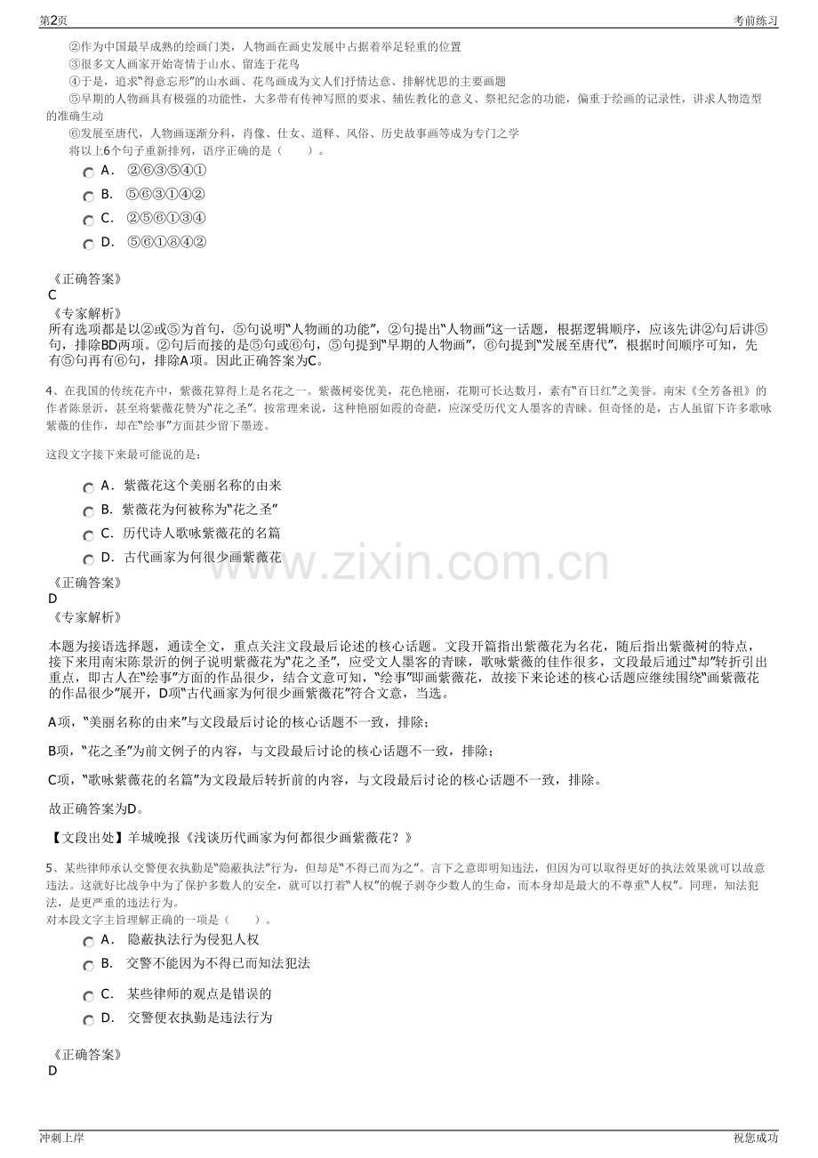 2024年福建周宁县自来水公司招聘笔试冲刺题(带答案解析)【下载须知】:1,本套练习包含以下题型:言语理解与表达题、常识判断题、数量关系题、判断推理题和资料分析题等题型;共135道。2、本套试题根据常见招考题总结归纳,主要用于练习答题思路和拓展知识面。3、本套试题非考试真题,且与福建周宁县自来水公司无关。一、第一部分言语理解与表达(本部分包括表达与理解两方面的内容。请根据题目要求,在四个选项中选出一个最恰当的答案。)1、在舆论生态、媒体格局深刻变化的形势下,受众的接受心理和阅读习惯也发生了深刻变化,不同的人有着不同的信息需求,呈现分众化、差异化的趋势。过去传统媒体时代,新闻舆论态势犹如一个大教室,媒体是雷打不动的信息中心;移动互联时代,新闻舆论态势则近乎游乐场,受众可以随兴趣任意选择内容和场景。要从媒体竞争中突围,在舆论引导中制胜,空洞说教、生硬灌输不行,追求猎奇、编造故事不行,刻意迎合、取悦受众不行,庸俗媚俗、极端表达也不行。创新理念、内容、体裁、形式、方法、手段、业态、体制和机制,才能提高媒体对受众的“黏度”。这段文字意在说明:A创新是媒体行业的发展要求 B传统媒体已无法满足大众需求 C舆论引导是媒体决胜的战略高地 D媒体组织机构之间的竞争异常激烈正确答案A专家解析文段开篇介绍在舆论生态、媒体格局深刻变化的形势下,不同的人有着不同的信息需求,呈现分众化、差异化的趋势这一背景,随后通过将“过去传统媒体时代”和“移动互联时代”不同的新闻态势作对比来说明要从媒体竞争中突围,在舆论引导中制胜不能胡编乱造、刻意迎合等。最后给出对策,即需要创新才能提高媒体对受众的“黏度”,对应A项。B项,偏离文段核心话题,文段重点为尾句的对策,即“创新”,且“传统媒体已无法满足大众需求”表述不明确,排除;C项,“舆论引导”偏离文段核心话题,排除;D项,“媒体组织机构之间的竞争异常激烈”为对策之前“移动互联时代”下的背景,非重点,排除。故正确答案为A。【文段出处】创新表达也是传播力2、下列语句中理解上会产生歧义的是:A我国的火箭目前只有一个名称,统一叫“长征”,如长征一号、长征二号、长征三号等,每个型号还根据发射的不同产品及轨道辅以ABCDE等系列。B清代李渔在美食鲜蔬中很是推崇蕈,他认为“食此物者,犹吸山川草木之气,未有无益于人者也”。C党的十九大闭幕不久,部分省市人大代表、政协委员就认真学习、座谈,畅谈自己的体会。D被雨水洗刷过的天空分外澄净,被雨水冲洗过的树木更显青翠。正确答案C专家解析C项,“部分”的修饰内容会产生歧义,可能是部分省市,也可能是省市的部分人大代表和政协委员,存在歧义,当选。A、B、D三项均无歧义,表述正确,排除。故正确答案为C。3、随着元朝之后文人画的兴起,偏重于追求“形似”的人物画遭遇冷落第1页考前练习冲刺上岸祝您成功作为中国最早成熟的绘画门类,人物画在画史发展中占据着举足轻重的位置很多文人画家开始寄情于山水、留连于花鸟于是,追求“得意忘形”的山水画、花鸟画成为文人们抒情达意、排解忧思的主要画题早期的人物画具有极强的功能性,大多带有传神写照的要求、辅佐教化的意义、祭祀纪念的功能,偏重于绘画的记录性,讲求人物造型的准确生动发展至唐代,人物画逐渐分科,肖像、仕女、道释、风俗、历史故事画等成为专门之学将以上6个句子重新排列,语序正确的是()。A B C D 正确答案C专家解析所有选项都是以或为首句,句说明“人物画的功能”,句提出“人物画”这一话题,根据逻辑顺序,应该先讲句后讲句,排除BD两项。句后而接的是句或句,句提到“早期的人物画”,句提到“发展至唐代”,根据时间顺序可知,先有句再有句,排除A项。因此正确答案为C。4、在我国的传统花卉中,紫薇花算得上是名花之一。紫薇树姿优美,花色艳丽,花期可长达数月,素有“百日红”之美誉。南宋全芳备祖的作者陈景沂,甚至将紫薇花赞为“花之圣”。按常理来说,这种艳丽如霞的奇葩,应深受历代文人墨客的青睐。但奇怪的是,古人虽留下许多歌咏紫薇的佳作,却在“绘事”方面甚少留下墨迹。这段文字接下来最可能说的是:A紫薇花这个美丽名称的由来 B紫薇花为何被称为“花之圣”C历代诗人歌咏紫薇花的名篇 D古代画家为何很少画紫薇花正确答案D专家解析本题为接语选择题,通读全文,重点关注文段最后论述的核心话题。文段开篇指出紫薇花为名花,随后指出紫薇树的特点,接下来用南宋陈景沂的例子说明紫薇花为“花之圣”,应受文人墨客的青睐,歌咏紫薇的佳作很多,文段最后通过“却”转折引出重点,即古人在“绘事”方面的作品很少,结合文意可知,“绘事”即画紫薇花,故接下来论述的核心话题应继续围绕“画紫薇花的作品很少”展开,D项“古代画家为何很少画紫薇花”符合文意,当选。A项,“美丽名称的由来”与文段最后讨论的核心话题不一致,排除;B项,“花之圣”为前文例子的内容,与文段最后讨论的核心话题不一致,排除;C项,“歌咏紫薇花的名篇”为文段最后转折前的内容,与文段最后讨论的核心话题不一致,排除。故正确答案为D。【文段出处】羊城晚报浅谈历代画家为何都很少画紫薇花?5、某些律师承认交警便衣执勤是“隐蔽执法