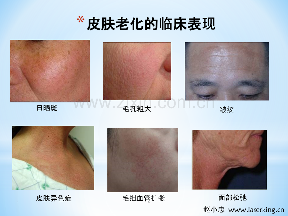 北京小忠丽格医疗美容医院赵小忠1 1.日晒斑毛孔粗大面部松弛*皮肤老化的皮肤老化的临床表床表现皱纹皮肤异色症毛细血管扩张赵小忠 2 2.赵小忠 3 3.赵小忠 4 4.*自然老化自然老化*伴随着机体老化的自然老化伴随着机体老化的自然老化过程。程。*皮肤松弛、皮肤松弛、皱纹增多加深、毛孔增大、皮肤增多加深、毛孔增大、皮肤纹理理变粗粗变乱、皮肤乱、皮肤弹性下降、毛性下降、毛发稀少、眉毛耳毛稀少、眉毛耳毛变长、指甲粗脆弱易断弯曲、老年斑增生、皮肤、指甲粗脆弱易断弯曲、老年斑增生、皮肤变薄、色薄、色泽变深、光深、光泽消失。消失。赵小忠 5 5.*光老化是指皮肤由于反复暴露于紫外光老化是指皮肤由于反复暴露于紫外线 而引起的而引起的结构和功能的特征性改构和功能的特征性改变。*粗大粗大皱纹、皮肤松弛、粗糙、增厚、斑、皮肤松弛、粗糙、增厚、斑点状色素沉着、毛点状色素沉着、毛细血管血管扩张、紫癜以、紫癜以及癌及癌变等。等。*皮肤光老化皮肤光老化 赵小忠 6 6.16位高加索裔演位高加索裔演艺明星明星13位黑人演位黑人演艺明星明星14位日本演位日本演艺明星明星20位中国演位中国演艺明星明星l面容的美丽三要素:1、轮廓(形状+丰满)2、五官(单个+搭配)3、皮肤(色泽+质地)三大治疗项目1、光电治疗2、肉毒毒素3、填充剂赵小忠 7 7.皮肤老化斑松弛毛孔粗大皱纹血管扩张容量减少赵小忠 8 8.*强脉冲光技脉冲光技术12345治疗方法老化表现赵小忠 9 9.12345治疗方法老化表现*RF赵小忠 1010.12345治疗方法老化表现*激光激光赵小忠 1111.有效的针对皮肤老化的各个层次全面抗衰老*抗衰老整体解决方案抗衰老整体解决方案针对皮肤、皮下脂肪、SMAS等多个层次的治疗赵小忠 1212.CO2Er:YAG1064nm1320nmIPL1550nm Fractional21st centuryEarly 1980sPDLSkin LaxityRF,IPL非剥脱非剥脱1440nm1440nmCAPCAP剥脱剥脱*光嫩光嫩肤的肤的历史史赵小忠 *强强脉冲光(脉冲光(脉冲光(脉冲光(IPLIPL)技)技)技)技术术反射反射反射反射镜镜线线性弧光灯性弧光灯性弧光灯性弧光灯滤滤光器光器光器光器导导光晶体光晶体光晶体光晶体赵小忠 *ST近近红外外紧肤光肤光改善皮肤松弛、改善皮肤松弛、细小小皱纹等皮肤老化等皮肤老化问题 7801800nm(主要集中在1300nm)近红外光是一种特殊的红外光源,其在皮肤的穿透深度是目前所有激光、光子设备中是最深的,介于非剥脱激光与射频之间,可有效加热真皮层,使胶原纤维收缩,并有效刺激新的胶原蛋白增生,使真皮层重新分布赵小忠 TitanXLTitanV 通过加热真皮刺激胶原 1100nm1800nm 钨灯较闪光灯脉宽更长(刺激胶原需要更长的脉宽)实时校准能量和治疗头温度 患者术后无须误工,可即刻化妆 Titan SpecificationsHandpieceHandpieceTitanSTitanVTitanXLWavelengthWavelength11001800nmFluenceRangeFluenceRange565J/550J/SpotSizeSpotSize1015mm10155mm10305mm赵小忠 *Dye-PL 染料光技染料光技术 疗效超越光子嫩肤的准激光技术赵小忠 .特制DPL晶体仅允许550650nm波段通过,同时使该波段获得最高的能量输出。波波长(nm)能能量量200 300 400 500 600 700 800 900 1000 1100 1200波波长(nm)200 300 400 500 600 700 800 900 1000 1100 12000能能量量550650nm*DPL通道通道赵小忠 .DPLDPL染料光染料光 vs.IPLvs.IPL光子光子IPL治治疗方案(方案(III型皮肤)型皮肤)能量30J 黑色素吸收强到弱 有效能量分散,治疗能量更高,深肤色治疗风险高Dye-PL治治疗方案(方案(III型皮肤)型皮肤)能量15J 黑色素强吸收段聚焦有效能量,总治疗能量更低,降低风险赵小忠 .基本思想是把一个连续的激光光斑分成一系列不连续的均匀分布的聚焦点阵。每个点的直径约为70-120微米。点与点的间隔远大于点的直径。在这些点上,能量密度很高,激光穿过表皮深入真皮,形成一系列柱状的微热带(MTZs),在此致热区域外,是未受影响的正常细胞。它们的再生功能,迅速启动修复机制。通过新生的角质,胶原和纤维细胞再生和迁移取代受损的组织。达到部分皮肤重塑,经重复治疗,最终达到嫩肤的目的。*fractional 激光技激光技术 赵小忠 2020.赵小忠 2121.*Fractional resurfacing 分分类*非剥脱性 Non-ablative:波长为14001600nm,穿透力比较深,只对真皮层有治疗作用,不汽化表皮。*微剥脱性 Micro-ablative:铒激光可以汽化表皮,起到皮肤浅表治疗的作用;又可以加热真皮层的胶原,起到紧肤效果。*剥脱性 Full ablative:CO2激光可以充分汽化表皮,且其热量可达真皮,起到对真皮层胶原加热的目的。赵小忠 2222.*像束激光像束激光 Pixel 2940nm for Fractional Ablative Skin RejuvenationPixel 2940nm for Fractional Ablative Skin Rejuvenation赵小忠 24mJ/50um13 mJ/50um赵小忠 *像束激光的像束激光的临床床应用范用范围*黄褐斑*改善细小皱纹*明显改善痤疮疤痕*快速皮肤收紧*显著提高皮肤的弹性和质地*恢复皮肤的健康状态*治疗光老化皮肤和色斑问题 适用于面部,颈部,胸部,手臂和手赵小忠 *1550nm光光纤激光激光*非剥脱型治疗系统*能完成部分剥脱型激光的功能*周围组织热损伤小,副作用轻*非接触式手柄*安全性高、效果极佳*休息时间短赵小忠 2626.赵小忠 2727.*Affirm点点阵激光激光激光类型:Nd:YAG Nd:YAG波 长:1440nm 1320nm脉 宽:3ms 3ms能量密度:8J/cm2 14J/cm2光斑尺寸:10mm 14mm重复频率:2Hz 1.5Hz 改善皱纹、治疗疤痕、紧致皮肤赵小忠 2828.ULTRAPULSE ENCORE CO2激光激光赵小忠 2929.*选择光斑光斑0.12mm1.25mm1.3 毫米的手具治疗快速,覆盖均匀