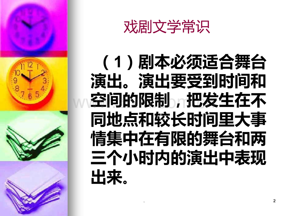 儿童戏剧文学1 1.戏剧文学常识 (1)剧本必须适合舞台演出。演出要受到时间和空间的限制,把发生在不同地点和较长时间里大事情集中在有限的舞台和两三个小时内的演出中表现出来。2 2.(2)必须有集中尖锐的矛盾冲突。戏剧是反映现实生活中的矛盾冲突的,没有矛盾冲突就没有戏剧。这中冲突是社会矛盾的反映,它有一定的发展过程,这个过程就构成了剧本的情节结构。3 3.剧本的情节结构可分为:开端发展高潮结局4 4.儿童戏剧文学和儿童戏剧是密切关联而又有区别的两个概念。它们的区别就像建筑蓝图和建筑物的区别一样。5 5.儿童戏剧的概念儿童戏剧是以少年儿童为观众、适合于少年儿童接受能力和欣赏趣味的戏剧。6 6.儿童戏剧文学剧本,是儿童戏剧的文学因素,也是儿童文学的一种重要体裁样式,它主要为舞台演出提供脚本,同时也供少年儿童阅读7 7.在这一点上,儿童剧剧本儿童戏剧文学具有双重性:即具有作为演出脚本的戏剧性与作为阅读欣赏对象的文学性。8 8.一、结构主线单纯、清晰 儿童戏剧的观众主要是少年儿童,他们受年龄限制,具有自我控制能力差、注意力容易迁移、理解力相对偏弱的特点。如果剧情展开前铺垫过多或者情节线索繁复多变,很容易使他们失去耐心,感到厌烦。9 9.因此,儿童戏剧的结构主线应该追求单纯,各个环节的衔接要紧凑,层次应清楚,不能像成人剧那样有主线、副线、明线、暗线。当然,线索单纯并不等于单薄、简陋。相反,情节要求曲折起伏、疏密相间.1010.n n以小熊拔牙为例,全剧只有一条线索,即小熊拔牙的因果始末,层次清楚,一目了然。不过,剧中情节安排了四起四伏:小熊牙疼一起,遇到了兔医生一伏;兔医生拔不动牙齿二起,小狗帮忙二伏;拔不掉三起,小猫也来帮忙三伏;巧妙。1111.n n牙齿夹碎了,还是拔不动四起,呼叫小鸟来帮忙拔掉了。从几起几付中,可以看出情节不是平行的,而是逐步上升、发展的。起,一次比一次紧张着急;付,一次比一次松弛。有密有疏,安排得非常恰当。1212.二、情节生动,故事性强。儿童总是习惯于在故事的发展过程中逐渐认识人物、理解剧情。而且,儿童对一切新异事物都感兴趣,剧情以外的任何异常声响都有可能分散他们的注意力。因此要使他们专注于舞台演出,必须注重以生动曲折的故事情节来吸引他们。1313.儿童戏剧文学要在有限的篇幅中展开故事情节,就必须抓住主要矛盾,突出主要事件,使事件、人物之间的矛盾得到充分的揭示,并节奏紧凑地把矛盾推向高潮,直至解决。1414.n如小熊拔牙,通过小熊不顾妈妈的叮嘱不去刷牙,又偷吃蜜糖、果酱,最后牙齿变坏疼痛,几经辛苦才将牙齿拔掉,把小熊不听话,挑食,任性的特点鲜明生动地表现了出来。1515.剧情很简单,但矛盾冲突明快、尖锐,1、有小熊与熊妈妈之间的矛盾冲突,2、更有小熊与兔医生以及其他小动物之间的冲突,3、更有小熊不肯刷牙,又自以为聪明的自身性格心理冲突。这些戏剧冲突符合儿童的审美特点,对孩子们有着强烈的吸引力和感染力。1616.三、内容富于情趣性,动作性突出儿童戏剧要激起儿童的浓厚兴趣,必须反映儿童情趣。儿童情趣是使儿童看得津津有味的重要因素,也是儿童戏剧塑造为孩子所喜爱的舞台形象的手段之一。儿童情趣不能单纯地理解为逗孩子乐,而是指儿童的性情志趣及其独特的表达方式。1717.情趣性不但应该服从于剧作的思想内容,而且应该水乳交融地渗透在整个文学作品中。诸如奇特的情节、幽默的对话、曲折的冲突、绚丽的场景、缤纷的灯光、美妙的音乐、婀娜的舞姿等,处理精当,都会使儿童戏剧情趣横溢、富有魅力。1818.在小熊拔牙中有大量情趣十足的戏剧情节,1、如小熊用脑袋把妈妈往门口顶,2、妈妈疼爱的戳一下他的额头;3、小熊偷吃蜂蜜果酱,一勺、一盘、一大碗,吃完挨个舔三舔;4、兔医生搬板凳给小熊打麻药等等,这些情节有趣可笑,对儿童颇具吸引力。1919.n n儿童天性好动活泼,喜欢富有动感的场景,因而儿童戏剧对动作性的要求比一般戏剧更为突出,而且要富有童趣。如小熊在妈妈出门后高兴地唱起歌:“答应过妈妈洗脸呀!先洗洗小熊眼,再擦擦熊嘴巴;熊鼻子抹一抹,熊耳朵拉两拉;熊头发梳三下,嗯,就不爱刷牙。”2020.通过简单的几句话,洗洗、擦擦、抹一抹、拉两拉等一系列动感、强烈的词,一个活泼、调皮的顽童形象跃然纸上。2121.四、人物性格个性化,语言简洁口语化。儿童戏剧文学是通过剧中人物的语言和动作来表现矛盾冲突、塑造艺术形象、揭示思想和主题的。因此人物语言台词和动作,应该是典型的、儿童化的。2222.但是,语言和动作的儿童典型性并不是指矫揉造作、生搬硬套的“娃娃腔”,而是指经过精心提炼的、充分体现儿童特点的、生动活泼的戏剧语言和动作。2323.n n如小熊拔牙中的台词:n n妈妈:我是狗熊妈妈。n n小熊:我是狗熊娃娃。n n妈妈:我长得又胖又大。n n小熊:我就像我妈妈。2424.n n短短的四句话,不仅清楚地交待了人物的彼此关系以及外形特征,而且小熊模仿妈妈的滑稽可笑样儿也和盘托出。母子俩边说边演,情趣盎然。语言因与和谐,活泼形象,通俗晓畅,肯定受到小孩子们的喜爱。2525.儿童戏剧文学的分类儿童戏剧文学有多种不同的分类:按其容量、场次来分,有多幕剧和独幕剧、活报剧(不分幕,以简便的戏剧形式报道当前发生的重大事件);从题