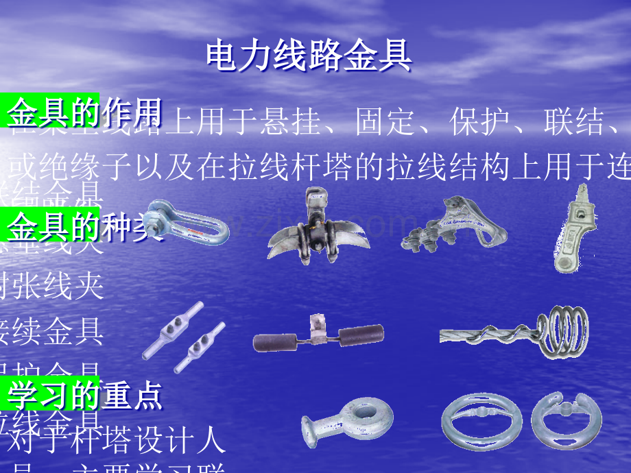 电力线路金具电力线路金具电力杆塔设计课程系列电力线路金具电力线路金具联结金具悬垂线夹耐张线夹接续金具保护金具拉线金具在架空线路上用于悬挂、固定、保护、联结、接续架空线或绝缘子以及在拉线杆塔的拉线结构上用于连接拉线的金属器件。金具的作用金具的作用金具的种类金具的种类学习的重点学习的重点对于杆塔设计人员,主要学习联结金具为主,其它要做相应了解(一)联结金具(一)联结金具联结金具的作用联结金具的作用将悬式绝缘子组装成串,并将一串或数串绝缘子串连接,悬挂在杆塔横担上。联结金具分为专用联结金具和通用联结金具两类。(1 1)专用联结金具)专用联结金具是直接用来连接绝缘子的,其连接部位的结构尺寸与绝缘子相配合。球头挂环 碗头挂板 直角挂环 直角挂板(2 2)通用联结金具)通用联结金具用于将绝缘子组成两串、三串或更多串数,并将绝缘子与杆塔横担或与线夹之间相连接也用来将地线禁固或悬挂在杆塔上,或将拉线固定在杆塔上等。U型挂环 U型挂板 直角挂板 平行挂板球头挂球头挂环环U形挂形挂环环碗头挂碗头挂板板碗头挂碗头挂板板联结金具图片型号 主要尺寸(C)主要尺寸(M)主要尺寸(D)主要尺寸(H)主要尺寸(R)破坏荷重(KN)重量(kg)U-7 20 16 16 60 22 70 0.5 U-7B 20 16 16 80 22 70 0.6 U-10 22 18 18 70 24 100 0.6 U-10B 22 18 18 85 23 100 0.7 U-12 24 22 20 80 30 120 1.0 U-16 26 24 22 90 32 160 1.5 U-16T 28 24 22 90 32 160 1.5 U-20 30 27 24 100 36 200 2.3 U-20B 30 27 24 115 36 200 2.4 U-25 34 30 26 110 40 250 2.8 U-30 38 36 30 130 46 300 3.7 U-50 34 42 36 150 55 500 7.0 U型挂环型挂环主要用于耐张塔,可做耐张串或跳线串连塔金具,偶尔也用于直线塔中。直角挂板(挂板(Z型)型)型号 主要尺寸(C1)主要尺寸(C2)主要尺寸主要尺寸(M)主要尺寸(H)破坏荷重(kN)重量(kg)Z-7 18 18 16 60 70 0.6 Z-7B 20 18 16 80 70 0.7 Z-10 20 20 18 70 100 0.8 Z-10B 20 20 18 80 100 0.9 Z-12 24 24 22 80 120 1.3 Z-16 26 26 24 90 160 2.5 Z-16C 26 26 24 140 160 3.2 Z-16C 26 26 24 170 160 3.8 Z-20 30 30 27 120 160 3.5 Z-25 34 34 30 110 250 3.8 平行挂板(挂板(P型)型)型号型号 主要尺寸(b)主要尺寸(C)主要尺寸主要尺寸(M)主要尺寸(H)破坏荷重(kN)重量(kg)P-7 6 18 16 60 70 0.6 P-10 8 20 18 70 100 0.9 P-12 10 24 22 80 120 1.5 P-16 12 26 24 90 160 2.4 P-20 14 30 27 120 200 4.1 P-30 16 38 36 120 300 4.7 平行挂板(挂板(PS型)型)型号CatalogNo.主要尺寸Dimensions(mm)标称破坏载荷Rated Failingload(kN)重量Weight(kg)CbMhPS-71816169020700.60PS-1020201890201000.80PS-1220202295241201.50PS-16262424155261602.70PS-30383436140393005.30型号CatalogNo.主要尺寸Dimensions(mm)标称破坏载荷Rated Failing load(kN)重量Weight(kg)CMh1h2X向Y向Z向U-188080189060183.5350.83U-2080802010070244.9471.08U-2280802211890286.5571.30UJ-1880801810550185.3350.85UJ-208080201200247.4471.10UJ-22808022127652810.8571.40U形螺丝 型号CatalogNo.主要尺寸Dimensions(mm)标称破坏荷重Rated FailureLoad(kN)重量Weight(kg)abdh1h2ZH-7241616579520700.85ZH-1024161855100201001.12ZH-1224162065103241201.20ZH-1626182275135261601.80直角挂环UB挂板型号CatalogNo.主要尺寸Dimensions(mm)标称破坏载荷Rated Failingload(kN)重量Weight(kg)CMhaUB-6-120166530700.82UB-9-1201865401001.20UB-7G20166540700.80型号catalogNO.主要尺寸dimensions(mm)破坏荷重rated failure load(KN)参考重量weight(kg)CMhabUB-71616704565700.75UB-1020188045651001.08UB-12242210060801202.82UB-162624100601001602.89UB-20302711060/721002003.80UB-25T343015060/72902504.80UB-30T393615060/801003005.00ZBS挂板 型号CatalogNo.主要尺寸Dimensions(mm)标称破坏载荷Rated Failingload(kN)重量Weight(kg)CMbhZBS-6-12218163070701.8ZBS-12-126241844851203.8ZBS-15-128261844851504.1碗头挂板碗头挂板型号 适用绝缘子 主要尺寸(C1)主要尺寸(C2)主要尺寸(H)主要尺寸(D)主要尺寸(B)破坏荷重(kN)重量(kg)W-7A XP-7 XP-4.5 19.2 34.5 70 20 16 70 0.8 W-7B XP-7 X-4.5 19.2 34.5 115 20 16 70 0.9 W-10 XP-16 19.2 34.5 85 20 18 100 1.0 型号 适用绝缘子 主要尺寸mm(C)主要尺寸mm(C1)主要尺寸mm(C2)主要尺寸mm(M)主要尺寸mm(H)破坏荷重(kN)重量(kg)WS-7 XP-7 18 19.2 34.5 16 70 70 1.0 WS-10 XP-10 20 19.2 34.5 18 85 100 1.2 WS-16 XP-16 26 23.0 42.5 24 95 160 2.6 WS-20 XP-20 30 27.5 51.0 27 100 200 4.3 W-21D XP-21 30 23.0 42.5 27 100 210 4.5 WS-30 XP-30 36 27.5 51.0 36 110 300 5.7W型WS型型号 适用导线范围mm 主要尺寸(D1)主要尺寸(D2)主要尺寸(D)主要尺寸(B)主要尺寸(H1)主要尺寸(H2)破坏荷重(kN)重量(kg)Q-7 XP-7 33.3 17 22 16 50 13.4 70 0.3 QP-7 XP-7 X-4.5 33.3 17 20 16 50 13.4 70 0.3 QP-10 XP-10 33.3 17 20 16 50 13.4 100 0.3 QP-16 XP-16 41.0 21 26 20 60 19.5 160 0.5 QP-20 XP-20 49.0 25 30 24 80 21.0 200 1.0 QP-21D XP-21 41.0 21 29 24 70 19.5 210 1.1 QP-30 XP-30 49.0 25 39 30 80 21.0 300 1.0 型号 适用绝缘子 主要尺寸(H1)主要尺寸(H2)主要尺寸(H3)主要尺寸(R)主要尺寸(D)主要尺寸(B)破坏荷重(kN)重量(kg)QH-7 XP-7 13.4 114 57 11 17 16 70 0.6 球头挂环球头挂环 延长环(环体整锻)延长环(环体整锻)型号 主要尺寸(C)主要尺寸(D)主要尺寸(L)破坏荷重(KN)重量(kg)PH-7.D 20 16 80 70 0.4 PH-10.7D 22 18 100 100 0.6 PH-12.D 24 20 120 120 0.9 PH-16.D 26 22 140 160 1.5 PH-20.D 30 24 160 200 1.6 PH-25.D 34 26 160 250 2.0 PH-30.D 38 30 180 300 3.0 联板联板 型号 主要尺寸(B)主要尺寸(H)主要尺寸(D1)主要尺寸(D2)主要尺寸(L)破坏荷重(KN)重量(kg)L-1040 16 70 20 18 400 100 4.5 L-1240 16 70 24 18 400 120 4.7 L-1640 18 100 26 20 400 160 5.9 L-2140161002018400L-2540161102418400L-3040 18 110 26 20 400 160 5.9 LV型联塔挂板型号CatalogNo.主要尺寸Dimensions(mm)标称破坏载荷Rated Failingload(kN)重量Weight(kg)BHMLL1LT-1618261002480201603.5LT-3032391003680253006.8EB-50D343912536116255001