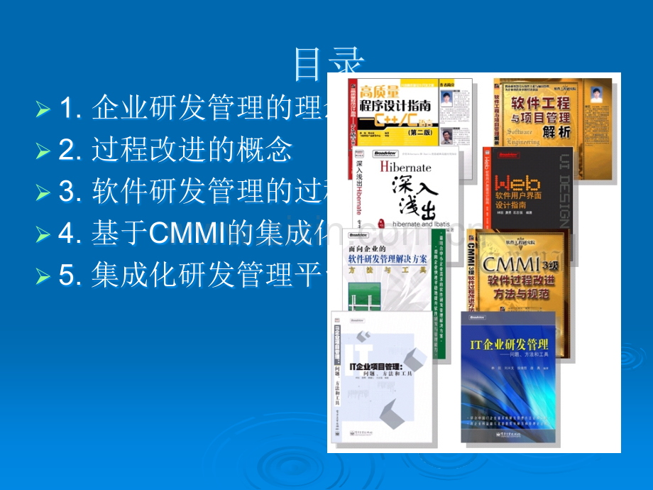 http:/ 上上 海海 漫漫 索索 计计 算算 机机 科科 技技 有有 限限 公公 司司基基 于于 CMMI 的的集成化集成化软件研件研发流程和管理平台流程和管理平台林林锐博士博士目录1.企业研发管理的理念2.过程改进的概念3.软件研发管理的过程改进方法4.基于CMMI的集成化软件研发流程IDP5.集成化研发管理平台RDMS1.企业研发管理的理念l l企企企企业业业业的的的的根根根根本本本本目目目目标标标标是是是是“合合合合法法法法地地地地赚赚赚赚取取取取尽尽尽尽可可可可能能能能多多多多的的的的利利利利润润润润,使使使使企企企企业业业业整整整整体体体体利利利利益益益益最最最最大大大大化化化化”。企企业业所所有有的的特特定定目标和行动(例如研发、营销等)都是围绕根本目标开展的,不能和根本目标抵触。目标和行动(例如研发、营销等)都是围绕根本目标开展的,不能和根本目标抵触。l l企业研发管理的指导思想是:企业研发管理的指导思想是:关注结果,重视过程关注结果,重视过程关注结果,重视过程关注结果,重视过程。“关注结果关注结果”是指:以最终产品获得的经济效益来衡量研发业绩,追求利益最大化。是指:以最终产品获得的经济效益来衡量研发业绩,追求利益最大化。“重视过程重视过程”是指:将期望的成果分解到每个过程域(即工作环节)去实现,努力把每是指:将期望的成果分解到每个过程域(即工作环节)去实现,努力把每项工作做好,从而得到好的成果。项工作做好,从而得到好的成果。l l衡量研发工作优劣的三个关键指标是:质量、生产率和成本。衡量研发工作优劣的三个关键指标是:质量、生产率和成本。衡量研发工作优劣的三个关键指标是:质量、生产率和成本。衡量研发工作优劣的三个关键指标是:质量、生产率和成本。l l企业研发管理的基本目标:让所有人员有条不紊地开展工作,在预定的时间和成本之内,开发企业研发管理的基本目标:让所有人员有条不紊地开展工作,在预定的时间和成本之内,开发完成质量合格的产品,从而使企业和个人获得预定的利益。完成质量合格的产品,从而使企业和个人获得预定的利益。l l企业研发管理的奋斗目标:调动一切积极因素,努力提高产品质量、提高工作效率并且降低成企业研发管理的奋斗目标:调动一切积极因素,努力提高产品质量、提高工作效率并且降低成本,使企业和个人获得比预定目标更多的利益。本,使企业和个人获得比预定目标更多的利益。l l企业里大部分工作是成熟的,有现成的模式可以套用,这类工作应当靠流程制度来管理,可比企业里大部分工作是成熟的,有现成的模式可以套用,这类工作应当靠流程制度来管理,可比喻为喻为“法治法治”。企业中还有一部分工作可能是独特的,并不适宜套用流程制度(也可能没有流。企业中还有一部分工作可能是独特的,并不适宜套用流程制度(也可能没有流程制度可以套用),相关人员要当机立断、高效地处理问题,可比喻为程制度可以套用),相关人员要当机立断、高效地处理问题,可比喻为“人治人治”。l l一般地,企业既需要大量的一般地,企业既需要大量的一般地,企业既需要大量的一般地,企业既需要大量的“法治法治法治法治”管理方式,又需要小量的管理方式,又需要小量的管理方式,又需要小量的管理方式,又需要小量的“人治人治人治人治”管理方式。通常前者约管理方式。通常前者约管理方式。通常前者约管理方式。通常前者约占占占占60-80%60-80%,而后者约占,而后者约占,而后者约占,而后者约占20-40%20-40%。“法治法治法治法治”和和和和“人治人治人治人治”结合使用是企业管理的重要手段。企业结合使用是企业管理的重要手段。企业结合使用是企业管理的重要手段。企业结合使用是企业管理的重要手段。企业领导要关注两点:一是建立合适的流程制度(实现良好的法治);二是使用合适的人(实现良领导要关注两点:一是建立合适的流程制度(实现良好的法治);二是使用合适的人(实现良领导要关注两点:一是建立合适的流程制度(实现良好的法治);二是使用合适的人(实现良领导要关注两点:一是建立合适的流程制度(实现良好的法治);二是使用合适的人(实现良好的人治)。好的人治)。好的人治)。好的人治)。l l国内大部分国内大部分ITIT企业的研发管理现状是:企业的研发管理现状是:“法治法治”太少,混乱的太少,混乱的“人治人治”太多。阻碍国内太多。阻碍国内ITIT企业企业发展的瓶颈问题通常不是技术问题,而是杂乱无章的管理。发展的瓶颈问题通常不是技术问题,而是杂乱无章的管理。2.过程改进的概念2.1 2.1 什么是过程?什么是过程?l l人们使用合适的方法、技术、工具才能开发出用户需要的产品。过程是指人们使用合适的方法、技术、工具才能开发出用户需要的产品。过程是指“人,方法,技术和人,方法,技术和工具工具”的集合。的集合。l l过程被写成文档后,变成了公司的过程被写成文档后,变成了公司的“流程制度流程制度”,公司成员们依据,公司成员们依据“流程制度流程制度”开展工作,这开展工作,这叫叫“法治管理法治管理”。人员方法技术产品工具过程过程2.过程改进的概念2.2 2.2 过程与产品有什么关系?为什么要重视过程?过程与产品有什么关系?为什么要重视过程?l l软件产品不能靠人