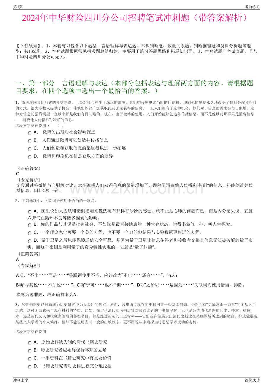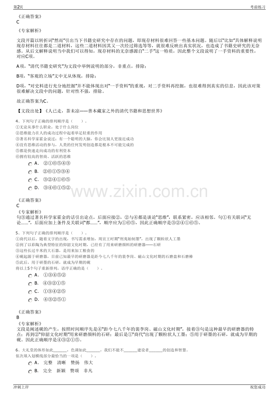 2024年中华财险四川分公司招聘笔试冲刺题(带答案解析)【下载须知】:1,本套练习包含以下题型:言语理解与表达题、常识判断题、数量关系题、判断推理题和资料分析题等题型;共135道。2、本套试题根据常见招考题总结归纳,主要用于练习答题思路和拓展知识面。3、本套试题非考试真题,且与中华财险四川分公司无关。一、第一部分言语理解与表达(本部分包括表达与理解两方面的内容。请根据题目要求,在四个选项中选出一个最恰当的答案。)1、微博连同其他形式的社交网络,已经对社会产生了深远的影响,其影响程度堪比当时的印刷机。印刷机的出现永久地改变了信息分配和获取的方式,给大多数人提供了机会,使他们能够广泛获取此前无法获得的信息。一旦人们拥有了这种机会,他们对于信息的需求会与日俱增,这种对信息的强烈渴望一直以来都是我们有目共睹的。现在,由于微博的使用,人们开始能够创造并传播信息,而不是像以前那样只是消费信息消费他人传播和“控制”的信息。这段文字意在说明()。A 微博的出现对社会影响深远 B 人们通过微博可以创造并传播信息 C 人们制造和获取信息的渠道得以进一步拓展 D 微博和印刷机在信息获取方面的差异正确答案C专家解析文段通过将微博与印刷机对比,意在说明人们获得信息的渠道增加了,即除了消费他人传播和“控制”的信息,还能创造并传播信息。因此C项正确。2、下列选项中,关联词语使用不恰当的一项是:A医生说如果皮肤粗糙到摸起来像洗碗布那样有沙沙的感觉,就不止是心肺的问题而已,而是内分泌失调、五脏六腑气血循环不良等诸多因素的影响。B你的作品与其说是批判社会,不如说是最直接地表达一种生存状态。说得书卷气一些,叫人生探索。C一个理论家宁可要一个美的方程,也不要一个丑的但结果与实验数据更相近的方程。D量子卫星之所以能保障通信安全可靠,是因为量子卫星让信息传递者和接收者交换令信息无法被破解的量子密钥,而这个密钥是利用量子的奇异特性实现的,它就是“量子纠缠”。正确答案A专家解析A项,“不止而是”关联词使用不当,应该改为“不止还有”,当选;B项“与其说不如说”、C项“宁可也不”“但”、D项“之所以是因为”关联词均使用恰当,排除。本题为选非题,故正确答案为A。3、尽管书籍史已日渐成为历史研究中为人关注的焦点,然而,若想通过现存的史料回答一些基本问题,仍然会有“更隔蓬山一万重”的无从入手之感,这种无奈感来自现存材料的特质。比如,在讨论清代江南书店针对普通读者的售书情况时,无论是各类清代遗留的刊本、抄本、精校本,还是清代文人和收藏家编写的各类书目,都是经过筛选的二道材料它们或许能展示出清代出版业在某些领域所达到的极致,抑或能展现某些文人学者的个人偏好,但却不能说明当时一般的出版状态,更不用说从中窥探当时思想学术变动的走势。这段文字意在说明:A原始史料缺失制约清代书籍史研究 B历史研究者应始终保持客观的立场 C一手资料在书籍史研究中有重要价值 D书籍史研究需对史料进行充分地挖掘第1页考前练习冲刺上岸祝您成功正确答案C专家解析文段开篇以转折词“然而”引出当下书籍史研究中存在的问题,即现存材料很难回答一些基本问题。随后以“比如”具体解释说明现存材料往往都是二道材料,这些二道材料因其又一次经过筛选等等,就很难反映出真实状况,也造成了书籍史研究的无奈感。从后文解释说明当中我们可以得知,现存材料的无奈感源自“二手”这一特质,因此整个文段说明了一手资料的重要性,对应C项。A项,“清代书籍史研究”为文段中举例说明的部分,非重点,排除;B项,“客观的立场”文中无从体现,排除;D项,“对史料进行充分地挖掘”并不能体现出对“一手资料”的重视,对二手资料再挖掘,也很难得到真实的信息,因此该对策很难解决文段中的问题,针对性不强,排除。故正确答案为C。【文段出处】人已走,茶未凉善本藏家之外的清代书籍和思想世界4、下列句子正确的排列顺序是()。无论从事什么职业,处于什么岗位思维能力在人的成功过程中起着举足轻重的作用著名科学家霍金说过:有一个聪明的大脑,你会比别人更接近成功没有思维活动的参与,人类的任何发明创造都是根本不可能完成的都是快速走向成功的有利资本拥有较高的智商、活跃的思维 A B C D 正确答案C专家解析句通过著名科学家霍金的话引出论点,后面应接,与都是谈论“思维”,联系紧密,应该相邻。句有关联词“无论”,后面应加上条件及关联词“都”,顺序应为,因此正确顺序是。5、下列句子正确的排列顺序是()。商代以后,随着文字的出现,书写需求增加,周宣王时期“刑夷始制墨”,出现了颗粒状人工墨到了以彩陶为典型特征的仰韶文化时期,已经有了用来研磨颜料的研磨器石研这些长过半米的大石器,是用来加工粮食的砚起源于研磨器,目前已知最早的研磨器是距今七八千年的裴李岗、磁山文化时期的石磨盘和石磨棒此后,用于研墨的石研,就成为早期的砚将以上5个句子重新排列,语序正确的是()。A B C D 正确答案B专家解析文段是阐述砚的产生,按照时间顺序先是“距今七八千年的裴李岗、磁山文化时期”,接着句是这种最早的研磨器的特点;再到“仰韶文化时期”用来研磨颜料的石研;最后是“商