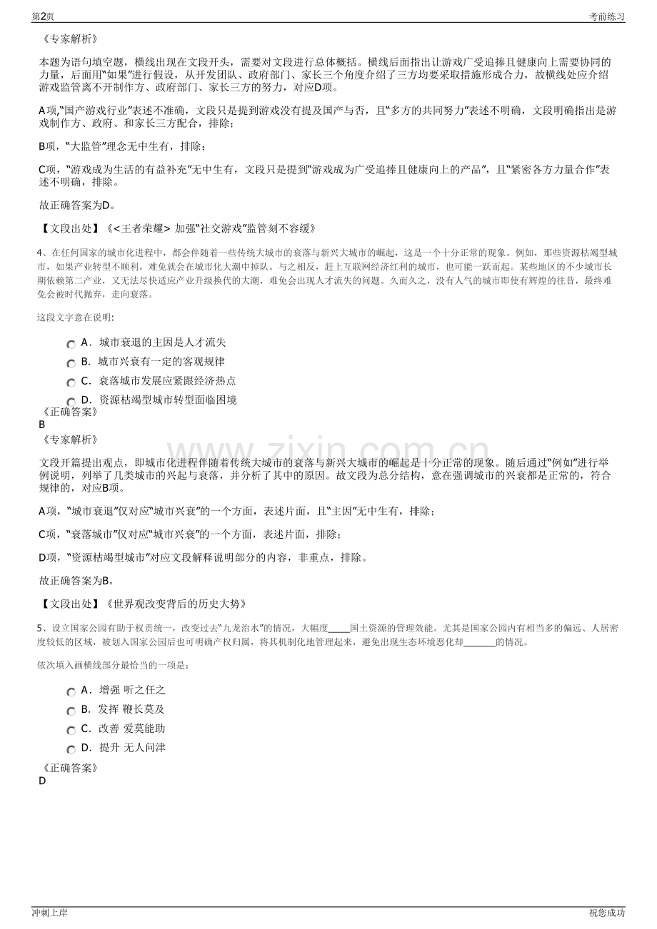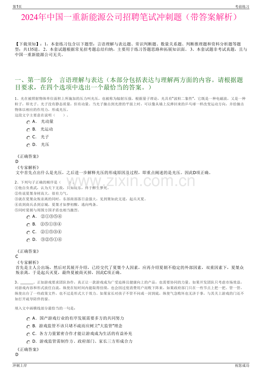 2024年中国一重新能源公司招聘笔试冲刺题(带答案解析)【下载须知】:1,本套练习包含以下题型:言语理解与表达题、常识判断题、数量关系题、判断推理题和资料分析题等题型;共135道。2、本套试题根据常见招考题总结归纳,主要用于练习答题思路和拓展知识面。3、本套试题非考试真题,且与中国一重新能源公司无关。一、第一部分言语理解与表达(本部分包括表达与理解两方面的内容。请根据题目要求,在四个选项中选出一个最恰当的答案。)1、光在被照射物体单位面积上所施加的压力叫光压,也被称为辐射压强。根据量子理论,光具有“波粒二象性”,它既是一种电磁波,又是一种粒子,即光子。光子没有静态质量,但有动量。当光子撞击到光滑的平面上时,可以像从墙上反弹回来的乒乓球一样改变运动方向,并给撞击物体以相应的作用力,形成光压。这段文字主要意在说明()。A 光动量 B 光运动 C 光子 D 光压正确答案D专家解析文中首先点出什么是光压,之后进一步解释光压的形成原因及过程,即重点阐述的是光压。因此D项正确。2、下列句子正确的顺序是()。他自负勇武,认为天下无敌,只知玩乐,终于醉生梦死。传说夏桀身材高大,很有力气。就在夏桀众叛亲离的同时,东部商部落日益强大,见到桀如此无道,起兵灭夏。直到商兵杀到京城,夏桀才如梦初醒,逃向鸣条。同时夏朝与周围方国矛盾也相当激烈。A B C D 正确答案C专家解析首先是主人公出场,然后对其展开介绍,已经交代了夏桀个人因素,应再介绍夏朝不稳定的外部因素,双重因素下,夏桀众叛亲离,于是起兵灭夏,最终夏被商灭掉,因此C项正确。3、。正如游戏要求团队协作,真正让一款游戏成为广受追捧且健康向上的产品,也需要协同的力量。如果开发团队只考虑市场效益,对游戏内容和形式放任自流,纵使在短时间内能取得佳绩,也会因过度消费用户而败下阵来。如果政府部门只在一些节点上把一把、管一管,纵使出台了一些政策文件,也不过是形式大于效力。如果家长对孩子不管不问或一封到底,纵使气急败坏也无济于事,与其关上游戏的门还不如打开疏导陪伴的窗。填入文中画横线部分最恰当的一句是:A国产游戏行业的有序发展需要多方的共同努力 B游戏监管不该只堵不疏而应树立“大监管”理念 C各方力量紧密合作才能让游戏成为生活的有益补充 D游戏监管需制作方、政府部门、家长三方形成合力正确答案D第1页考前练习冲刺上岸祝您成功专家解析本题为语句填空题,横线出现在文段开头,需要对文段进行总体概括。横线后面指出让游戏广受追捧且健康向上需要协同的力量,后面用“如果”进行假设,从开发团队、政府部门、家长三个角度介绍了三方均要采取措施形成合力,故横线处应介绍游戏监管离不开制作方、政府部门、家长三方的努力,对应D项。A项,“国产游戏行业”表述不准确,文段只是提到游戏没有提及国产与否,且“多方的共同努力”表述不明确,文段明确指出是游戏制作方、政府、和家长三方配合,排除;B项,“大监管”理念无中生有,排除;C项,“游戏成为生活的有益补充”无中生有,文段只是提到“游戏成为广受追捧且健康向上的产品”,且“紧密各方力量合作”表述不明确,排除。故正确答案为D。【文段出处】加强“社交游戏”监管刻不容缓4、在任何国家的城市化进程中,都会伴随着一些传统大城市的衰落与新兴大城市的崛起,这是一个十分正常的现象。例如,那些资源枯竭型城市,如果产业转型不顺利,难免就会在城市化大潮中掉队。与之相反,赶上互联网经济红利的城市,也可能一跃而起。某些地区的不少城市长期依赖第二产业,又无法尽快适应产业升级换代的大潮,难免会出现人才流失的问题。久而久之,没有人气的城市即使有辉煌的往昔,最终难免会被时代抛弃,走向衰落。这段文字意在说明:A城市衰退的主因是人才流失 B城市兴衰有一定的客观规律 C衰落城市发展应紧跟经济热点 D资源枯竭型城市转型面临困境正确答案B专家解析文段开篇提出观点,即城市化进程伴随着传统大城市的衰落与新兴大城市的崛起是十分正常的现象。随后通过“例如”进行举例说明,列举了几类城市的兴起与衰落,并分析了其中的原因。故文段为总分结构,意在强调城市的兴衰都是正常的,符合规律的,对应B项。A项,“城市衰退”仅对应“城市兴衰”的一个方面,表述片面,且“主因”无中生有,排除;C项,“衰落城市”仅对应“城市兴衰”的一个方面,表述片面,排除;D项,“资源枯竭型城市”对应文段解释说明部分的内容,非重点,排除。故正确答案为B。【文段出处】世界观改变背后的历史大势5、设立国家公园有助于权责统一,改变过去“九龙治水”的情况,大幅度 国土资源的管理效能。尤其是国家公园内有相当多的偏远、人居密度较低的区域,被划入国家公园后也可明确产权归属,将其机制化地管理起来,避免出现生态环境恶化却 的情况。依次填入画横线部分最恰当的一项是:A增强 听之任之 B发挥 鞭长莫及 C改善 爱莫能助 D提升 无人问津正确答案D第2页考前练习冲刺上岸祝您成功专家解析第一空,搭配“管理效能”,且根据“有助于权责统一,改变过去九龙治水的情况”可知,横线处应体现出能够让国土资源的管理效能有所改变之意,A项“增强”指增进、加强,B项“发挥”指把内在的性质或能力表现出