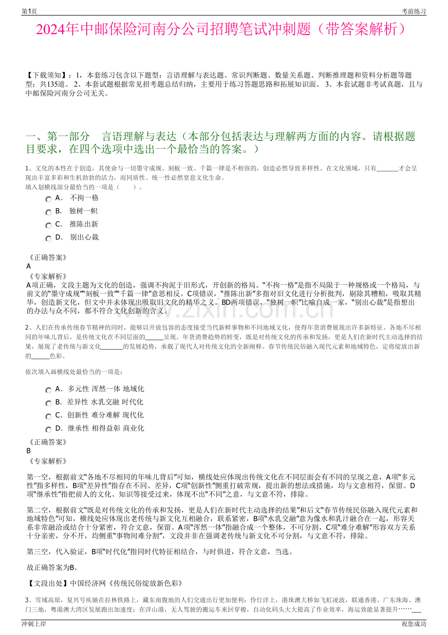 2024年中邮保险河南分公司招聘笔试冲刺题(带答案解析)【下载须知】:1,本套练习包含以下题型:言语理解与表达题、常识判断题、数量关系题、判断推理题和资料分析题等题型;共135道。2、本套试题根据常见招考题总结归纳,主要用于练习答题思路和拓展知识面。3、本套试题非考试真题,且与中邮保险河南分公司无关。一、第一部分言语理解与表达(本部分包括表达与理解两方面的内容。请根据题目要求,在四个选项中选出一个最恰当的答案。)1、文化的本性在于创造,其使命与一切墨守成规、刻板一致、千篇一律是不相容的,创造必然导致多样性。在文化领域,只有_才会呈现出丰富多彩和生机勃勃的活力,而同质性、统一性必然窒息文化生命。填入划横线部分最恰当的一项是()。A 不拘一格 B 独树一帜 C 推陈出新 D 别出心裁正确答案A专家解析A项正确,文段主题为文化的创造,强调不拘泥于旧形式,开创新的格局。“不拘一格”是指不局限于一种规格或一个格局,与前文的“墨守成规”“刻板一致”“千篇一律”意思相反。C项错误,“推陈出新”多指对旧文化进行分析批判,剔除其糟粕,吸取其精华,创造新文化,但文中并未体现出吸取旧文化的精华之义。BD两项错误,“独树一帜”比喻自成一家,“别出心裁”是指想出的办法与众不同,都不符合文化创新的含义。2、人们在传承传统春节精神的同时,能够以开放包容的态度接受当代新鲜事物和不同地域文化,使得年货消费展现出许多新特征。各地不尽相同的年味儿背后,是传统文化在不同层面的 呈现。年货消费趋势的转变,既是对传统文化的传承和发扬,更是人们在新时代主动选择的结果,展现了老传统与新文化 的发展趋势,承载了现代人对传统文化的全新阐释。春节传统民俗融入现代元素和地域特色,定将绽放出新的 色彩。依次填入画横线处最恰当的一项是:A多元性 浑然一体 地域化 B差异性 水乳交融 时代化 C创新性 难分难解 现代化 D继承性 相得益彰 商业化正确答案B专家解析第一空,根据前文“各地不尽相同的年味儿背后”可知,横线处应体现出传统文化在不同层面会有不同的呈现之意,A项“多元性”指多样性,B项“差异性”指存在不同、差异,C项“创新性”侧重打破常规,提出新的想法或措施,均与文意相符,保留。D项“继承性”指把前人的文化、知识等接受过来,体现不出“不同”之意,与文意不符,排除。第二空,根据前文“既是对传统文化的传承和发扬,更是人们在新时代主动选择的结果”和后文“春节传统民俗融入现代元素和地域特色”可知,横线处应体现出老传统与新文化互相融合,联系紧密,B项“水乳交融”意为像水和乳汁融合在一起,形容关系非常融洽或结合十分紧密,符合文意,保留。A项“浑然一体”指融合成一个整体,不可分割,C项“难分难解”形容双方关系十分亲密,分不开,均侧重“事物间难分割”,文段并非在强调老传统与新文化不可分割,与文意不符,排除。第三空,代入验证,B项“时代化”指同时代特征相结合,与时俱进,符合文意,当选。故正确答案为B。【文段出处】中国经济网传统民俗绽放新色彩3、雪域高原,复兴号疾驰在拉林铁路上,藏东南腹地的人们交通出行更加便利;伶仃洋上,港珠澳大桥如飞虹凌波,联通香港、广东珠海、澳门三地,粤港澳大湾区发展跑出加速度;在洋山港,无人驾驶的搬运车来回穿梭,自动化码头大大提高了作业效率,海运效能显著提升 第1页考前练习冲刺上岸祝您成功 ,成为我国交通运输事业取得历史性成就、发生历史性变革的一个生动写照。填入划横线部分最恰当的一项是:A放眼神州大地,交通网络内畅外联,涌动着发展的活力 B交通运输业也在全球抗疫、贸易复苏等方面发挥了积极作用 C我国坚持交通先行,迎来由交通大国向交通强国的历史性跨越 D建成立体交通网,连通城乡,连接四面八方,便利人民群众出行正确答案A专家解析横线出现在文段中间,需结合上下文内容进行分析。文段开篇通过并列分句列举了雪域高原、伶仃洋、洋山港的例子,其中雪域高原的例子强调交通的畅达使得人们出行更加便利,伶仃洋和洋山港的例子则强调交通的发展,联通了大陆与域外,且“跑出加速度”“提高了作业效率,海运效能显著提升”进一步突出了交通对于各项发展的带动作用,横线后论述这些案例成为我国交通运输事业取得历史性成就、发生历史性变革的生动写照,故横线处所填语句,重在对上文进行概括,强调我国交通事业的发展,不仅使得国内与国外畅通联动,更为发展提供了助力,对应A项。B项,文段并未提及“全球抗疫”“贸易复苏”,无中生有,排除;C项,文段中并未提及“交通先行”,无中生有,且未能突出我国交通的便利以及对发展的积极影响,偏离前文中心,排除;D项,“便利人民群众出行”仅能对应文段中“雪域高原”这一部分内容,表述片面,排除。故正确答案为A。【文段出处】人民日报建设交通强国,发挥现代化开路先锋作用强国之路正扬帆4、填入下面横线处的句子,与上下文衔接最恰当的一组是()。我独坐在书斋中,忘记了尘世间一切不愉快的事情,怡然自得。以世界之广,宇宙之大,此时却仿佛只有我和我的书友存在。_,_,_,_。阳光照在玉兰花的肥大的绿叶子上连平常我喜欢听的鸟鸣声“光棍好过”,也听而不闻了窗外粼粼碧水,丝丝垂柳这都是我平常最