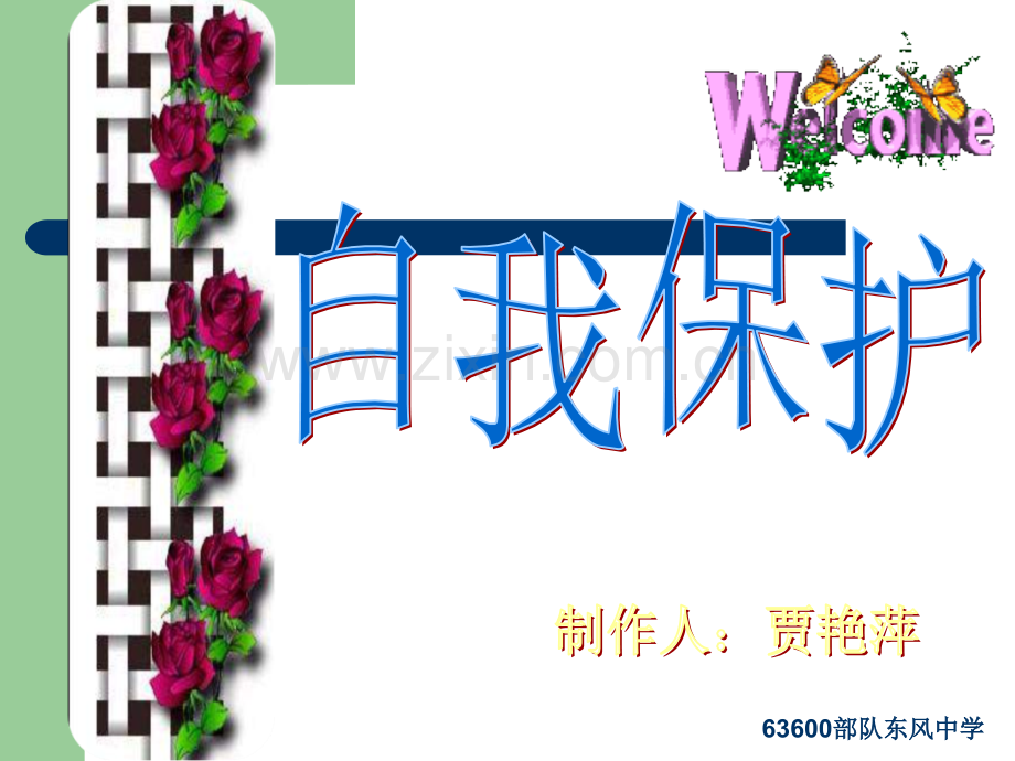 63600部队东风中学部队东风中学 教教学学目目标标(一)情感、(一)情感、态度和价度和价值观目目标l学学会会依依靠靠家家庭庭、学学校校和和社社会会保保护自自己己,树立立自我保自我保护的意的意识、勇气和信心。、勇气和信心。l能能够树立立依依法法维权意意识,增增强学学法法用用法法的的主主动性。性。(二)知(二)知识与技能目与技能目标l使使学学生生了了解解在在日日常常生生活活中中自自我我保保护的的方方法法和和技能。技能。l知知道道我我国国为保保护青青少少年年的的健健康康成成长专门制制定定了相关法了相关法规。(三)(三)过程与方法目程与方法目标l学会运用有效方法,逐步形成自我保学会运用有效方法,逐步形成自我保护能力。能力。l初初步步形形成成用用法法律律武武器器保保护自自身身合合法法权益益的的意意识。l重重点点:提提高高防防范范侵侵害害、保保护自自己己的的意意识,掌握保,掌握保护自己的方法和技巧。自己的方法和技巧。l难点点:增增强自自我我保保护的的勇勇气气和和信信心心,在在实践践中中学学会会有有效效的的运运用用自自我我保保护的的方法和技巧,形成自我保方法和技巧,形成自我保护的能力。的能力。掌掌握握运运用用保保护自自己己的的方方法法和和技技巧巧既是重点,又是既是重点,又是难点。点。重重点点难难点点学会求救和自救学会求救和自救善于运用法律武器善于运用法律武器远离危离危险,拒,拒绝侵害侵害第一第一课时第二第二课时自自我我保保护护“网交网交”情情景景:通通过上上网网聊聊天天,小小燕燕认识了了网网友友小小Q,他他们在在很很多多问题上上观点点一一致致,小小燕燕视小小Q为知知己己。当当小小Q向向小小燕燕介介绍自自己己的的“真真实身身份份”和和基基本本情情况况后后,小小燕燕也也毫毫不不保保留留地地把把姓姓名名、学学校校、家家庭庭电话等等真真实信信息息告告诉了了他他。不不久久,小小燕燕家被盗,而作案者正是小家被盗,而作案者正是小Q。面面对小燕家被盗,你有何想法?小燕家被盗,你有何想法?(一)远离危险拒绝侵害(一)远离危险拒绝侵害“匿名交友网上多,切莫透露真信息。匿名交友网上多,切莫透露真信息。网上人品网上人品难区分,小心区分,小心谨慎没有慎没有错。”如此如此“散心散心”小小燕燕心心情情差差极极了了,她她穿穿上上了了新新买的的吊吊带衫衫和和心心爱的的超超短短裙裙,决决定定独独自自出出远门去去姥姥姥姥家家过暑暑假假。站站在在这座座陌陌生生城城市市的的十十字字路路口口,小小燕燕放放下下旅旅行行包包,四四处张望望。这时,一一辆风驰电掣掣的的摩摩托托车停停在在她她身身旁旁,车上上的的男男青青年年问:“我我可可以以帮帮你你吗?”小小燕燕怯怯生生生生地地问:“请问人人民民路路怎怎么么走走?”“正正好好同同路路,我我送送你你。”男男青青年年拿拿起起小小燕燕的的旅旅行行包包,给了了她她一一个个头盔盔。摩摩托托车载着小燕着小燕驶向前方向前方小燕有小燕有错吗?她会安全到姥姥家?她会安全到姥姥家吗?(一)远离危险拒绝侵害(一)远离危险拒绝侵害安全直通安全直通车 凯文文中中国国习武武记:话说小小凯文文在在好好莱莱坞发展展,突突然然有有一一天天看看到到李李连杰杰主主演演的的霍霍元元甲甲这部部影影片片,于于是是迷迷上上了了中中国国功功夫夫,不不远万万里里来来到到中中国国学学习中中华武武术,他他在在互互联网网上看到了上看到了这样一一则广告:广告:为了了弘弘扬中中华武武术精精神神、发现武武术苗苗子子,使使中中华武武术走走向向世世界界,发扬光光大大,本本校校面面向向世世界界招招收收富富有有天天资的的青青少少年年武武术爱好者若干名,聘好者若干名,聘请少林寺武少林寺武术高僧高僧领衔执教。教。报名条件:年名条件:年龄14岁以下,身体健康,以下,身体健康,发育健全。育健全。报名名时间:本日起即可:本日起即可报名。名。联系系电话:138*联 系系 人:李先生人:李先生 为了了潜潜心心练武武,防防止止世世俗俗干干扰,请独独自自一一人人前前来来报名名,我我们会以适当的方式通知你的家会以适当的方式通知你的家长。(二)学会求救和自救(二)学会求救和自救故故事事续一一:有有句句话叫叫当当局局者者迷迷,旁旁观者者清清。对武武术的的痴痴迷迷和和对李李连杰杰的的崇崇拜拜,使使小小凯文文冲冲昏昏了了头脑,盲盲目目代代替替了了理理智智。虽然然他他也也有有点点怀疑疑,但但他他还是是想想去去试一一试。他他拨通通了了电话,来来到到了了对方方指指定定的的地地点点。这是是位位于于郊郊区区的的一一间小小平平房房。透透过房房门,他他看看到到一一个个肌肌肉肉发达达的的彪彪形形大大汉正正在在练功功,他他不不禁禁轻轻地地叫叫出出声声:Wonderful!这就就是是我我要要找找的的武武术家家。于于是是,他踏他踏进了了门槛 医医“病病”切身体切身体验?预想后果想后果(二)学会求救和自救(二)学会求救和自救故故事事续二二:小小凯文文一一进门,立立即即被被人人用用橡橡皮皮膏膏封封住住了了嘴嘴巴巴,另另一一个个人人还想想用用绳子子将将其其捆捆住住