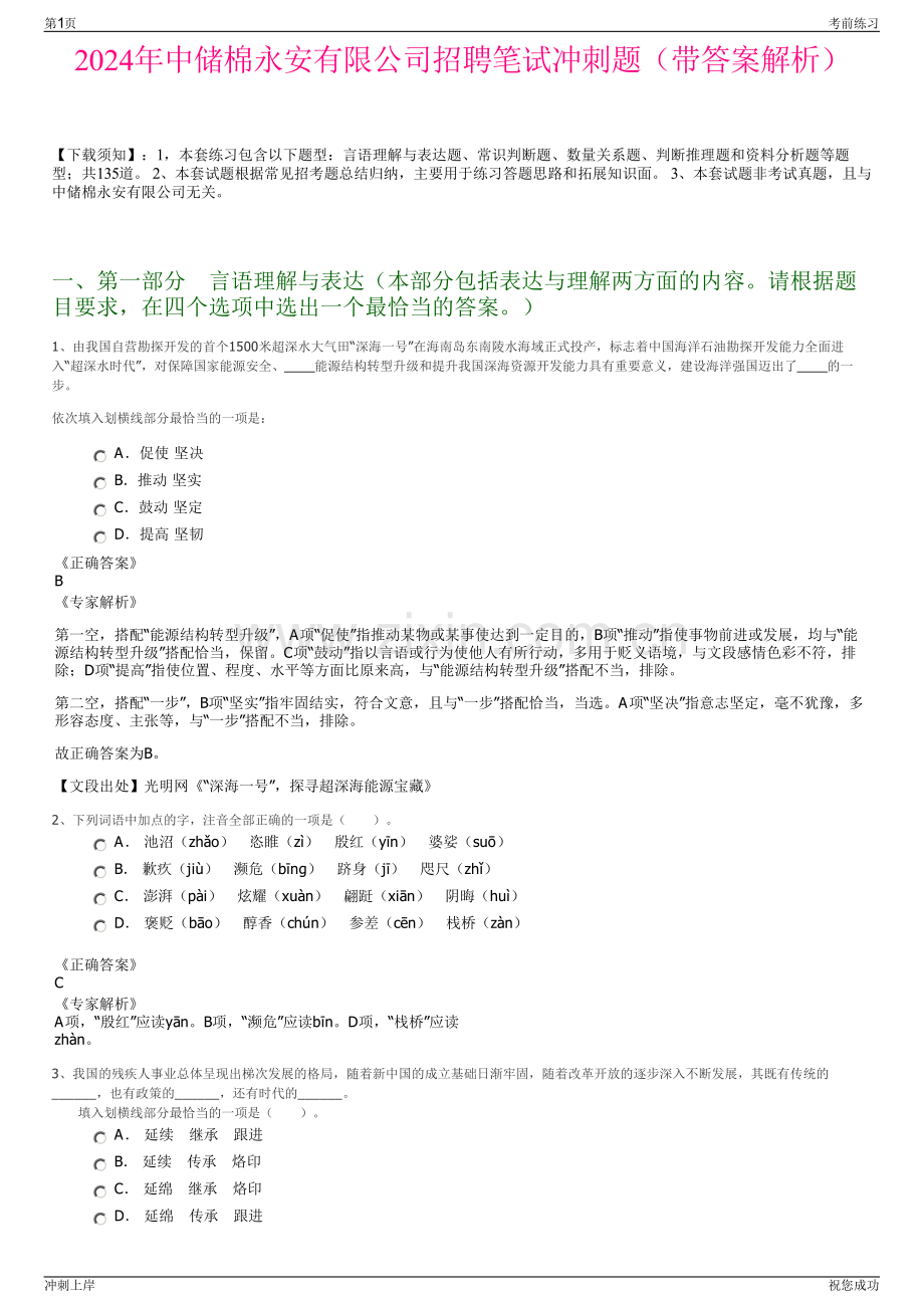 2024年中储棉永安有限公司招聘笔试冲刺题(带答案解析)【下载须知】:1,本套练习包含以下题型:言语理解与表达题、常识判断题、数量关系题、判断推理题和资料分析题等题型;共135道。2、本套试题根据常见招考题总结归纳,主要用于练习答题思路和拓展知识面。3、本套试题非考试真题,且与中储棉永安有限公司无关。一、第一部分言语理解与表达(本部分包括表达与理解两方面的内容。请根据题目要求,在四个选项中选出一个最恰当的答案。)1、由我国自营勘探开发的首个1500米超深水大气田“深海一号”在海南岛东南陵水海域正式投产,标志着中国海洋石油勘探开发能力全面进入“超深水时代”,对保障国家能源安全、能源结构转型升级和提升我国深海资源开发能力具有重要意义,建设海洋强国迈出了 的一步。依次填入划横线部分最恰当的一项是:A促使 坚决 B推动 坚实 C鼓动 坚定 D提高 坚韧正确答案B专家解析第一空,搭配“能源结构转型升级”,A项“促使”指推动某物或某事使达到一定目的,B项“推动”指使事物前进或发展,均与“能源结构转型升级”搭配恰当,保留。C项“鼓动”指以言语或行为使他人有所行动,多用于贬义语境,与文段感情色彩不符,排除;D项“提高”指使位置、程度、水平等方面比原来高,与“能源结构转型升级”搭配不当,排除。第二空,搭配“一步”,B项“坚实”指牢固结实,符合文意,且与“一步”搭配恰当,当选。A项“坚决”指意志坚定,毫不犹豫,多形容态度、主张等,与“一步”搭配不当,排除。故正确答案为B。【文段出处】光明网“深海一号”,探寻超深海能源宝藏2、下列词语中加点的字,注音全部正确的一项是()。A 池沼(zho)恣睢(z)殷红(yn)婆娑(su)B 歉疚(ji)濒危(bng)跻身(j)咫尺(zh)C 澎湃(pi)炫耀(xun)翩跹(xin)阴晦(hu)D 褒贬(bo)醇香(chn)参差(cn)栈桥(zn)正确答案C专家解析A项,“殷红”应读yn。B项,“濒危”应读bn。D项,“栈桥”应读zhn。3、我国的残疾人事业总体呈现出梯次发展的格局,随着新中国的成立基础日渐牢固,随着改革开放的逐步深入不断发展,其既有传统的_,也有政策的_,还有时代的_。填入划横线部分最恰当的一项是()。A 延续继承跟进 B 延续传承烙印 C 延绵继承烙印 D 延绵传承跟进第1页考前练习冲刺上岸祝您成功正确答案D专家解析第一空,“延续”是指照原来的样子继续下去,“延绵”是指绵延伸展。残疾人事业的发展,既继承了传统,是传统的延伸,但又不完全是原来传统的样子,故“延绵”更符合题意。第二空,“继承”是指按照法律或遵照遗嘱接受死者的财产、职务、头衔、地位等,其主体是人;“传承”是指延续、连贯,故“传承”更符合语境。第三空,从句子的一致性看,“延绵”“传承”都是动词,而“烙印”是名词,从词性角度来说应选“跟进”。因此D项正确。4、我们喜欢向他人分享目标,好像寻求某种认可和鼓励,然而分享会给人一种 的满足感,将空谈错认为 。记下你的目标,制定可行的计划,才更可能成功。依次填入画横线部分最恰当的一项是:A想象 目的 B即时 结果 C暂时 事实 D虚假 实践正确答案D专家解析第一空,“然而”表转折,横线前后语义相反,且根据“错认为”可知,横线处应是形容满足感不是真实的,A项“想象”是一种特殊的思维形式;D项“虚假”指假的、不真实的,均符合文意,保留。B项“即时”表示立即、当下,其反义应是缓慢、逐渐;C项“暂时”即临时、短暂,反义词应是永远、长久,均不能构成转折前后语义相反,排除。第二空,“错认为”表示横线处应与“空谈”语义相反,D项“实践”即去做,对应后文“制定可行的计划”,符合文意,当选。A项“目的”指的是奋斗的目标,和“空谈”无法构成反义,排除。故正确答案为D。【文段出处】不要告诉他人自己的目标,成功的可能性更高!5、从“市场体系”到“统一市场”再到“全国统一大市场”,实际就是从建设市场到建设一体化市场,再到建设大市场和强市场。我们的市场人均收入和消费水平低,虽然人口多,但是市场呈现为行政分割状态,因此只是潜在规模大,实际规模并不具有竞争优势。对此,除了要通过深化改革,释放生产力、提升工资水平、分好国民收入这块蛋糕,还要处理好两个重要问题:一是大力纠正导致市场分割的因素;二是加快资本市场化建设,提高财产性收入比重。这是在扩大工资占比条件受限的前提下,迅速做大做强市场的关键。这段文字针对的主要问题是:A行政区域分割和非一体化抑制了有效竞争 B财产性收入在国民收入中的比重还比较低 C我国市场潜在规模优势还未转化为现实优势 D消费需求疲软阻碍了全国统一大市场的形成正确答案C专家解析文段首先指出从“市场体系”到“统一市场”再到“全国统一大市场”的实质,接着指出问题,强调我们的市场潜在规模大,但实际规模并不具有竞争优势,后文给出对策,具体介绍如何做大做强市场。由此可知,文段针对的主要问题是我们的市场潜在规模大而实际并不具有竞争优势,同义替换对应C项。A项,“行政区域分割”是导致问题的原因之一,“非一体化”无中生有,排除;B项,“财产性收入比重比较低”无中生有,且并非文段重点强调的问题,排除;D项,“消费需求疲软”无中生有,排除。故正确答案为C。【文段出处】刘志彪:塑造“有效市场+有为政府”的全国统一大市场6、粤菜