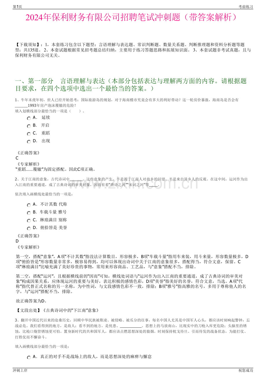 2024年保利财务有限公司招聘笔试冲刺题(带答案解析)【下载须知】:1,本套练习包含以下题型:言语理解与表达题、常识判断题、数量关系题、判断推理题和资料分析题等题型;共135道。2、本套试题根据常见招考题总结归纳,主要用于练习答题思路和拓展知识面。3、本套试题非考试真题,且与保利财务有限公司无关。一、第一部分言语理解与表达(本部分包括表达与理解两方面的内容。请根据题目要求,在四个选项中选出一个最恰当的答案。)1、牛年末虎年初,世人已经开始思考:国际旅游岛的规划,对于海南楼市究竟会有多大的利好带动?这一轮房价暴涨,海南岛是否会有_1993年房产泡沫覆辙的危险?填入划横线部分最恰当的一项是()。A 延续 B 开启 C 重蹈 D 出现正确答案C专家解析“重蹈覆辙”为固定搭配。因此C项正确。2、关于江南的意象,古代诗词中 。这些意象的产生,半是源于江南人对故乡的回望,半是来自异乡人的反观。在这中间,运河作为出入江南的重要通道,成了古典诗词的审美对象,因而有着“唐诗之河”“宋词之河”等 。依次填入画横线处最恰当的一项是:A不计其数 代称 B车载斗量 雅号 C琳琅满目 别称 D俯拾皆是 美誉正确答案D专家解析第一空,搭配“意象”,A项“不计其数”指没法计算数目,形容极多,B项“车载斗量”指用车来装,用斗来量,形容数量极多,D项“俯拾皆是”形容数量非常多,极容易得到,均可以体现出诗词中关于江南的意象很多,搭配得当,符合文意,保留。C项“琳琅满目”比喻充满了美好珍贵的事物,常用来形容商品、工艺品,与“意象”搭配不当,排除。第二空,搭配“运河”,且根据横线前的“因而”可知,横线处词语与“运河作为出入江南的重要通道,成了古典诗词的审美对象”构成因果关系,应体现运河的重要与美好,表达积极的感情色彩,D项“美誉”指美好的名誉,符合文意,当选。A项“代称”指代替正式名称的另一名称,为中性词,与文段感情色彩不一致,排除;B项“雅号”指高雅的名号,多用于尊称他人的名字,与“运河”搭配不当,排除。故正确答案为D。【文段出处】古典诗词中的“下江南”意象3、翻开中国近代以来的沧桑历史,回顾中华民族被欺凌、被侵略、被瓜分的往事,每名中国人尤其是中国军人心头,都应该时刻响起警钟:忘战必危。我们看得到的地方,是敌人;看不到的地方,是忧患。思想上的马放南山,比现实中的刀枪入库更危险;头脑里的锈蚀,比枪口炮管锈蚀更可怕。置身新时代的共和国军人,都应该点燃思想深处的狼烟。时刻保持枕戈待旦、引而待发的战备状态,为能打仗、打胜仗而不懈奋斗。填入画横线部分最恰当的一项是:A真正的对手不是战场上的敌人,而是思想深处的麻痹与懈怠第1页考前练习冲刺上岸祝您成功 B古语有云“忧先于事者,不及于忧;事至而忧者,无及于事”C要来一场“头脑革命”,以奋进的姿态推进新时代的练兵备战 D打仗和准备打仗是军人的天职,忧患意识是其履行天职的根基正确答案A专家解析横线位于文段中间,需结合上下文语境。横线前首先指出“忘战必危”,接着指出看得到的地方是“敌人”,看不到的地方是“忧患”,引出“敌人”和“忧患”的话题。横线后先是通过分号并列强调思想上不重视,即没有“忧患意识”,比现实中的刀枪更危险更可怕,之后通过“应该”引出对策再次强调思想上要常备不懈,故横线处应该体现思想懈怠的危害,对应A项。B项,“忧先于事者,不及于忧;事至而忧者,无及于事”意思是在事前忧虑,事到临头就不会有忧虑;事到临头才忧虑,对事情已经没有任何帮助。仅能对应前文的“忧患”,与后文衔接不当,且体现不出文段强调的“思想”,排除;C项,“以奋进的姿态”与后文衔接不当,后文强调思想上要常备不懈,而非“奋进的姿态”,排除;D项,强调要有“忧患意识”,仅能对应前文的“忧患”,与后文衔接不当,排除。故正确答案为A。【文段出处】强化战斗队思想,“艰难一日”正成为练兵场上的新常态4、应该看到,大部分人选择相信他人并愿意将自身利益、诉求置于陌生人的社会交往活动中,一个重要原因在于有一整套规范的法律制度和法律体系在保护守信人、惩戒失信人。法律制度与法律约束为和谐的社会交往、互信的人际秩序提供了可以依靠、可以遵循、可以坚守的行为规范。法律是构建社会诚信的根本保障,良序的社会需要健全的法治,越是健全的法治越能为美好的社会保驾护航。对这段文字概括最为准确的一项是:A社会信任建设是一个不断强化的过程 B良好的社会信任需要靠法律制度来保障 C多管齐下才能营造诚信友善的社会生态 D信任是社会系统有序运转的重要润滑剂正确答案B专家解析文段首句指出大部分人选择相信他人并愿意在社会交往中将自身利益、诉求置于陌生人的原因在于有规范的法律制度和法律体系在保护守信人、惩戒失信人,接着指出法律制度与法律约束为和谐的社会交往、互信的人际秩序提供了行为规范,尾句指出需要构建健全的法治来保障社会诚信,文段围绕“法律”和“社会”展开,把握主题词“法律”“社会”,对应B项。A项强调社会信任需要不断强化,C项强调需要通过多种方式营造诚信社会,D项强调信任的重要性,均缺少主题词“法律”,表述片面,排除。故正确答案为B。【文段出处】释放诚实守信的正能量5、“。”
